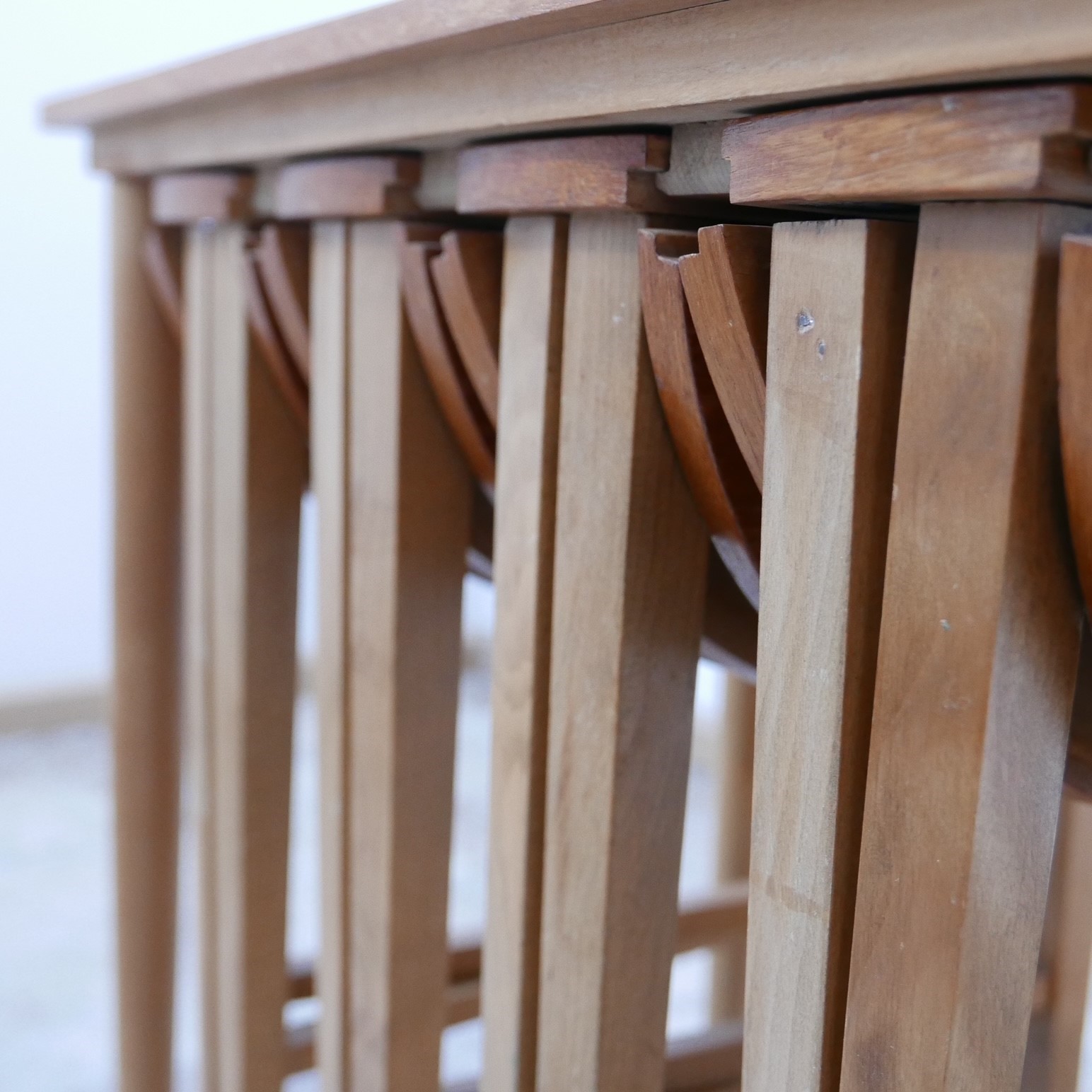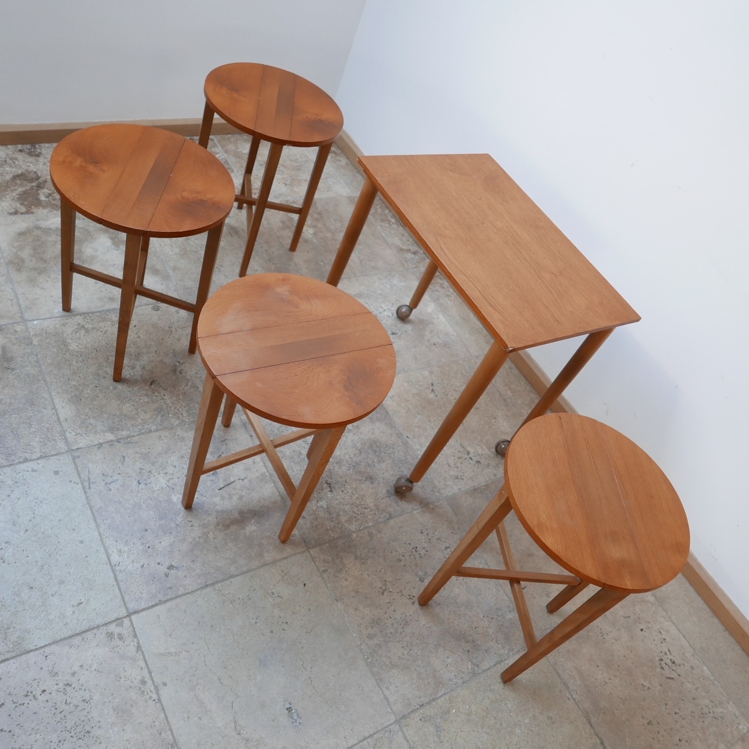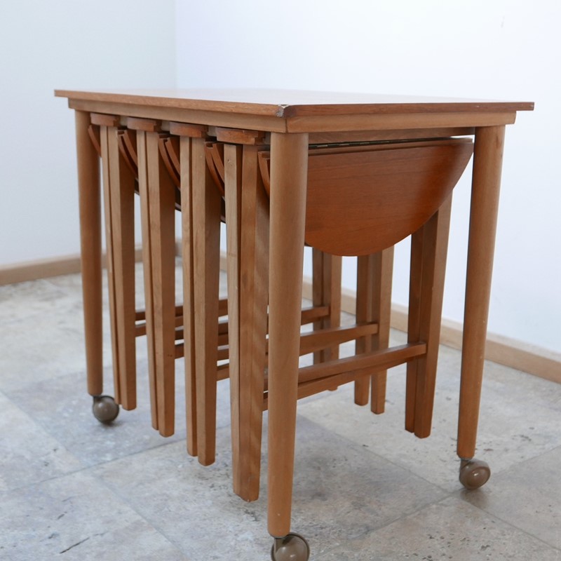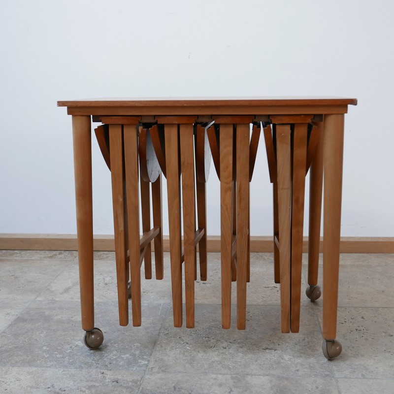 A set of cocktail tables/side tables nesting very cleverly in a larger table. Great fun and functional. Likely English but perhaps Danish, c1950s. Ideally one would remove the fairly horrible wheels but we have left them on as an option for functionality. Good condition generally but some wear commensurate with age,small discolouration, some nicks.