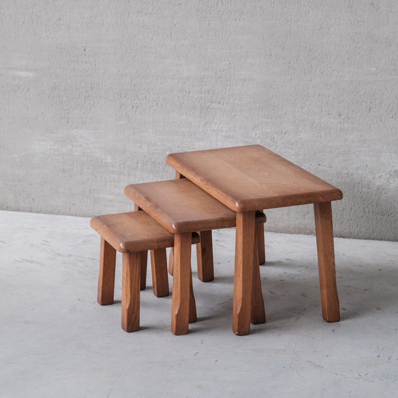 A set of three nesting tables. Belgium, c1970s. Functional as a nesting set or used around the room separately. Oak. Good vintage condition. Any scuffs and scratches will be restored before delivery by our in house team. Dimensions taken for the tallest table. Internal Reference: 6-10-016. Location: Belgium Gallery. Dimensions: 39 H x 60 W x 32 D in cm. Delivery: POA We can ship around the world. Can be transferred to our London or Belgium Gallery.
