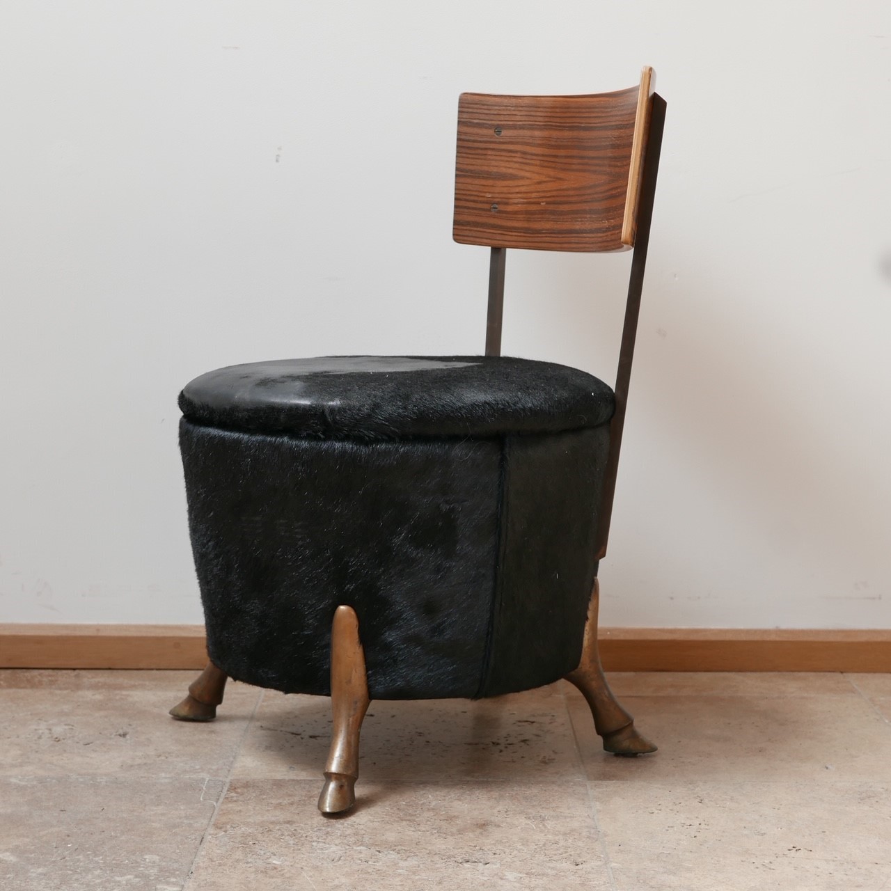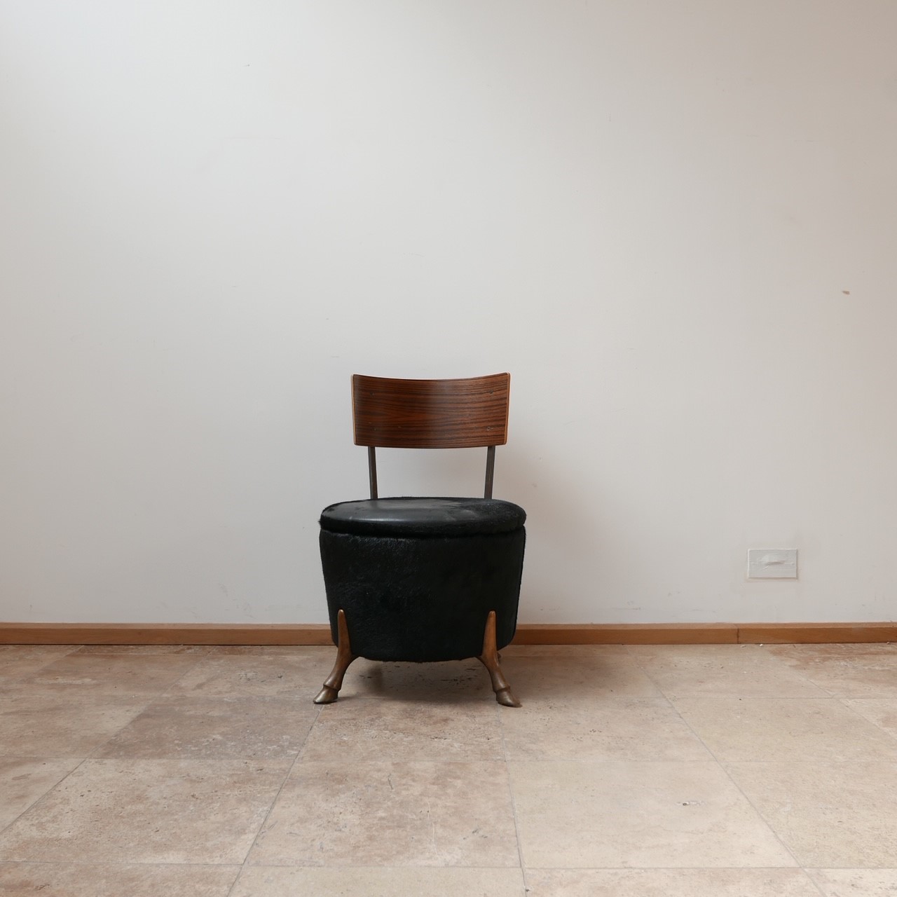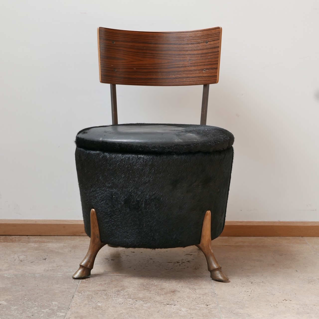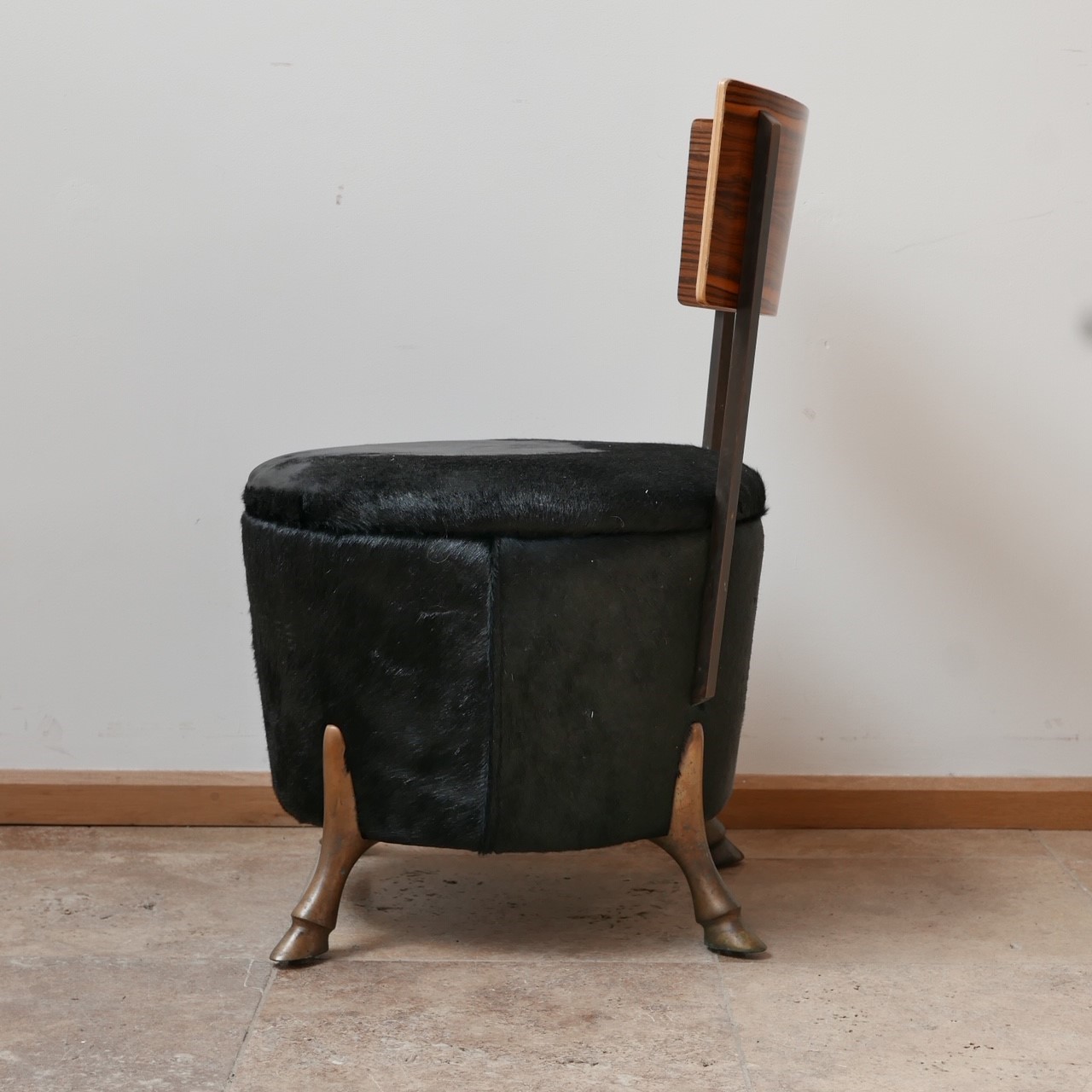 English Single Unusual Mid-Century Bronze Horse Leg Occasional Chair A highly unusual horse legged occasional chair. Perfect as a vanity chair. Covered in a natural material likely horse hide, but lacking in some places (see photos). Could be re-covered, would look great in a shearling. The legs are heavy, as is the chair, and very good quality, they are bronze or brass. The back is veneered wood. Generally good condition, some wear commensurate with age. England, c1980s. Dimensions: 51 W x 57 D x 45 Seat Height x 80 Total Height in cm.