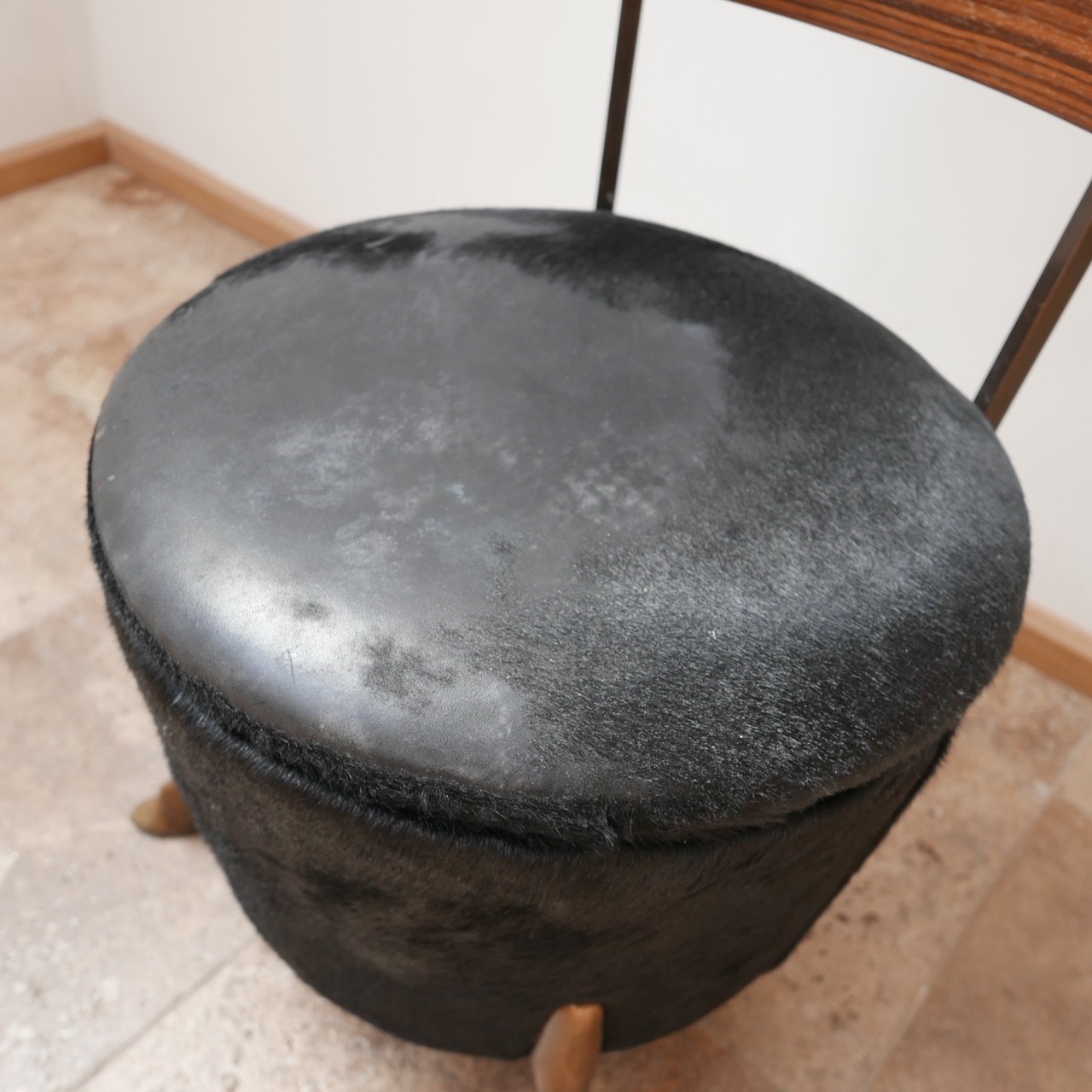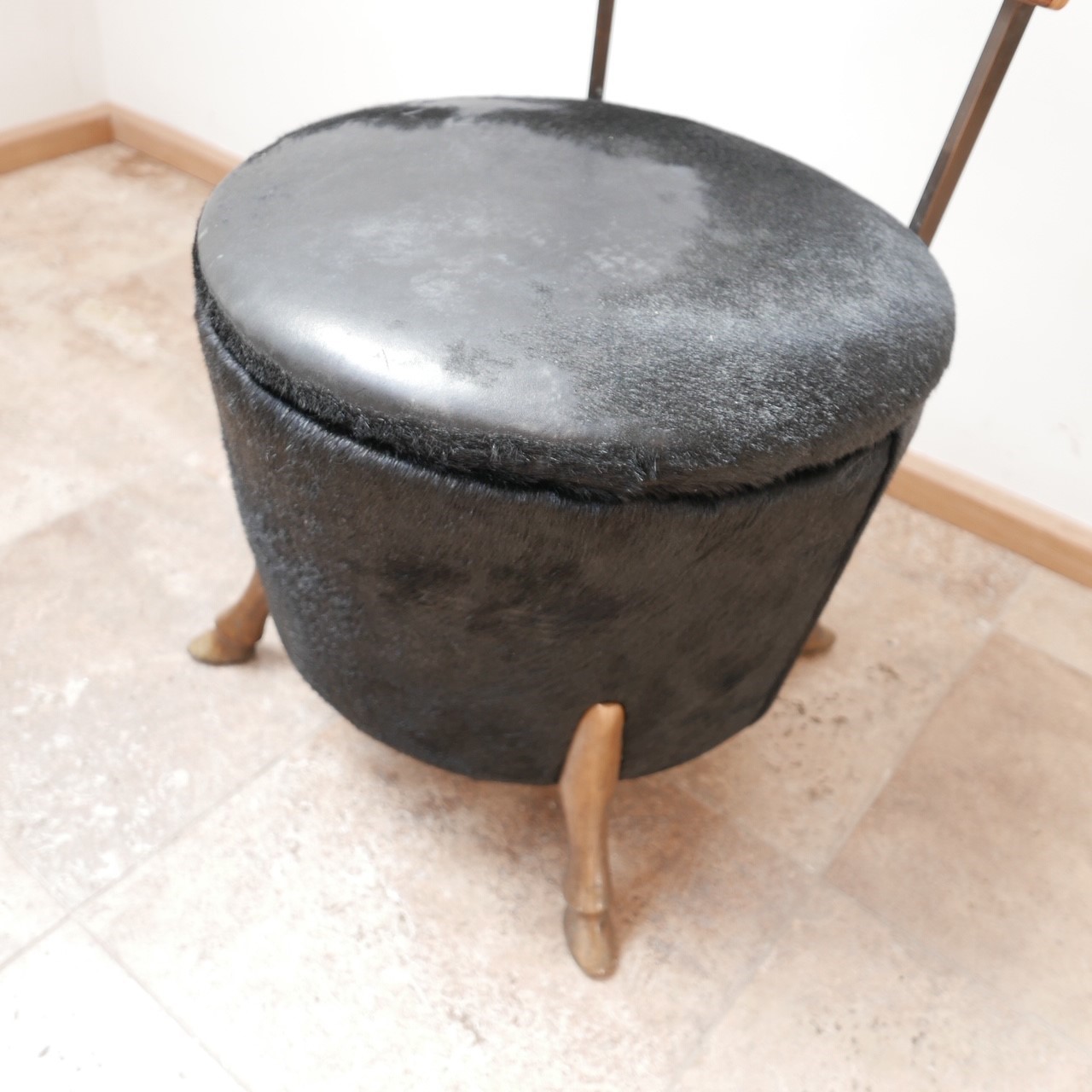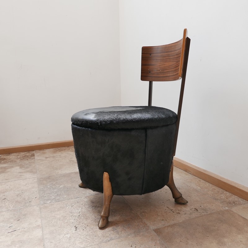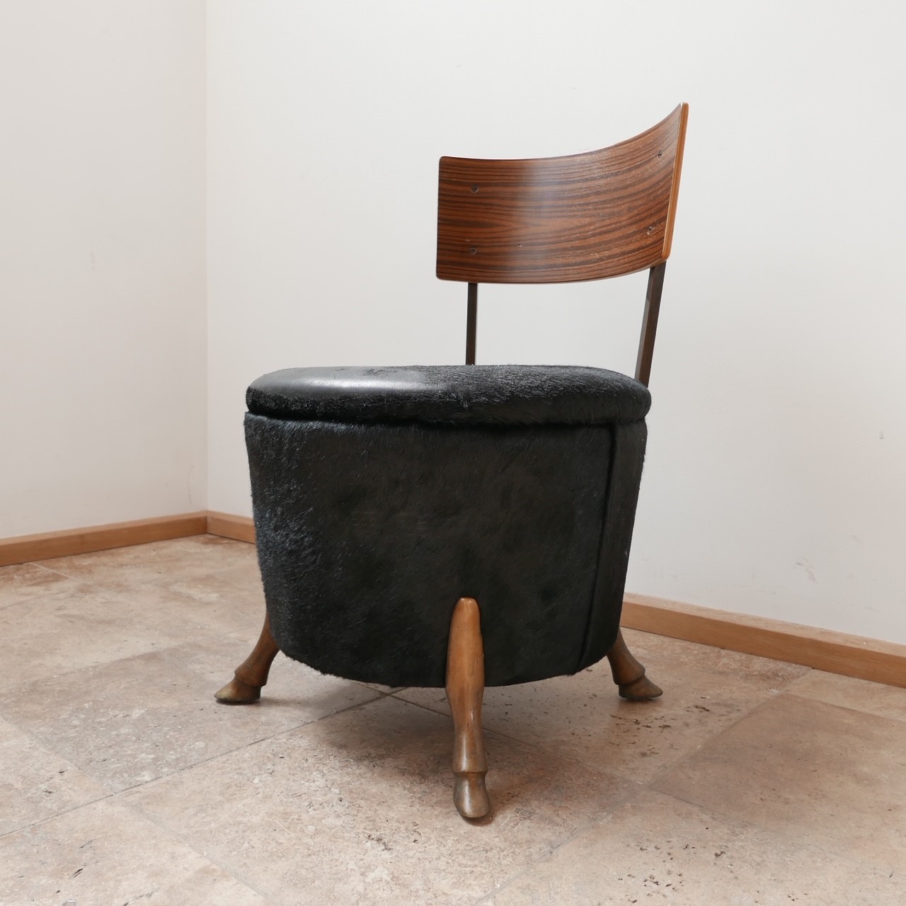 English Single Unusual Mid-Century Bronze Horse Leg Occasional Chair A highly unusual horse legged occasional chair. Perfect as a vanity chair. Covered in a natural material likely horse hide, but lacking in some places (see photos). Could be re-covered, would look great in a shearling. The legs are heavy, as is the chair, and very good quality, they are bronze or brass. The back is veneered wood. Generally good condition, some wear commensurate with age. England, c1980s. Dimensions: 51 W x 57 D x 45 Seat Height x 80 Total Height in cm.