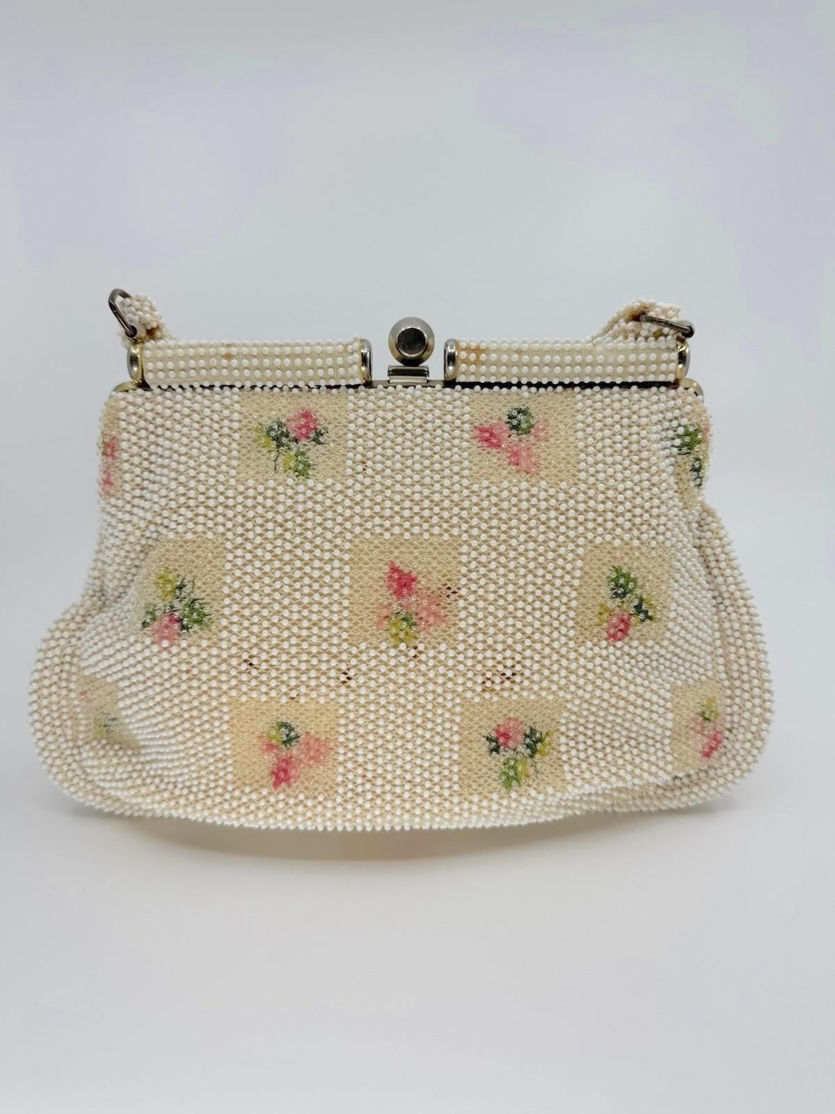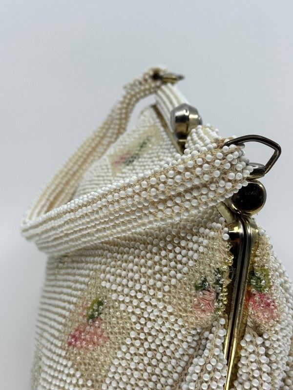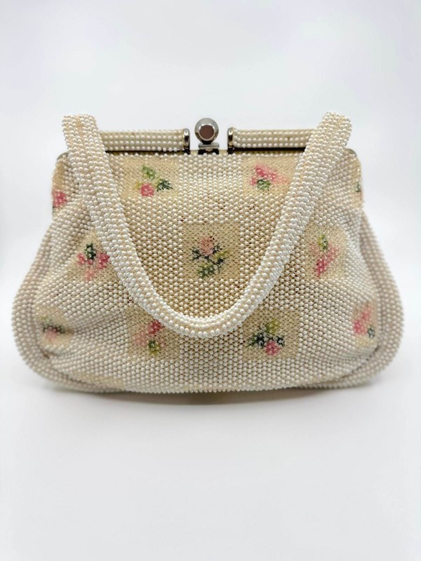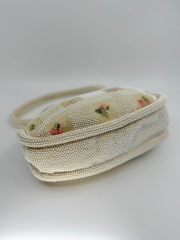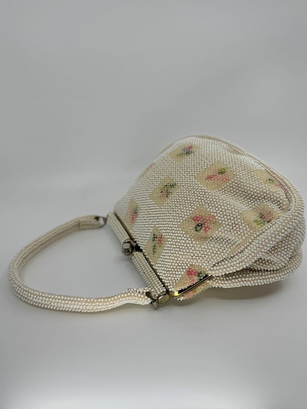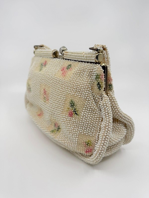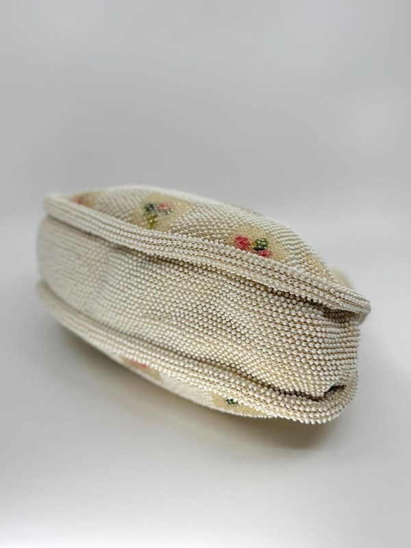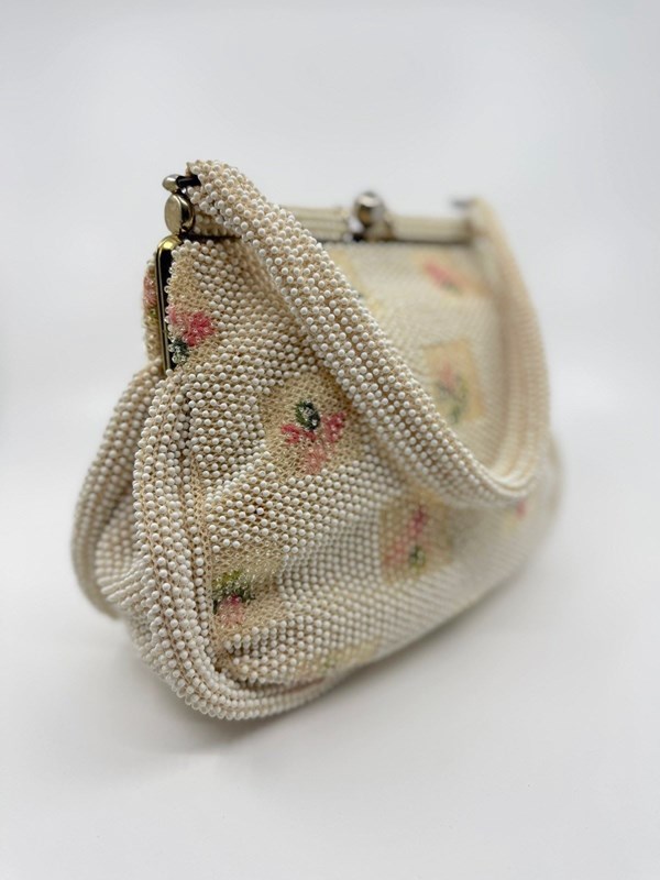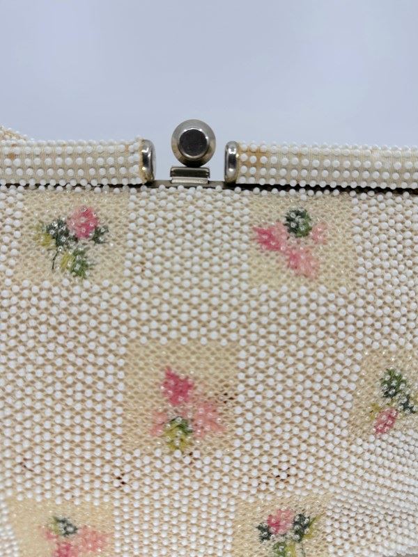A delightful and feminine 1950s Lumured beaded handbag with pretty floral motif highlights in pink and green to contrast with the pale creamy white beads.