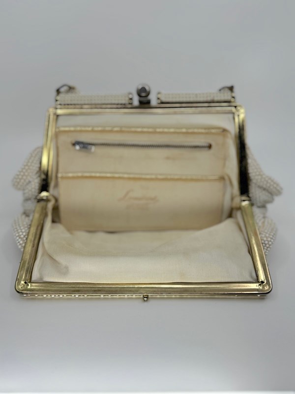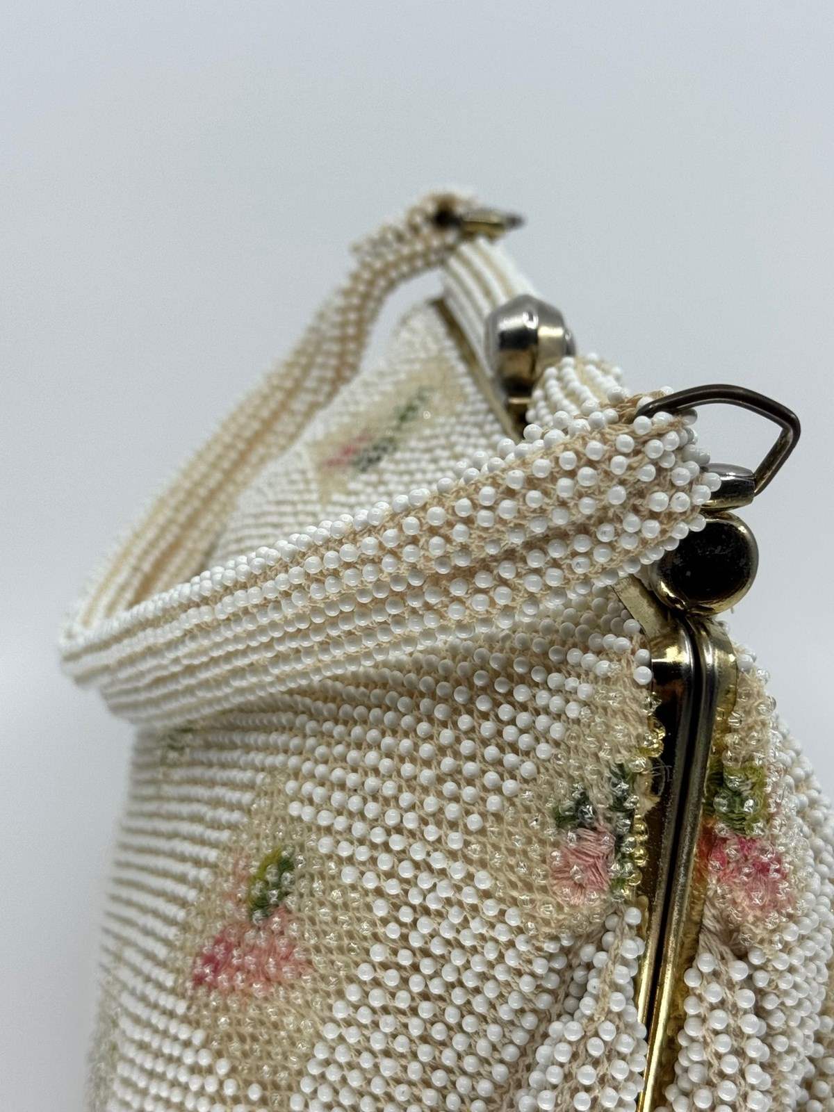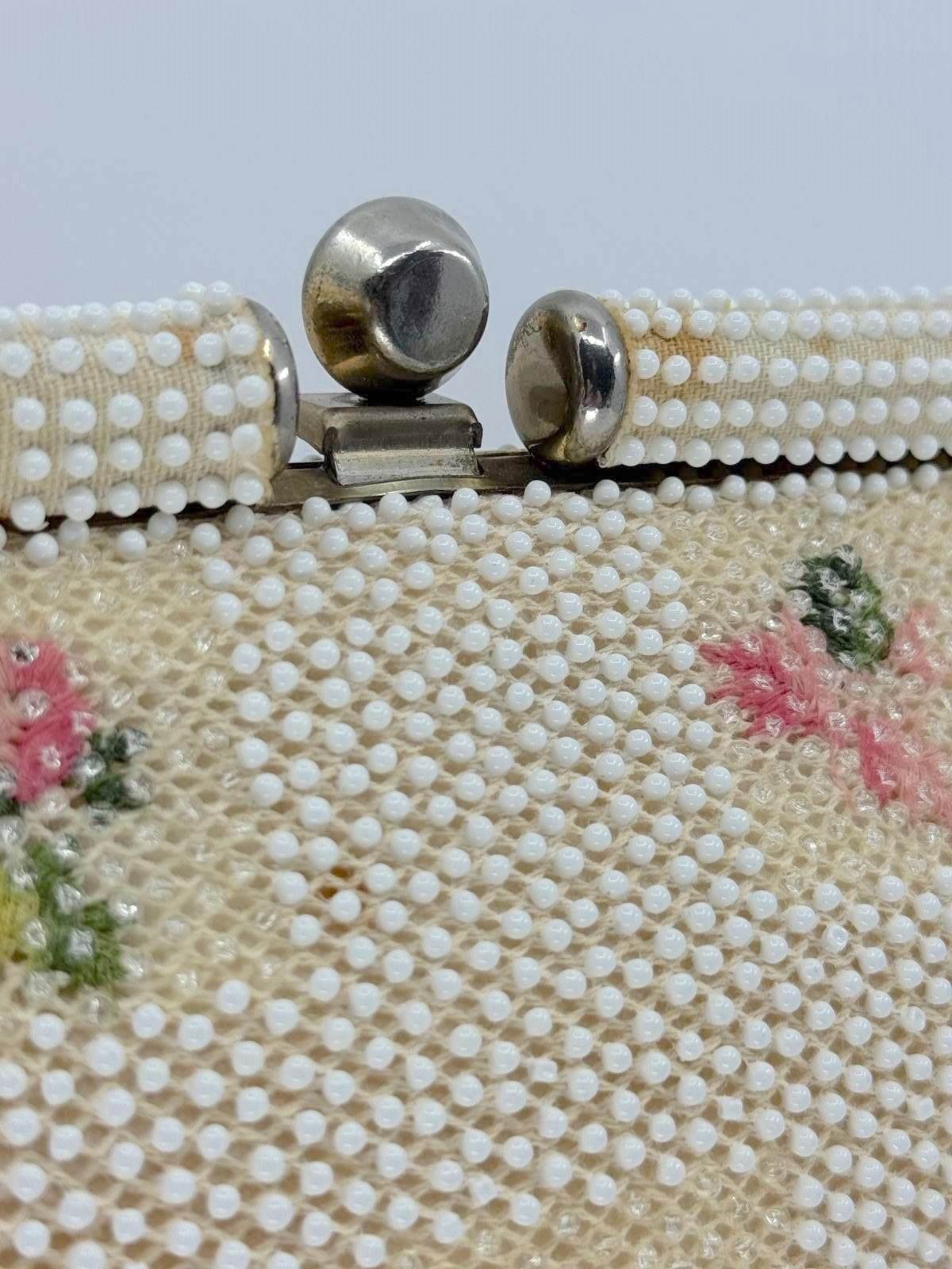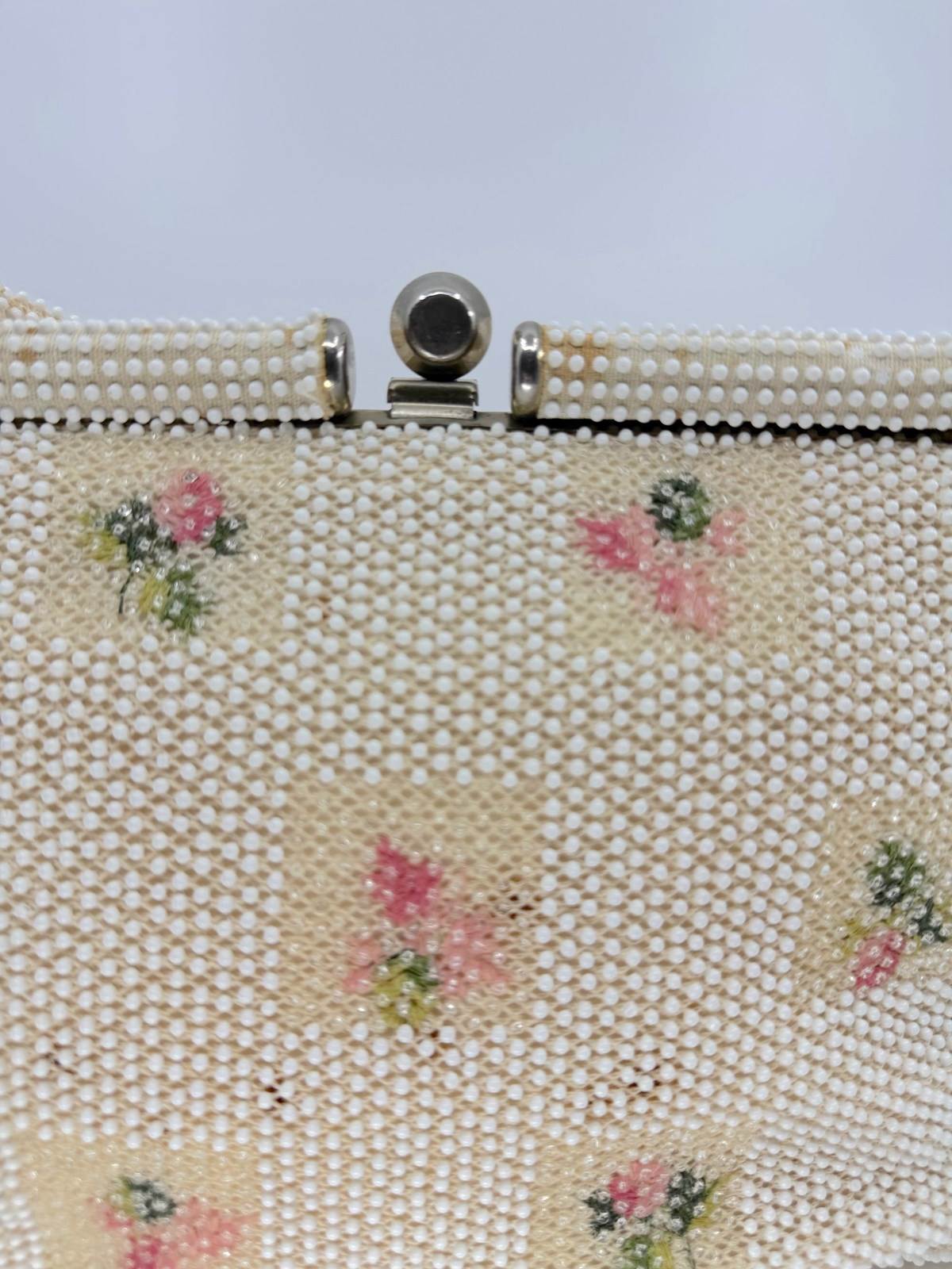 A delightful and feminine 1950s Lumured beaded handbag with pretty floral motif highlights in pink and green to contrast with the pale creamy white beads.