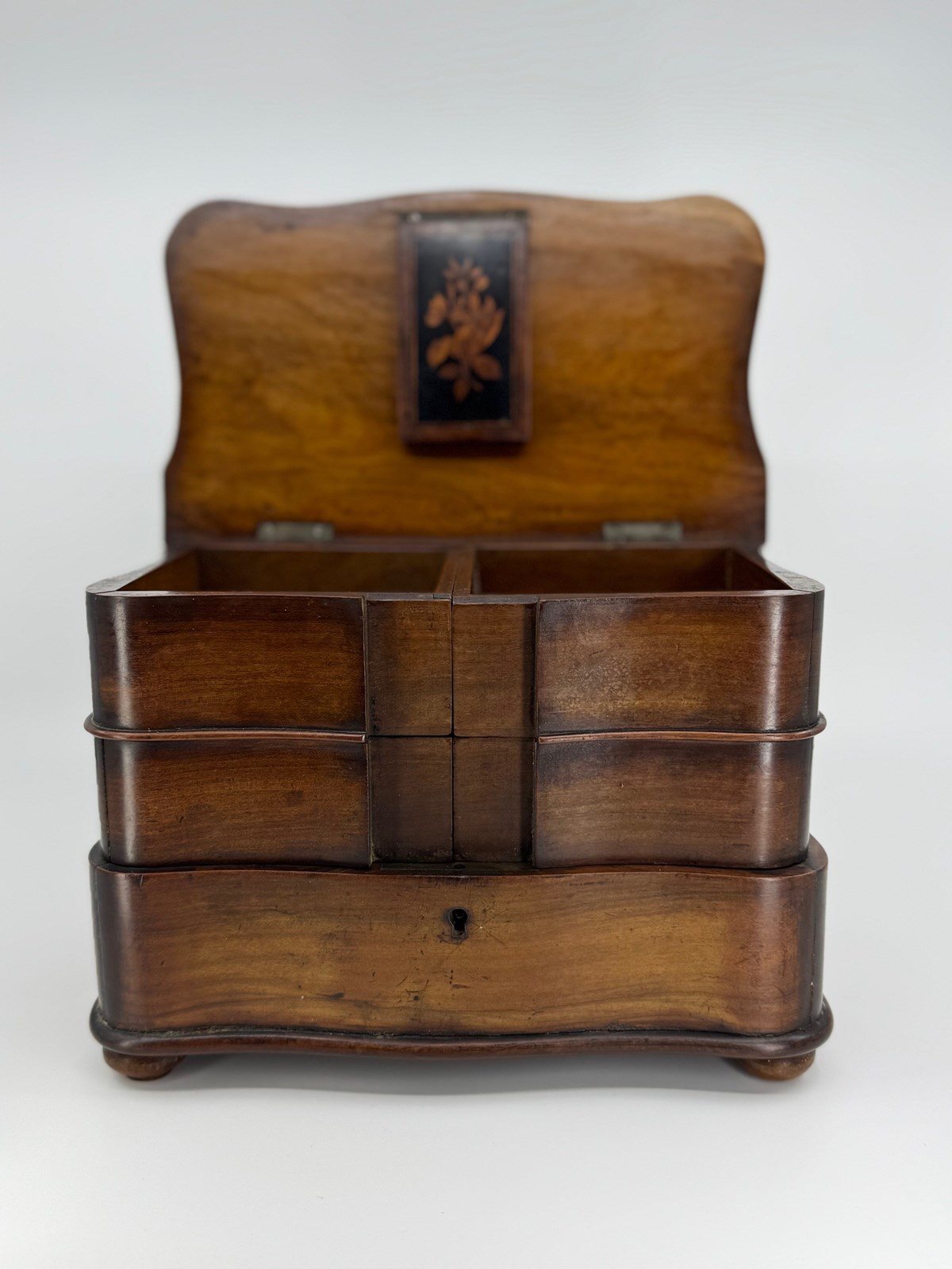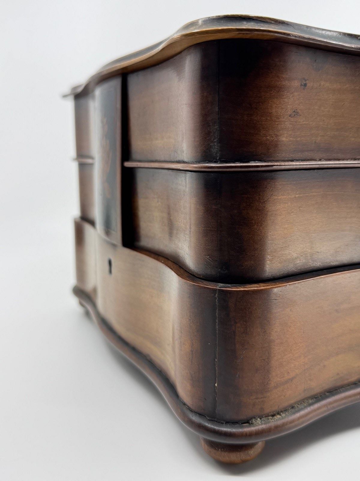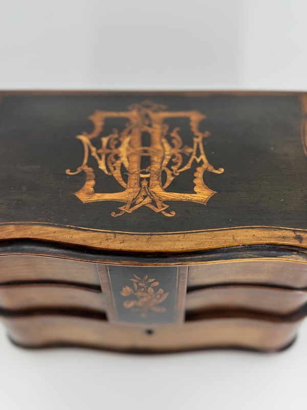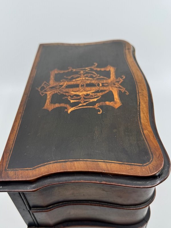 Not just your ordinary box either, but skilfully made with a bow front lower drawer and concave upper drawers and sides. The lid is shaped to mirror the lower sections. The lid has also been ebonised, but with cut outs to reveal a decorative design that incorporates the letters that I think reads NOA. As you open the lid, the central rectangular tab below which keeps the drawers nicely together, and which is also ebonised and decorated with a floral scene, lifts up with it, as it is an integral part. Clever huh!