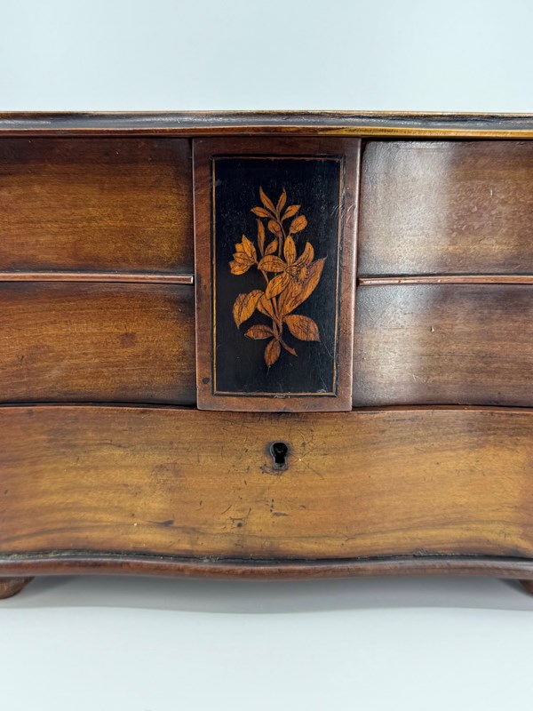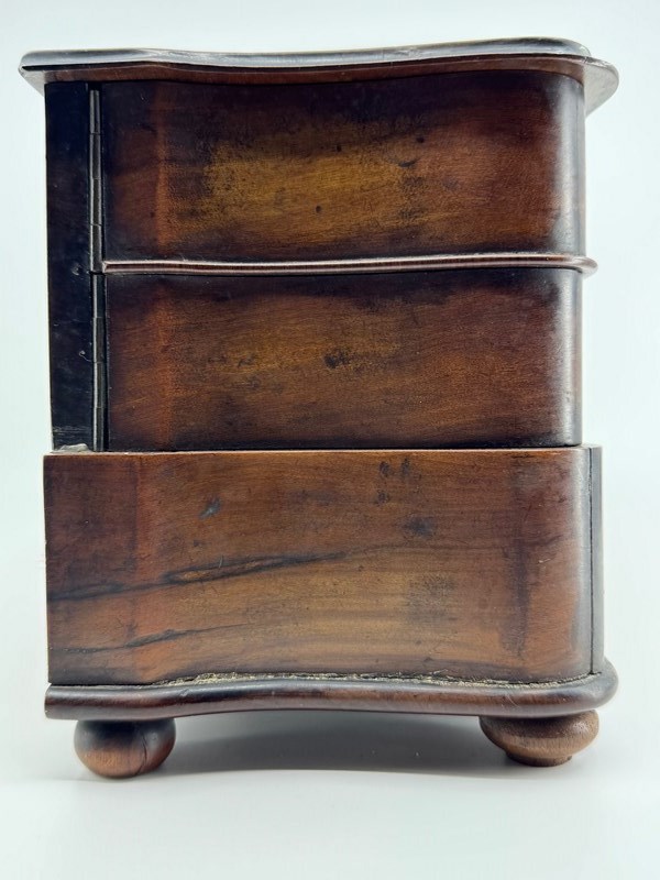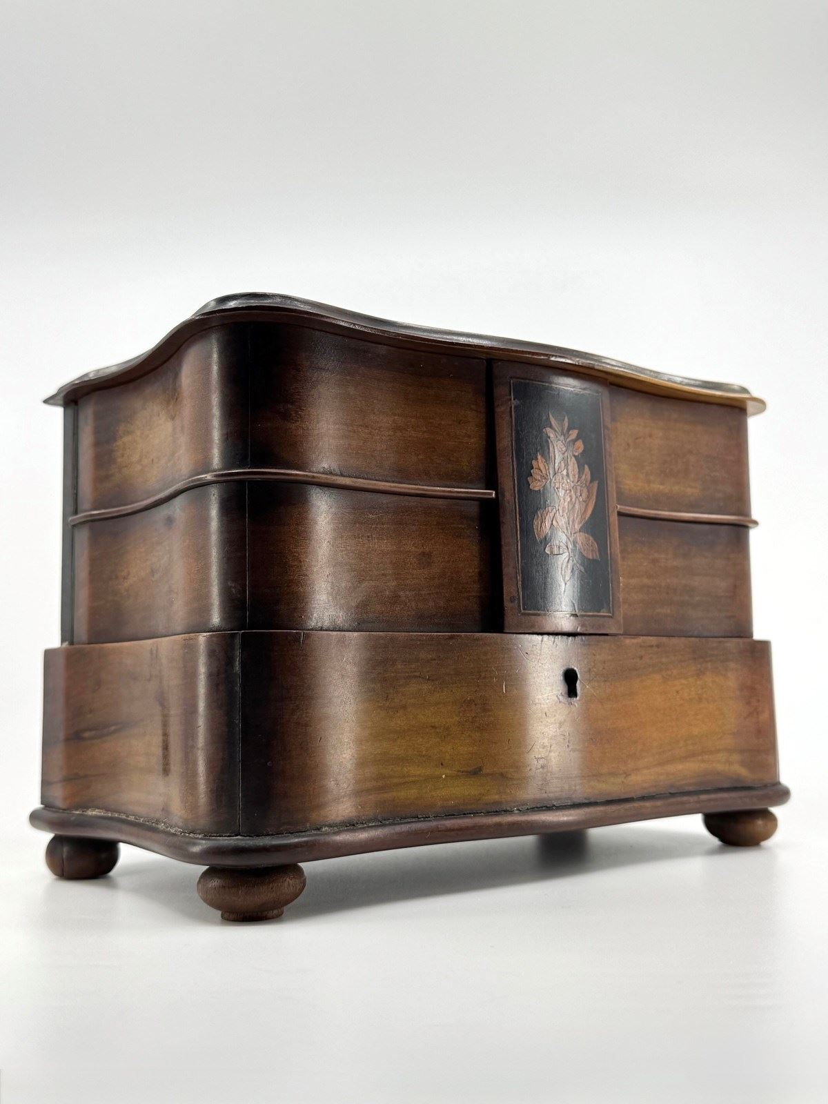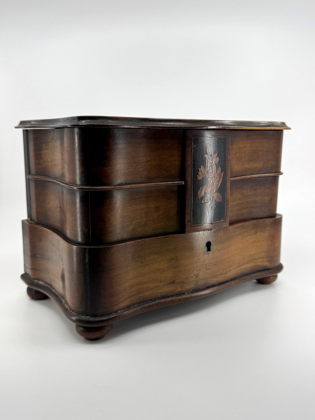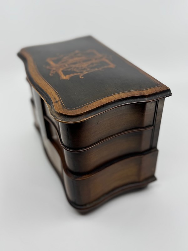 Not just your ordinary box either, but skilfully made with a bow front lower drawer and concave upper drawers and sides. The lid is shaped to mirror the lower sections. The lid has also been ebonised, but with cut outs to reveal a decorative design that incorporates the letters that I think reads NOA. As you open the lid, the central rectangular tab below which keeps the drawers nicely together, and which is also ebonised and decorated with a floral scene, lifts up with it, as it is an integral part. Clever huh!