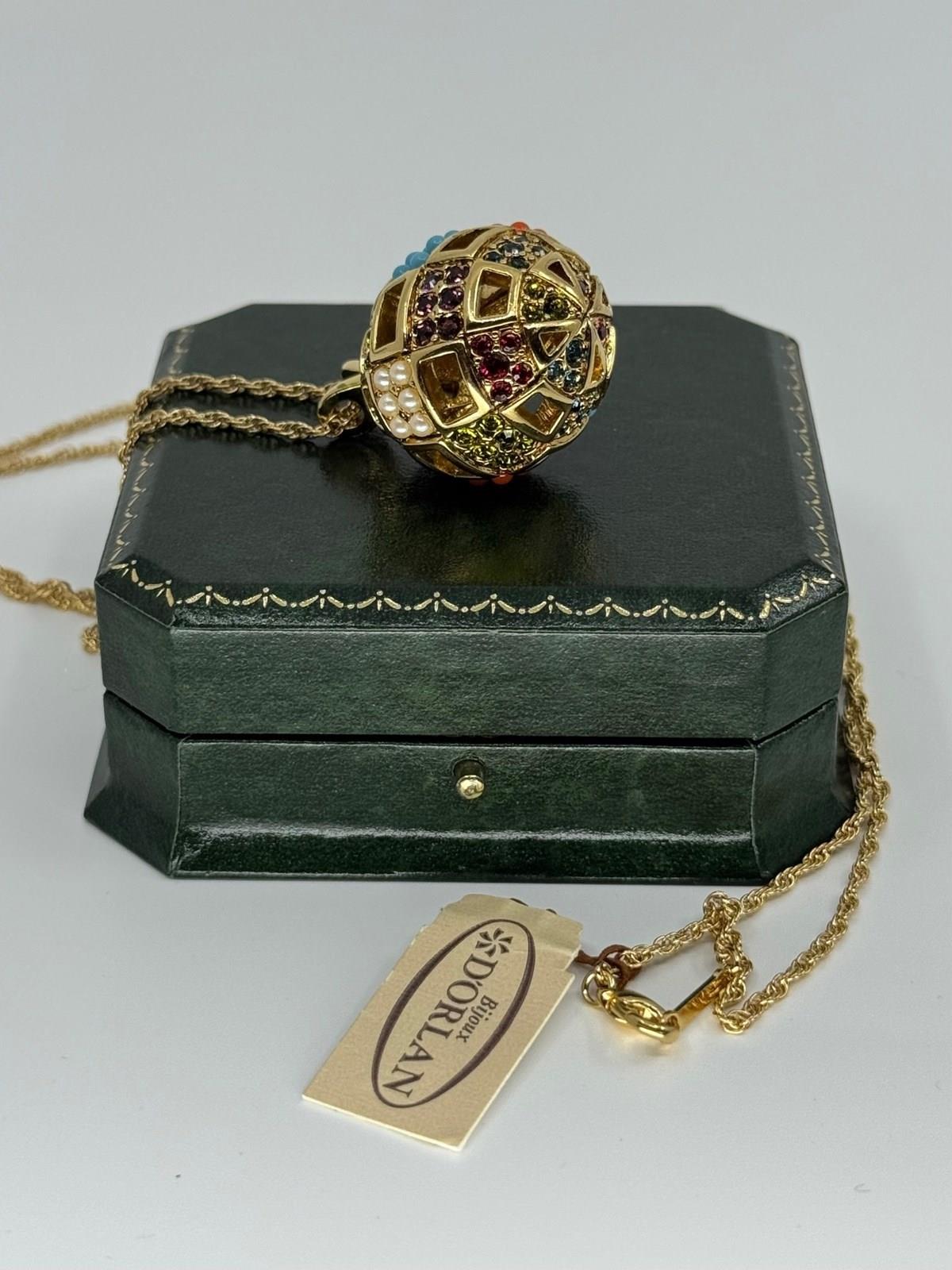 This three dimensional decorative pendant is in excellent condition and is decorated with faux pearl, turquoise and coral cabochons and multi coloured round cut Swarovski crystals, making this a great match for many outfits during the day or evening.