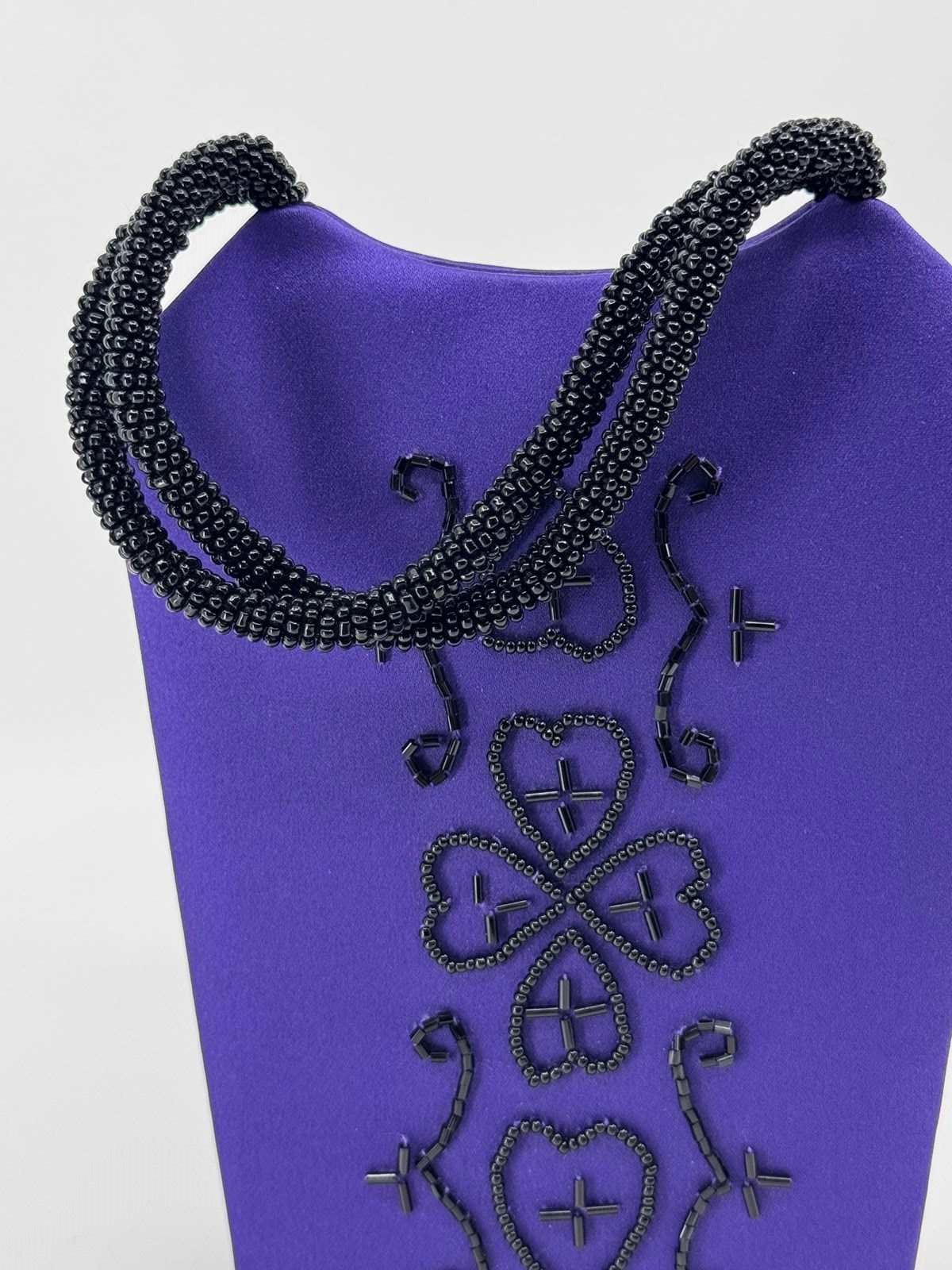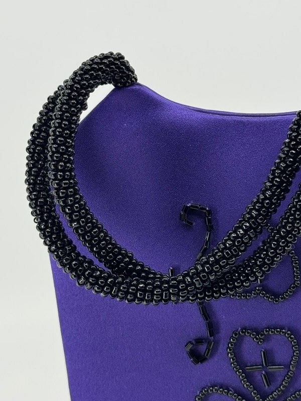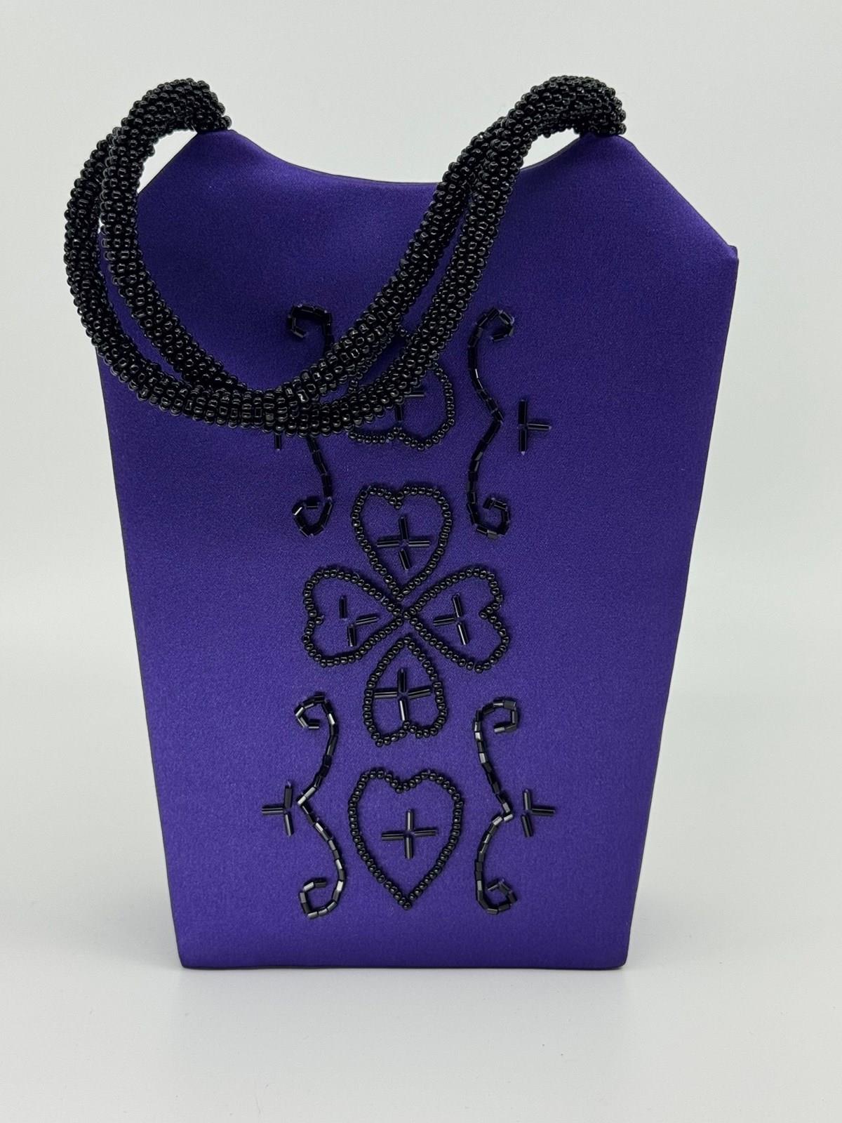Made from a purple satiny fabric, the body decorated in a pretty black beaded heart pattern design and the thick handles covered in small shiny beads.