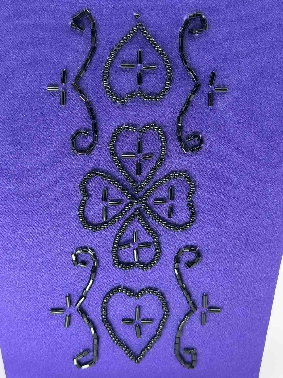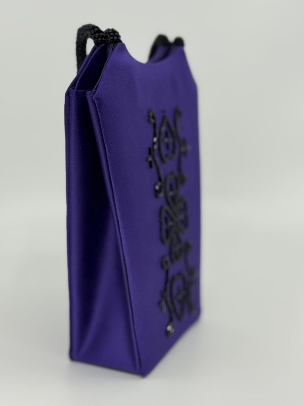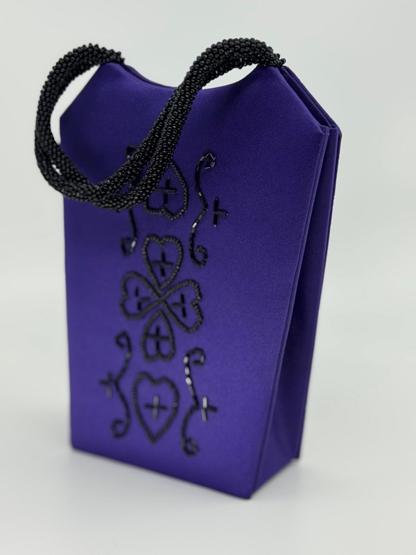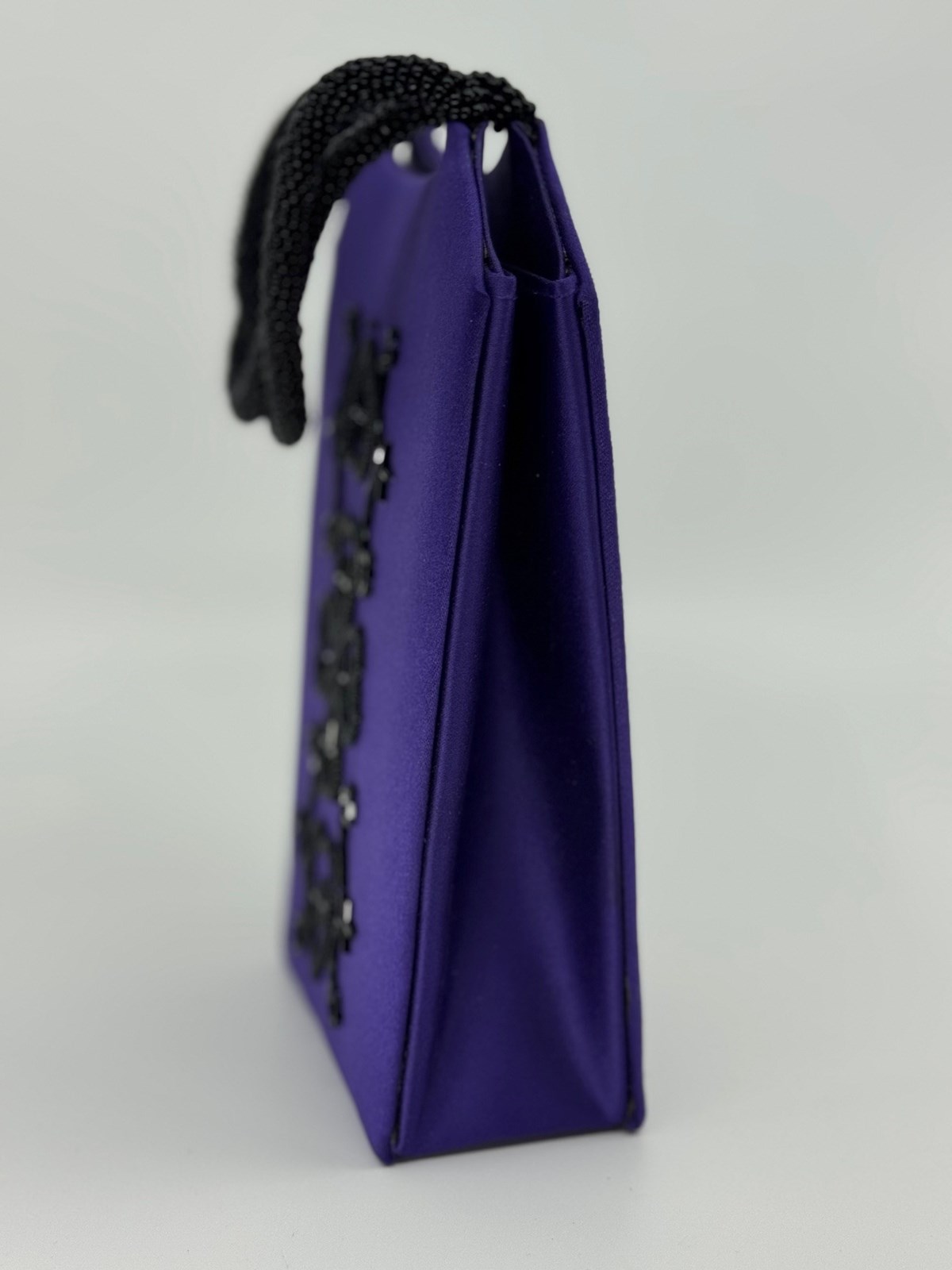 Made from a purple satiny fabric, the body decorated in a pretty black beaded heart pattern design and the thick handles covered in small shiny beads.
