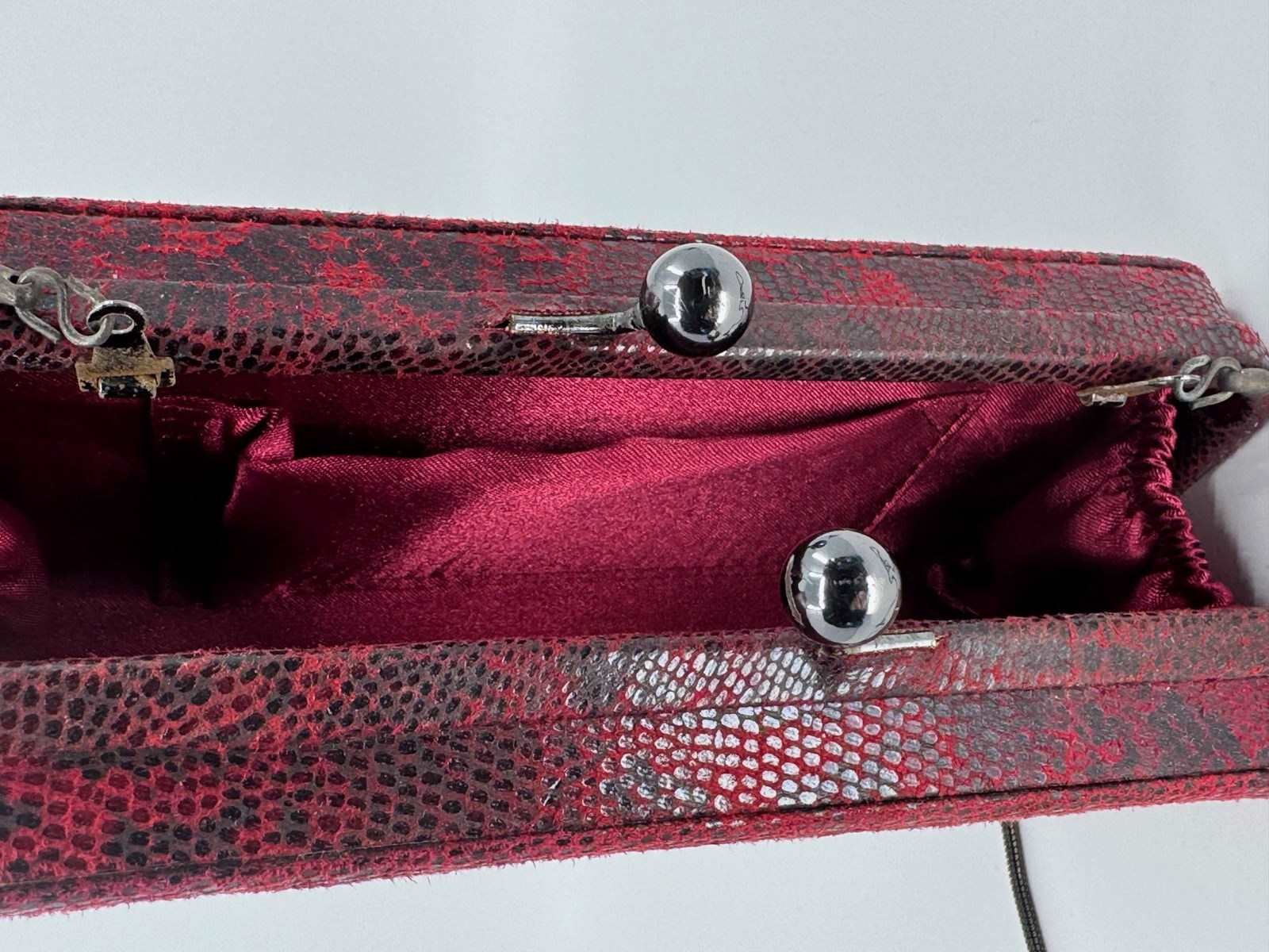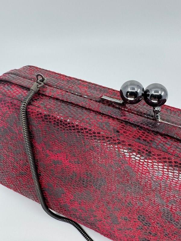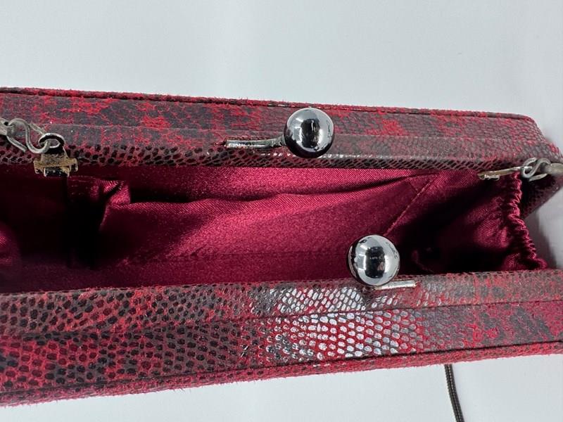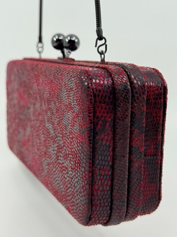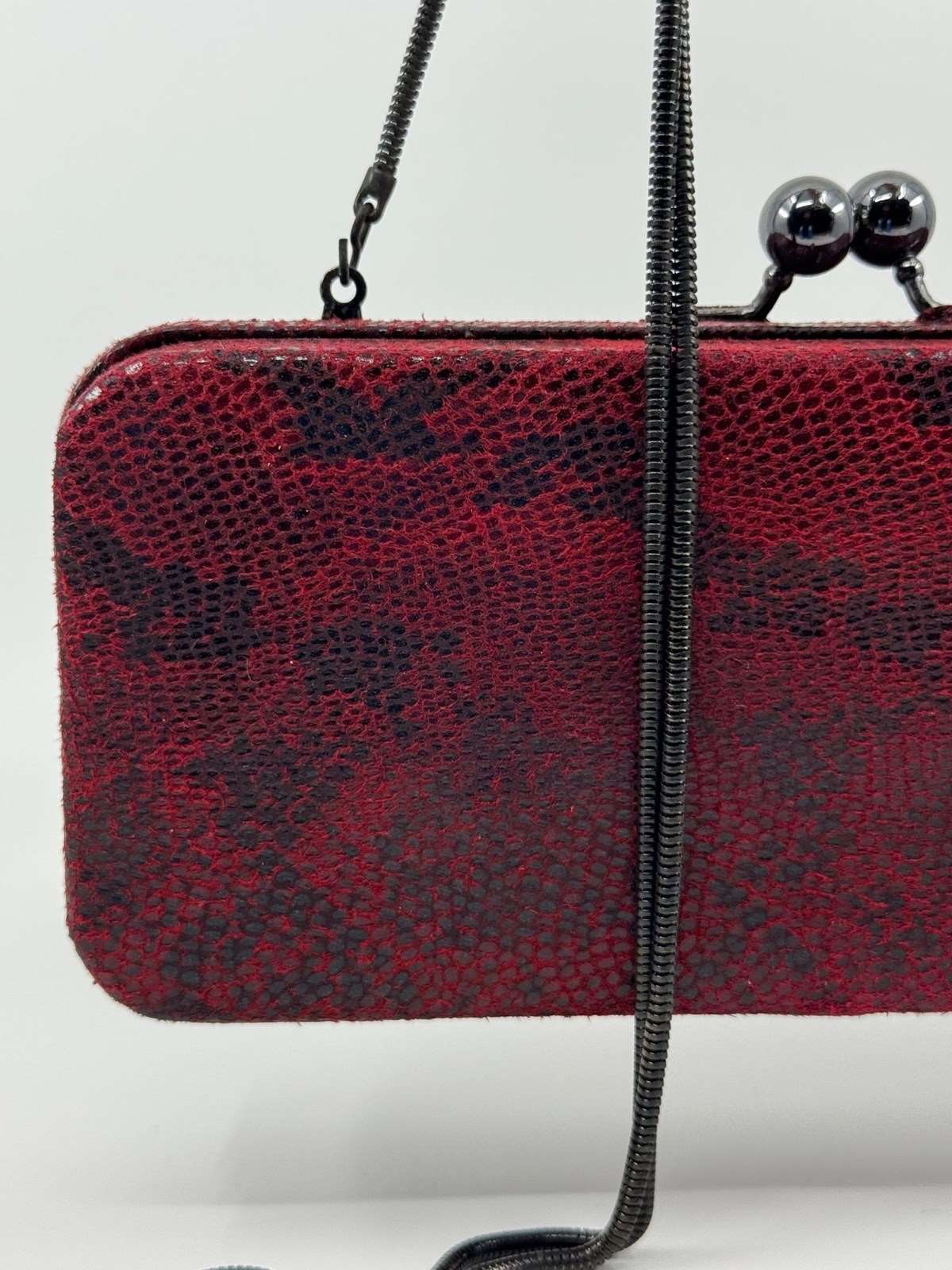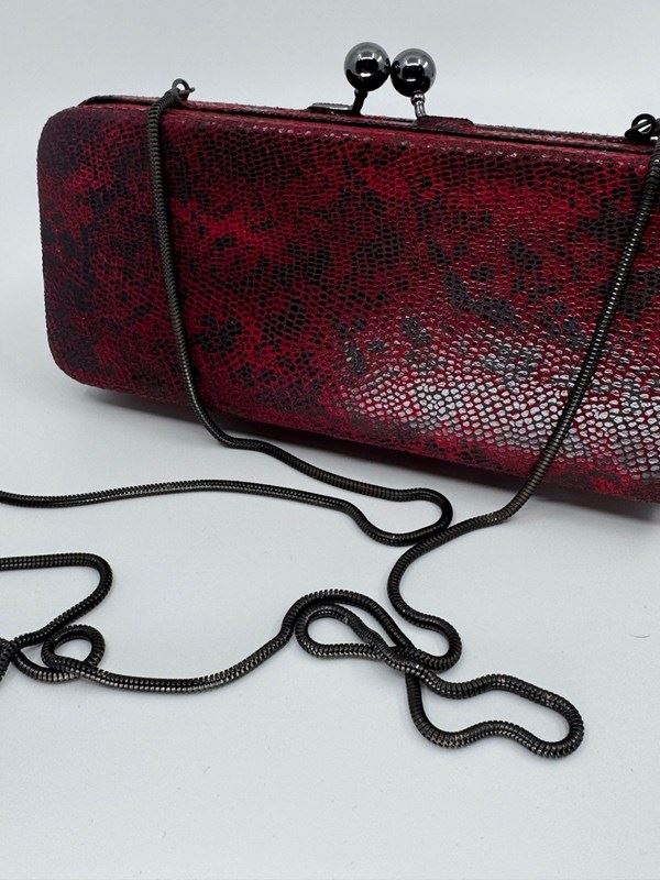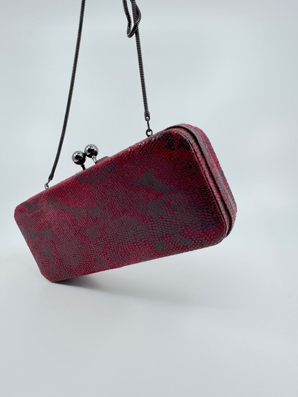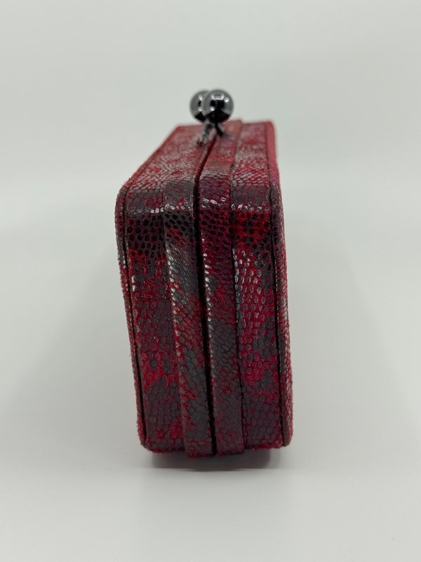 An unusual find with this French Connection faux red and black snakeskin handbag. The design is unlike what we believe are the later pieces, which are more python skin like, as this is a more subtle styling, but with an interesting and tactile grain.