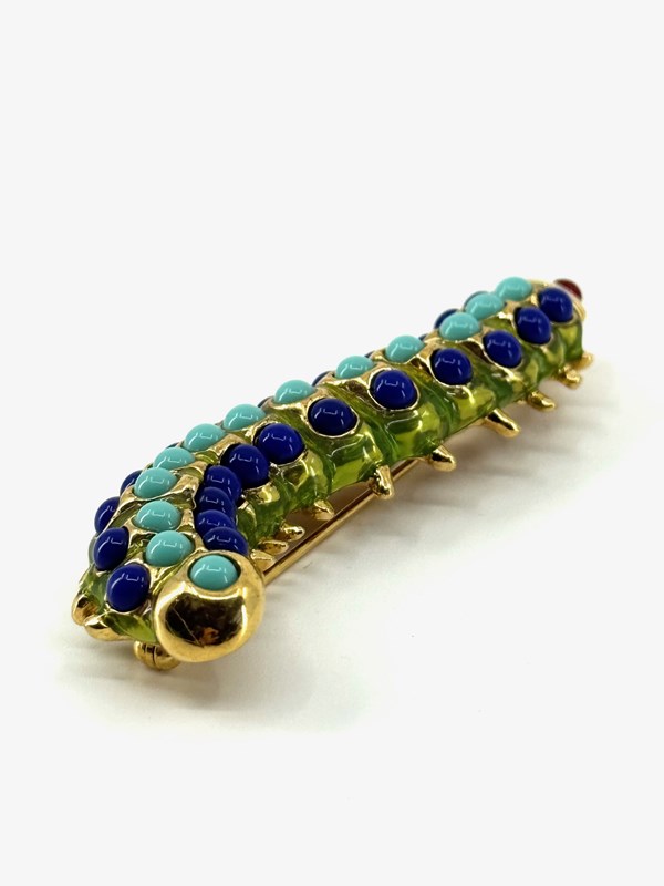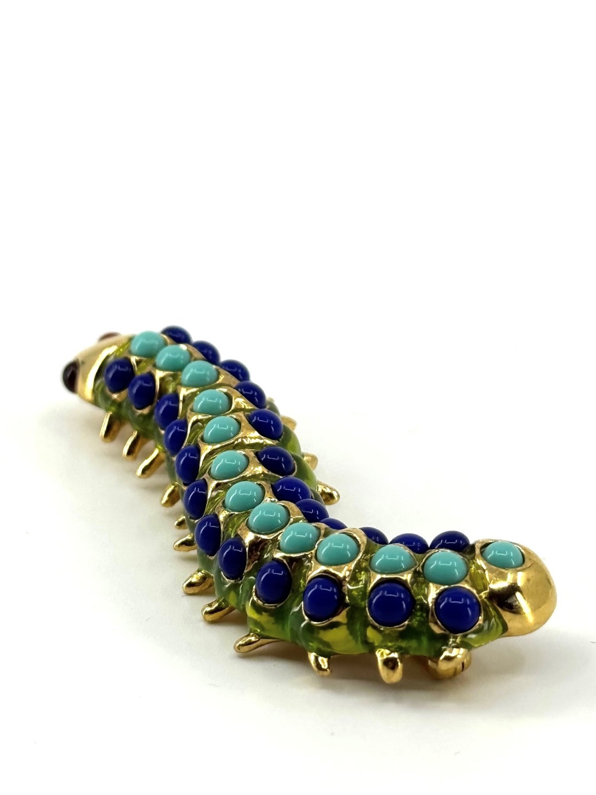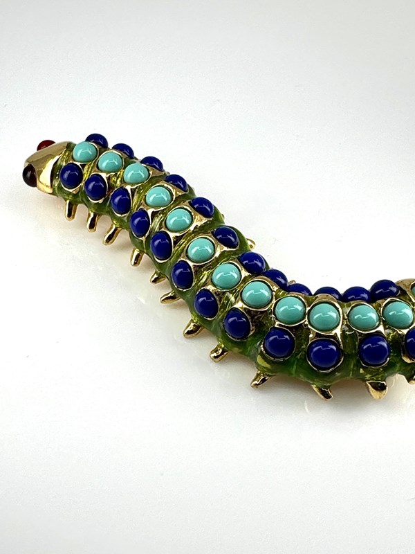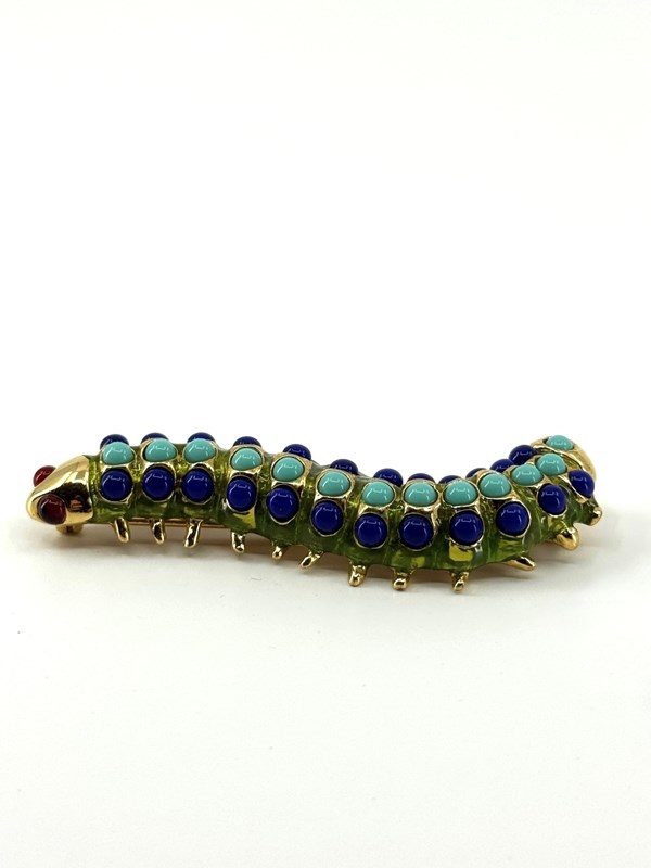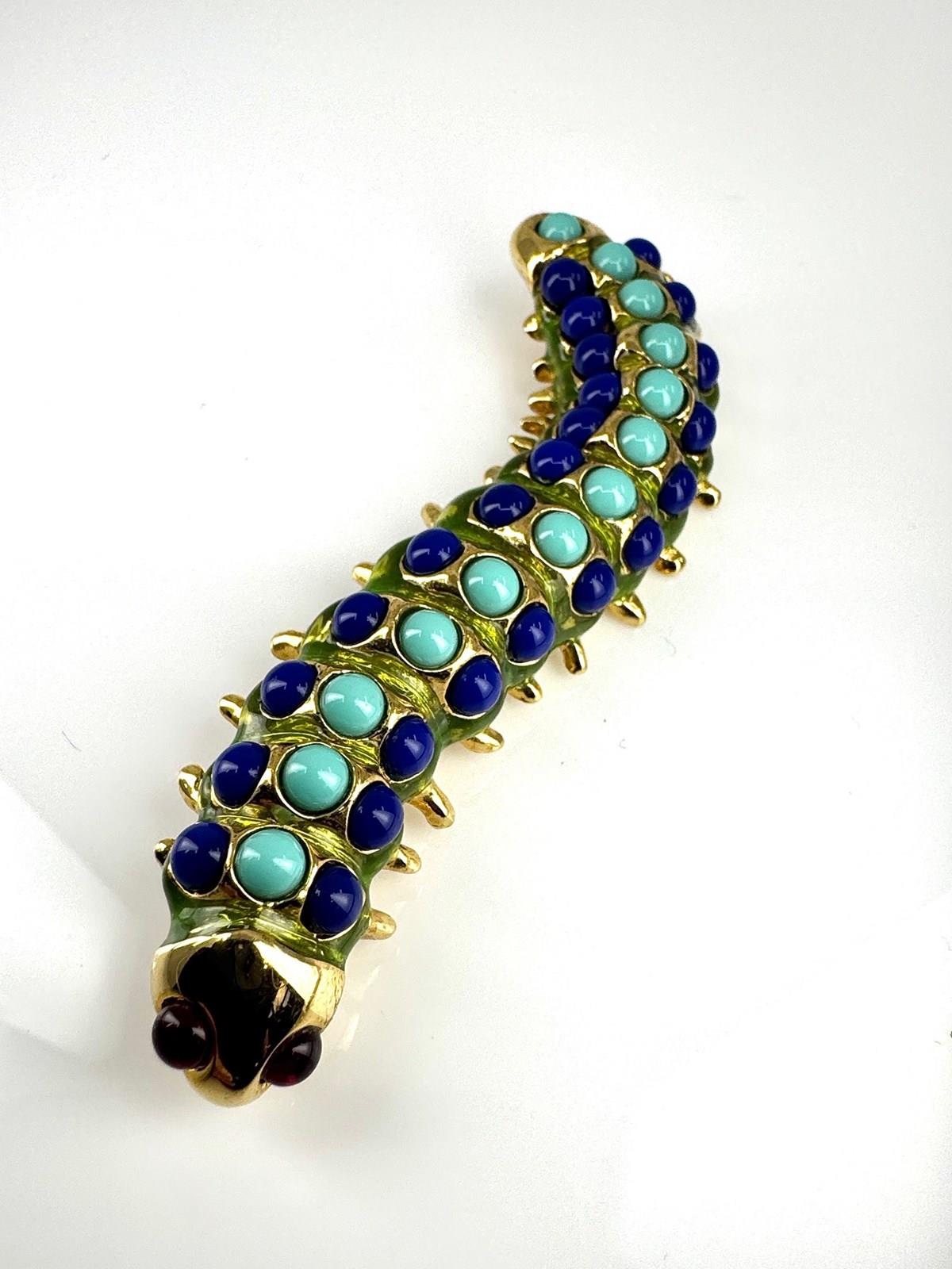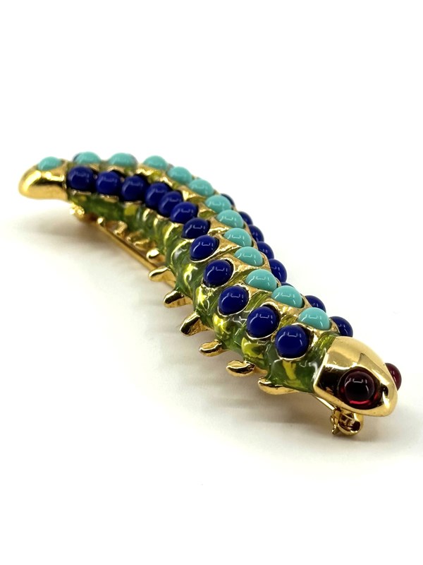 Wonderfully vibrant and in excellent original condition, is this 1980s vintage Caterpillar brooch, stamped with KJL for American jewellery designer Kenneth Jay Lane (1932-2017).