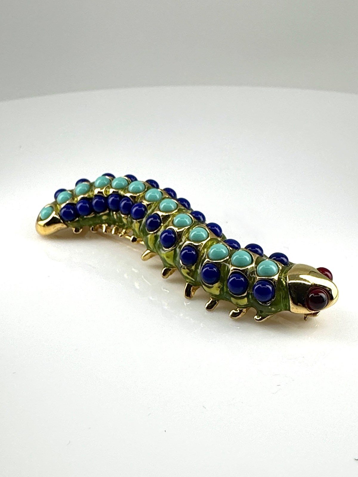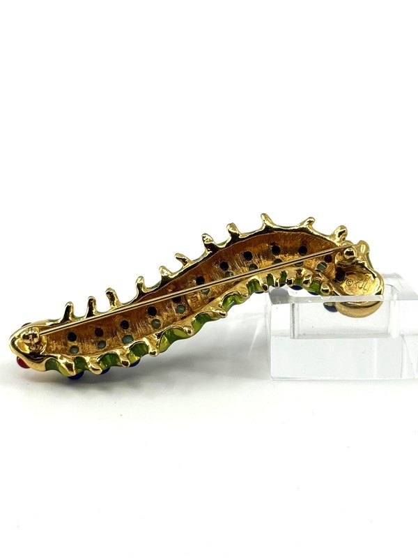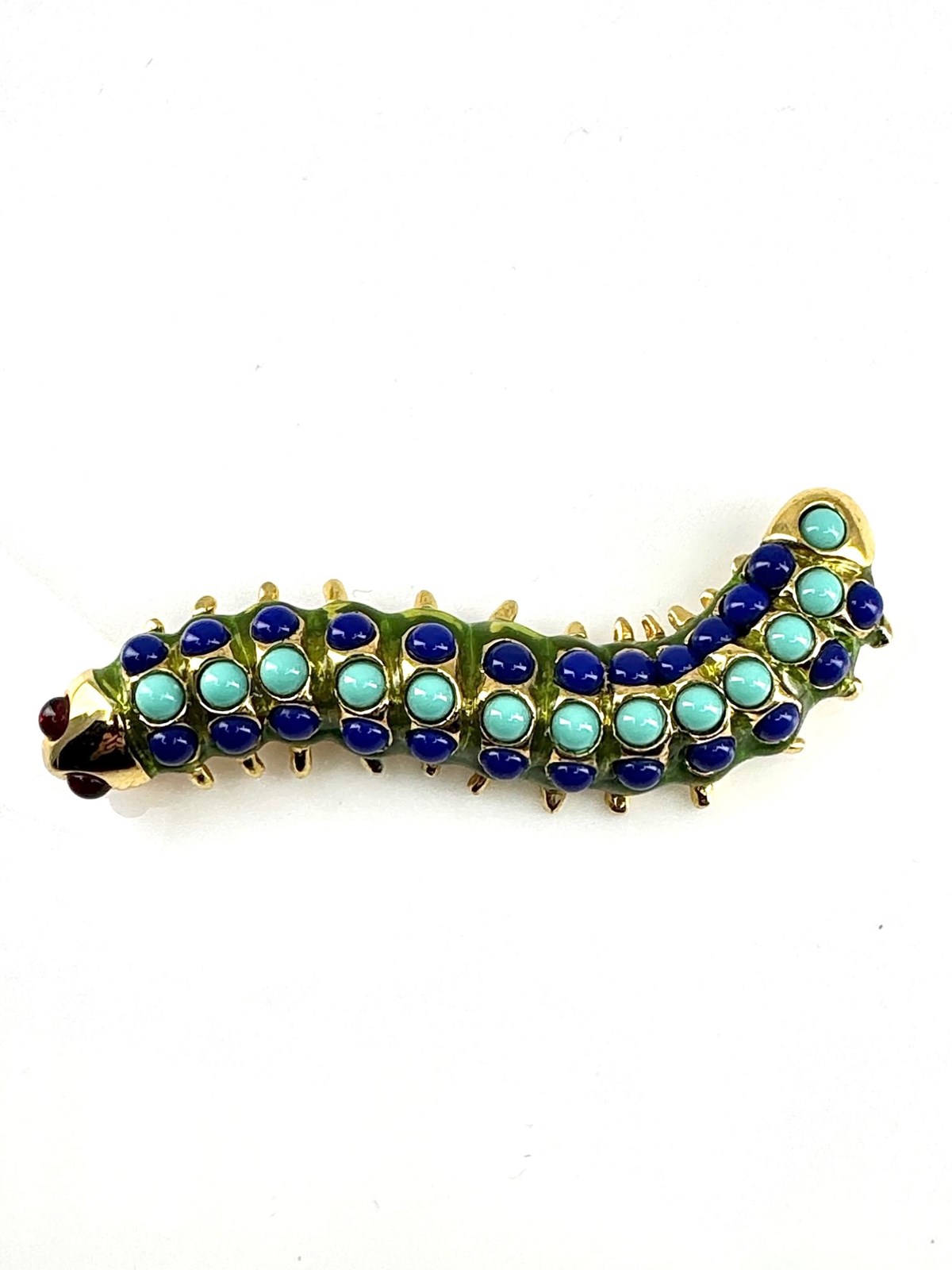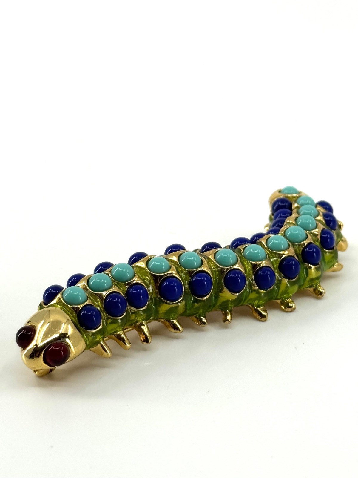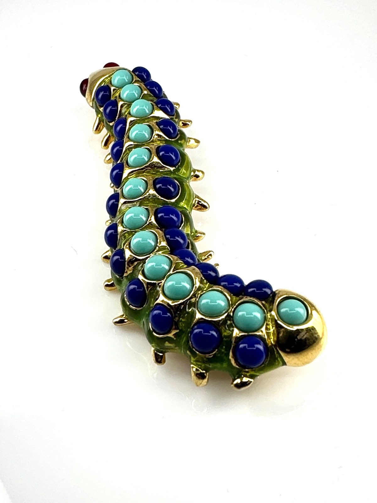 Wonderfully vibrant and in excellent original condition, is this 1980s vintage Caterpillar brooch, stamped with KJL for American jewellery designer Kenneth Jay Lane (1932-2017).