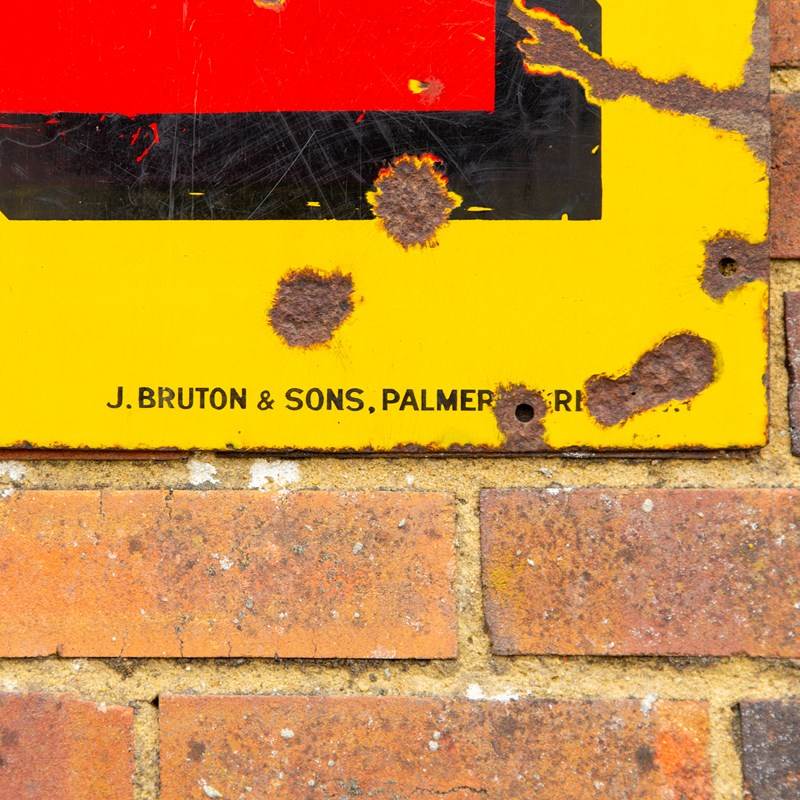 This particular example is likely to date to the 1930s and was produced by J. Bruton & Sons of Palmers Green. It's survived the decades in relatively decent order for such a large + weighty piece. There is enamel loss and surface scratches across the whole sign, but nothing that affects it's legibility. The colours remain good and there's a reasonable surface gloss. All of the original mounting holes are present and it displays well.