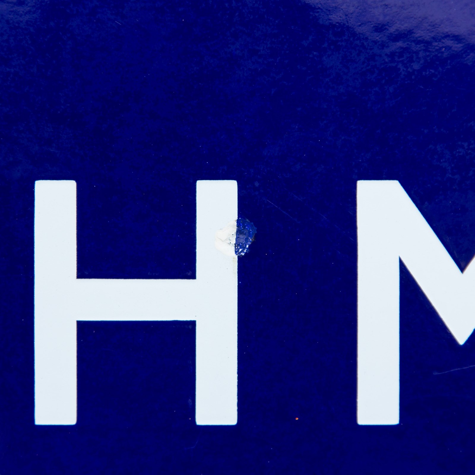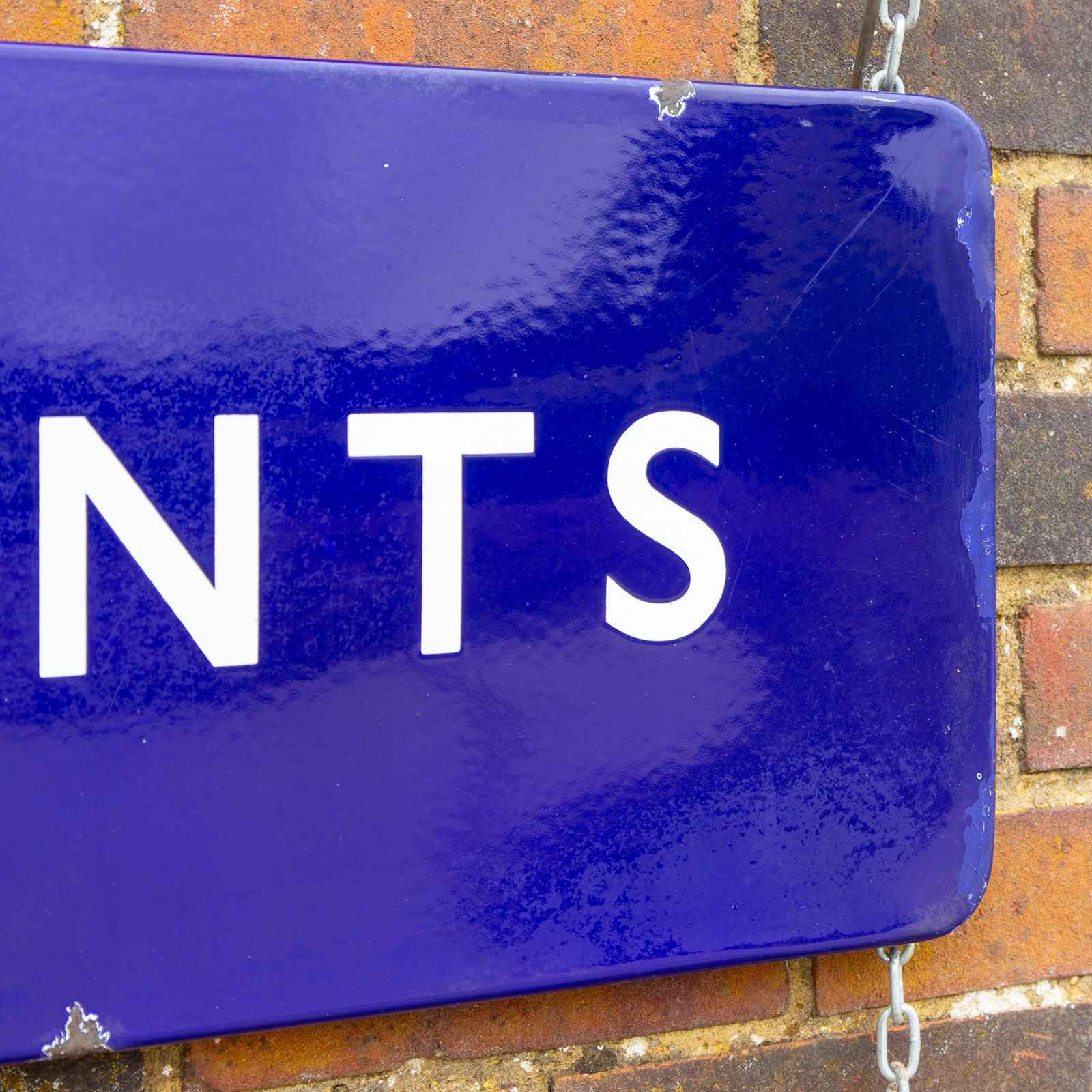 The sign is in good, clean and bright condition. The gloss is excellent (I've tried my best to capture this in the angled photographs) and the blue is wonderfully deep. It has a few patches of enamel loss - primarily around the outer edges as well as some surface scratching. Some of the enamel loss has been subject to some touch-ups / restoration over the years, though with these railway signs, this often occured during their functional life as part of station repairs / re-decoration and so is to be a little more tolerated than restoration often is... Generally this is all inline with what you would expect, even hope, to find with an original piece of vintage signage.
