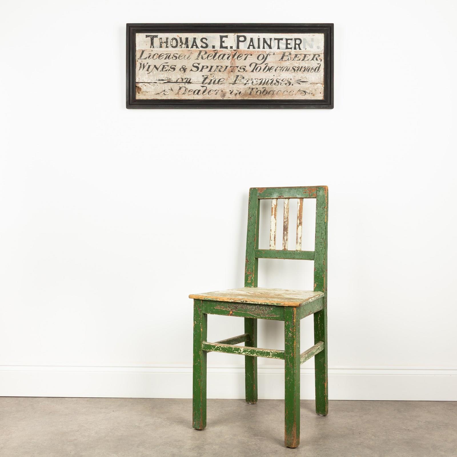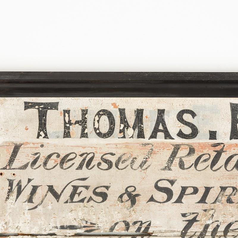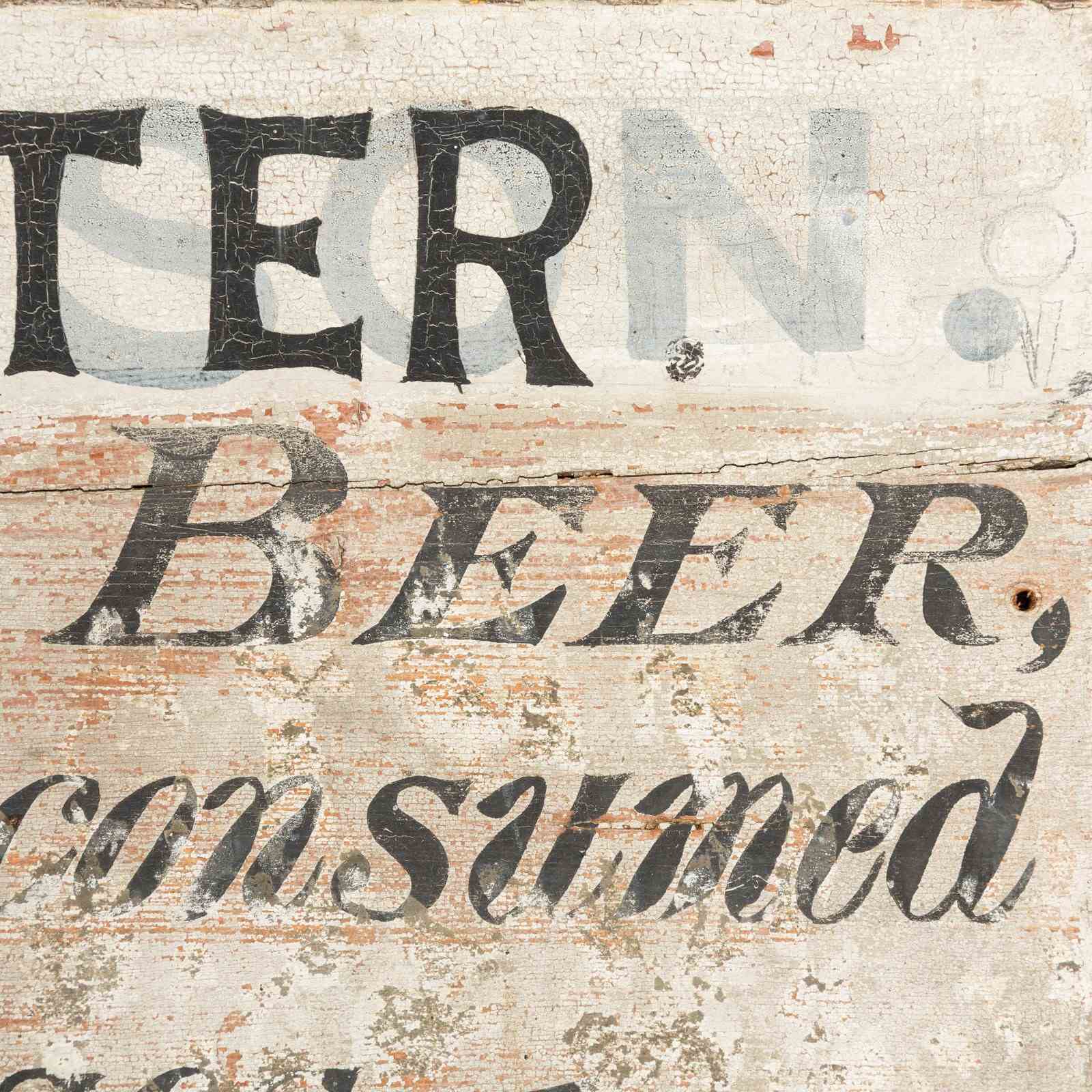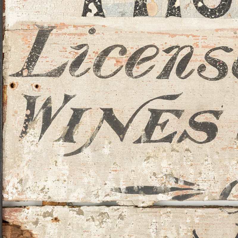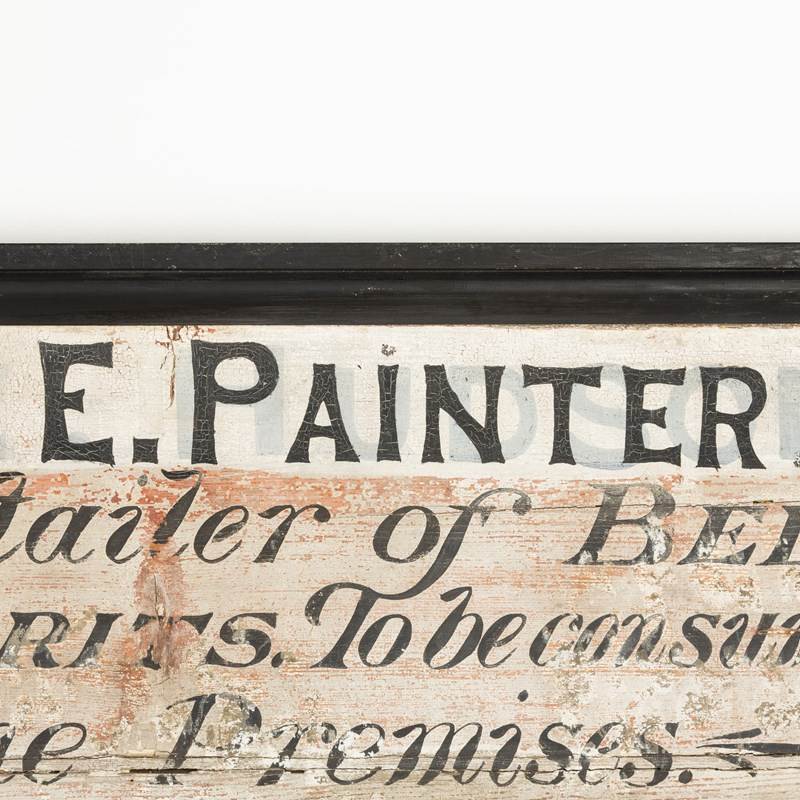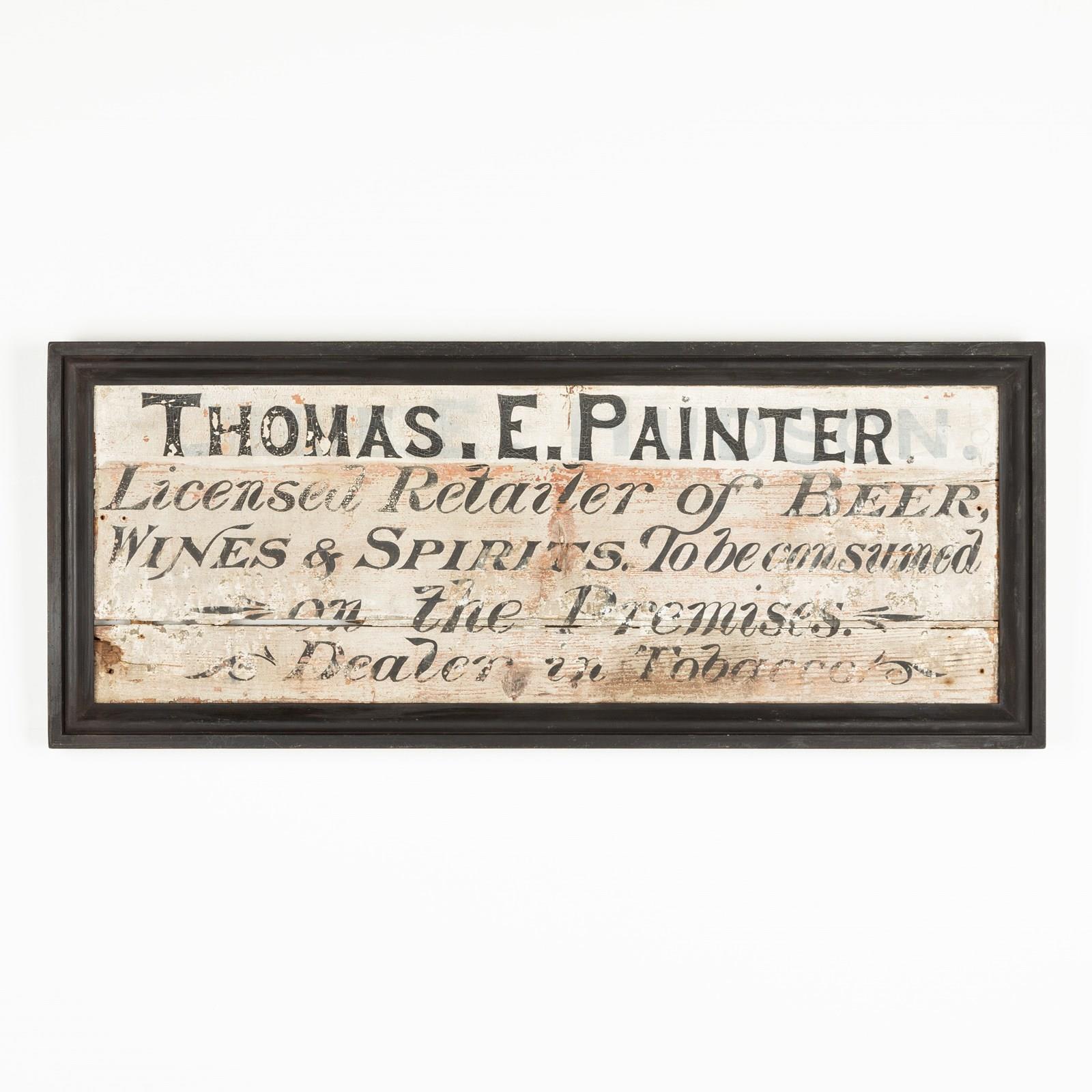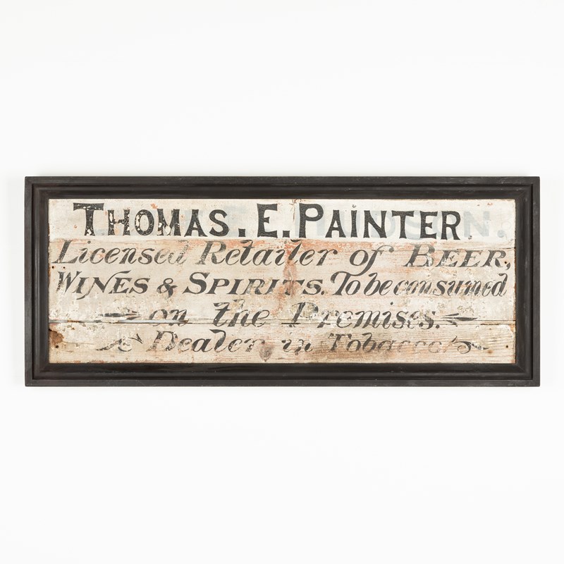 'Thomas. E. Painter - Licensed Retailer of Beer, Wines & Spirits to be consumed on the premises. Dealer in Tobacco' - presumably this graced the doorway of a pub / bar / tavern. It's English, mid-19th century and the signwriting is wonderfully stylised yet charmingly naieve. Mr Painter wasn't the original licensee of whatever premises this graced; his name has been painted over the original which remains faintly visible as a ghost in the background... The change certainly took place a long time ago as the lettering for Mr Painter's name shows almost as much age as the rest of the sign.