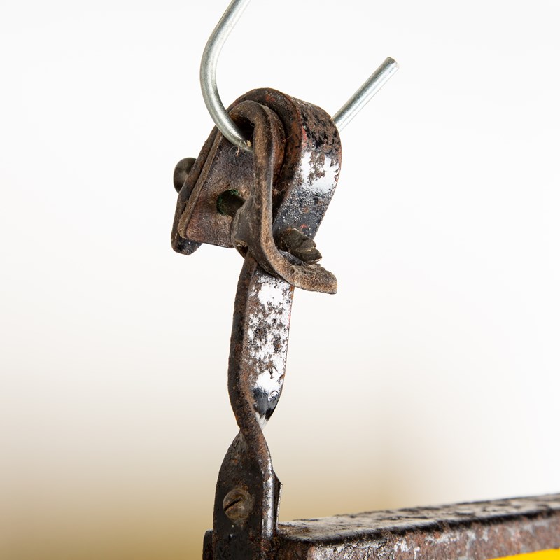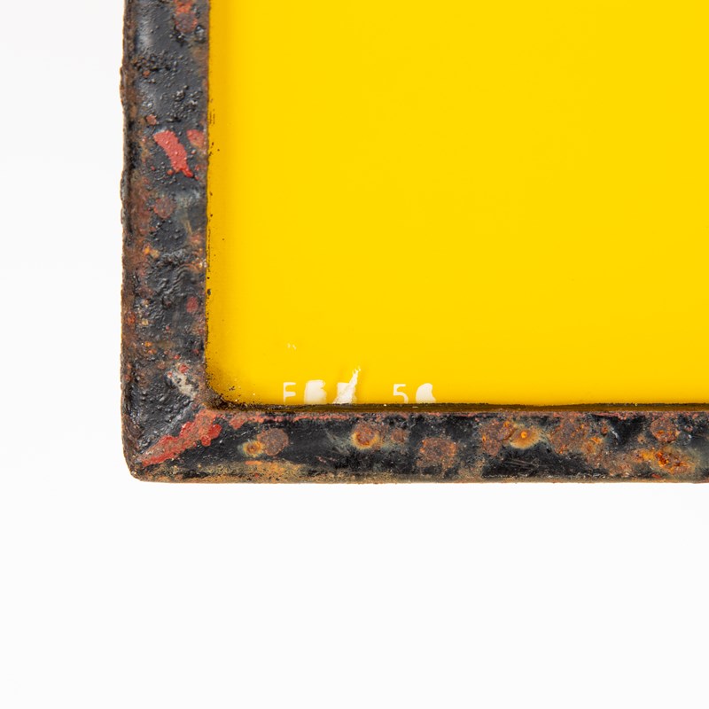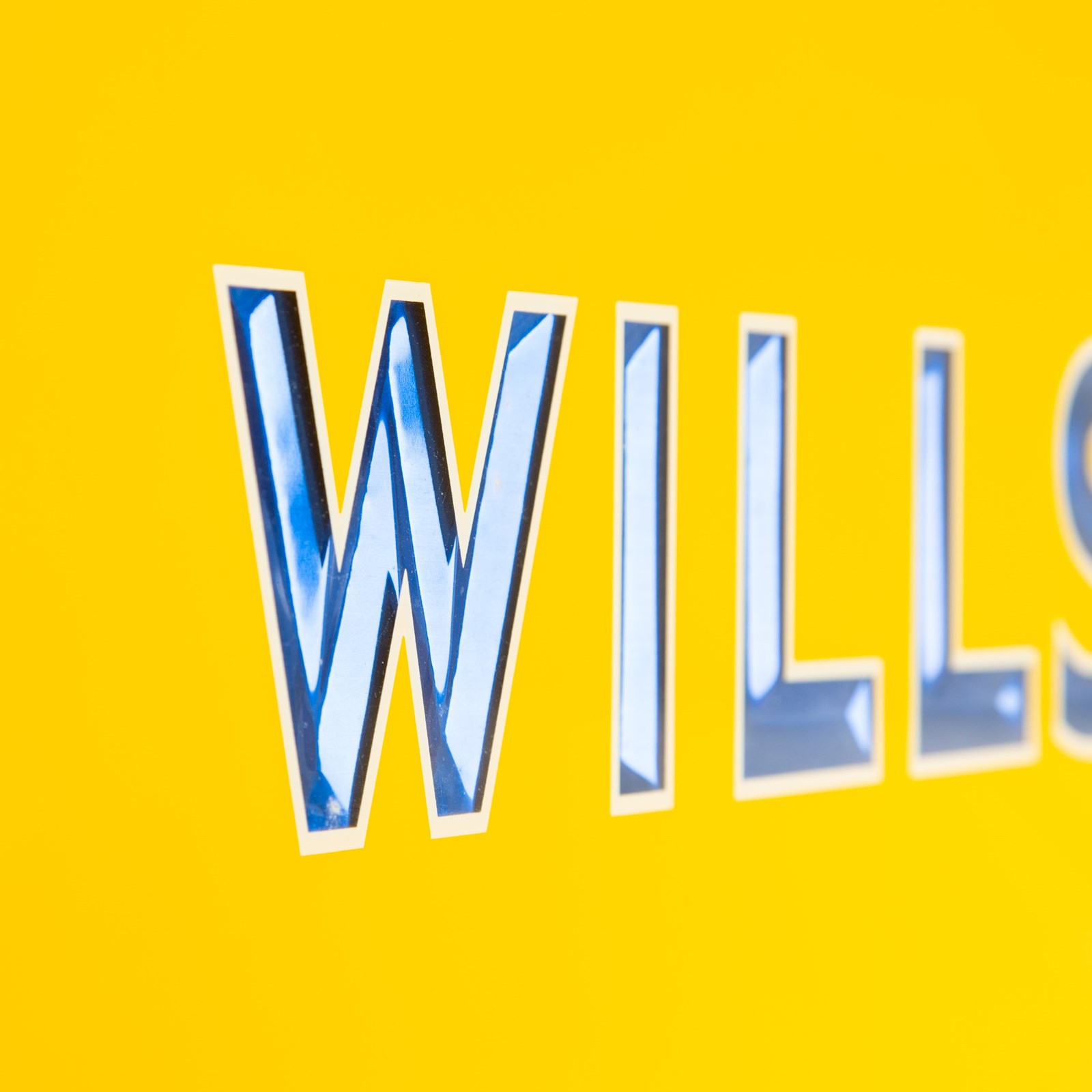 This sign made up of two pieces of reverse painted vibrant yellow glass, with the lettering left exposed so that you can look through to anodised blue, embossed metal letters. This is all together in its original metal framework with hanging hooks (which retain their original leather cushioning straps and retaining split pins!). The piece is dated to February 1956 and remains in wonderful, original condition. A very eye-catching piece and a rare survivor.