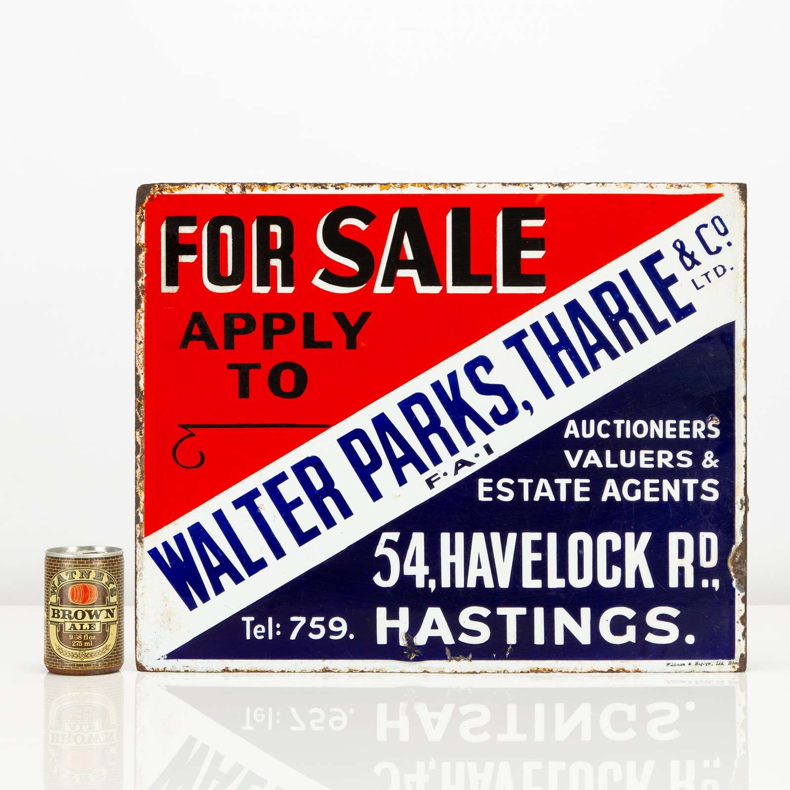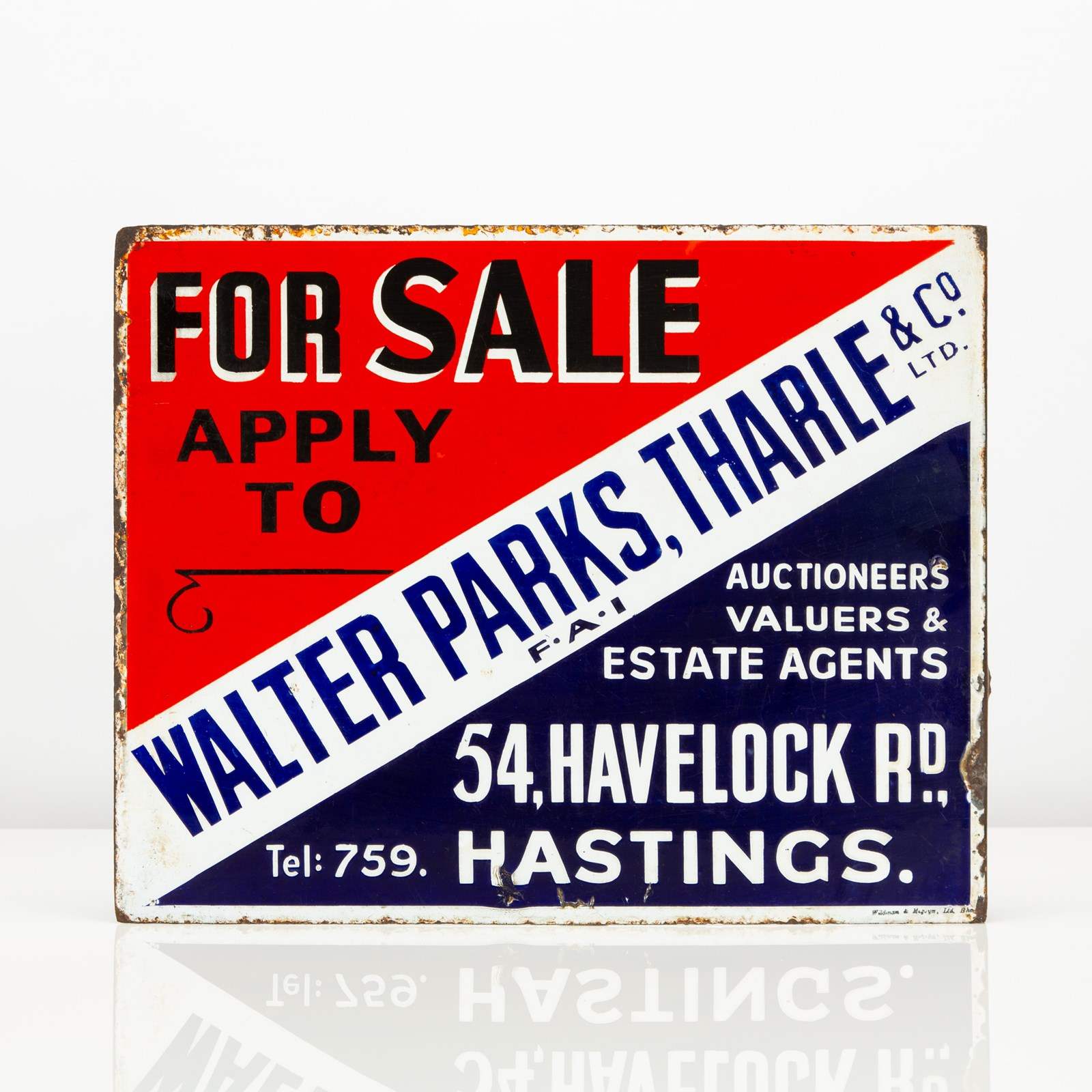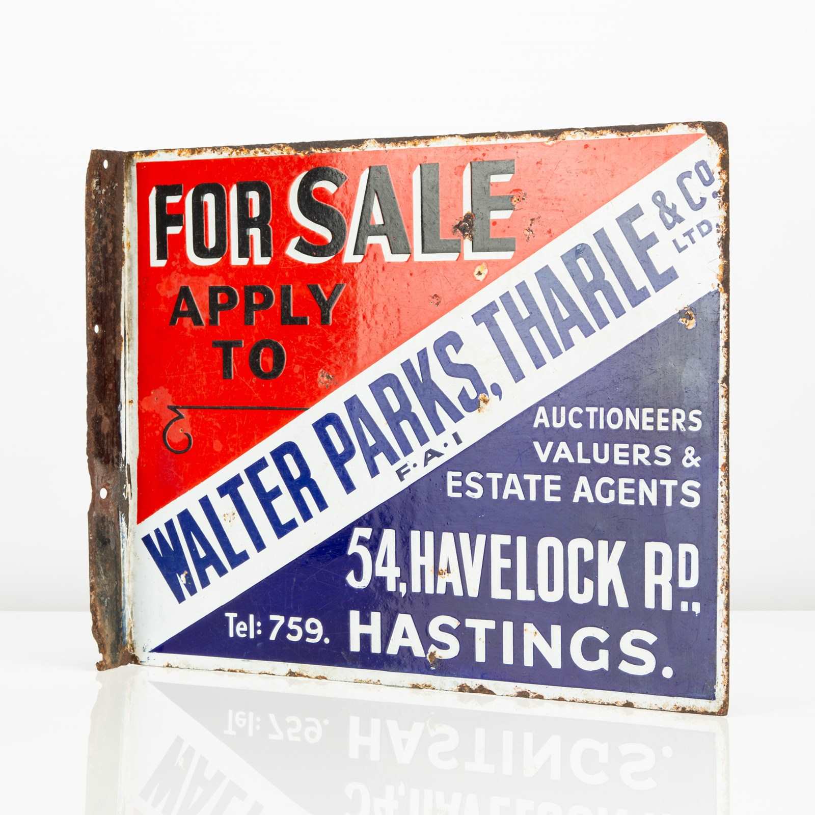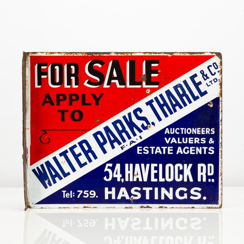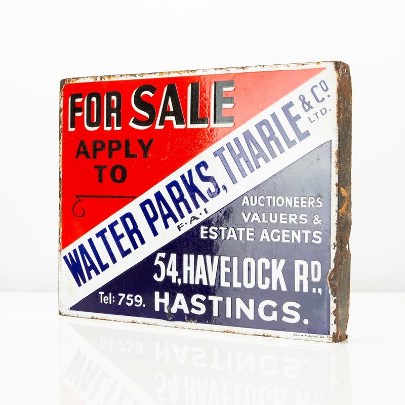 This double-sided, enamel flange sign for Hastings (UK) based estate agents Walter Parks, Tharle & Co Ltd is a wonderfully vibrant, striking example.