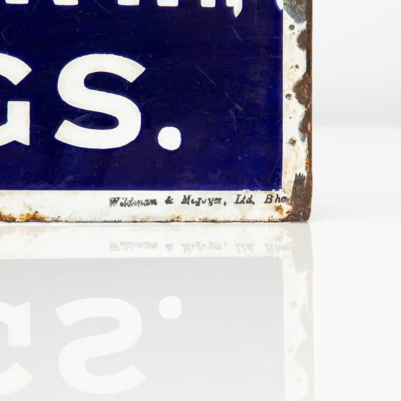 I can't find much information about this particular "auctioneers, valuers & estate agents" though their name is referenced in various 1920s editions of the Hastings & St. Leonards Observer and the three digit phone number pre-dates the 1950s so I'd guess at this sign being from the 1930s/'40s. It was produced by the less common Birmingham enamelers Wildman & Meguyer Ltd who were particularly active in the '30s so this would support the dating.