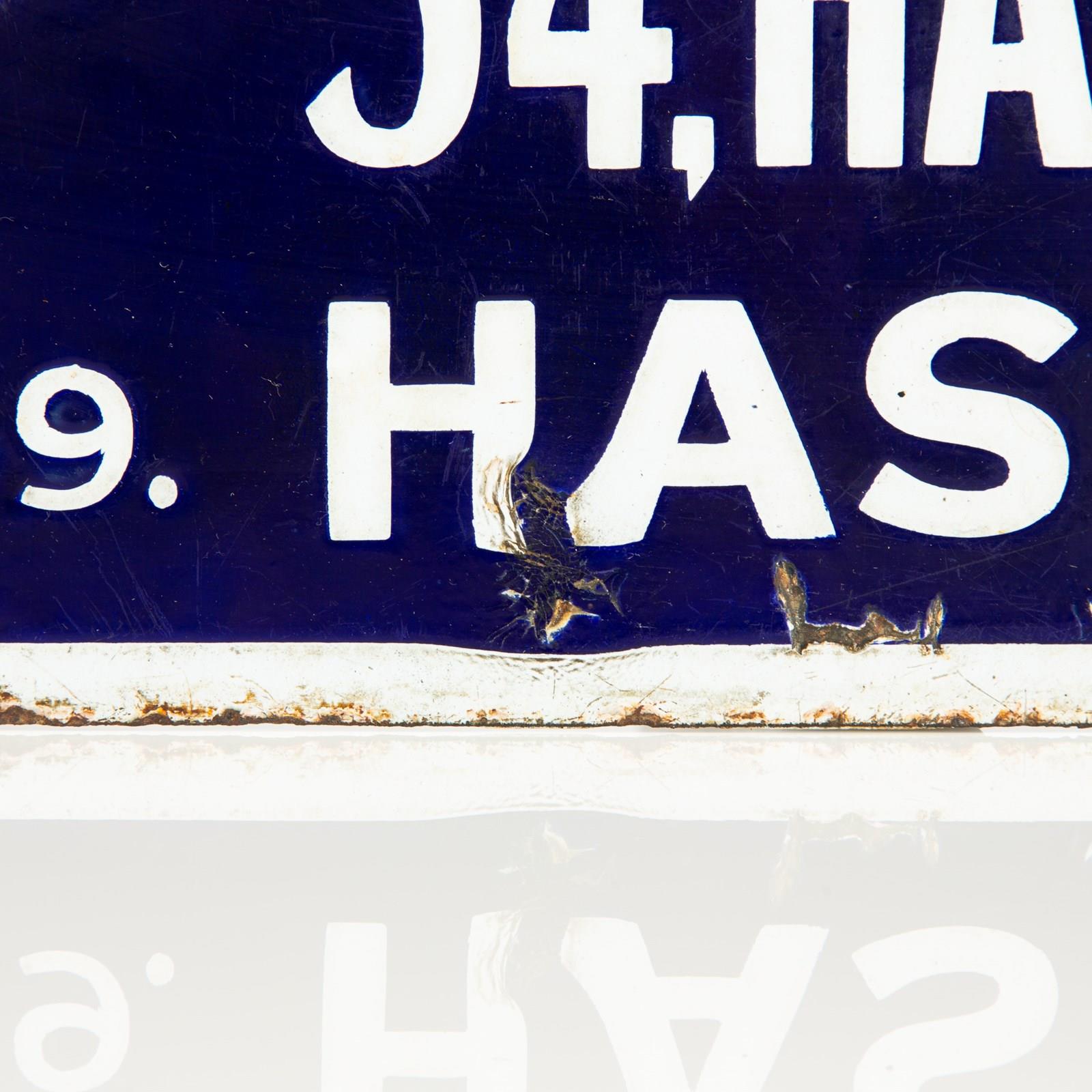 These flange signs were designed to stick out from a building's frontage at a 90 degree angle - visible to people approaching from each direction ... These estate agent examples would have been transferred between the agencies properties (much nicer than the corrugated plastic we have today!) and subsequently often look a little 'worse for wear' but this example has survived it's usage and the subsequent decades in very good order. The original flange remains present and functional (one pulled screw hole) and both sides retain a decent gloss (see angled photos where I have tried to show this) and bright enamel layers. Unusually there is a firing fault around the 'Ha' of 'Hastings' on one side. There are a few light surface scratches and some small enamel loss (mainly around the outer edges) but this would have to be considered a good example of it's type.