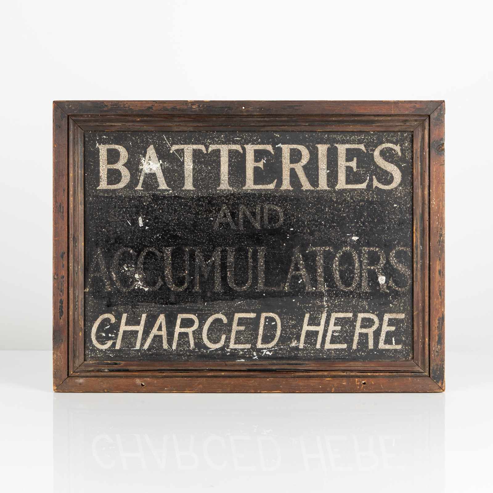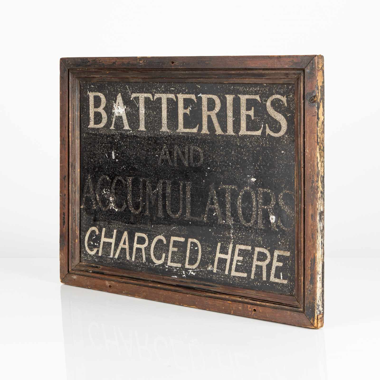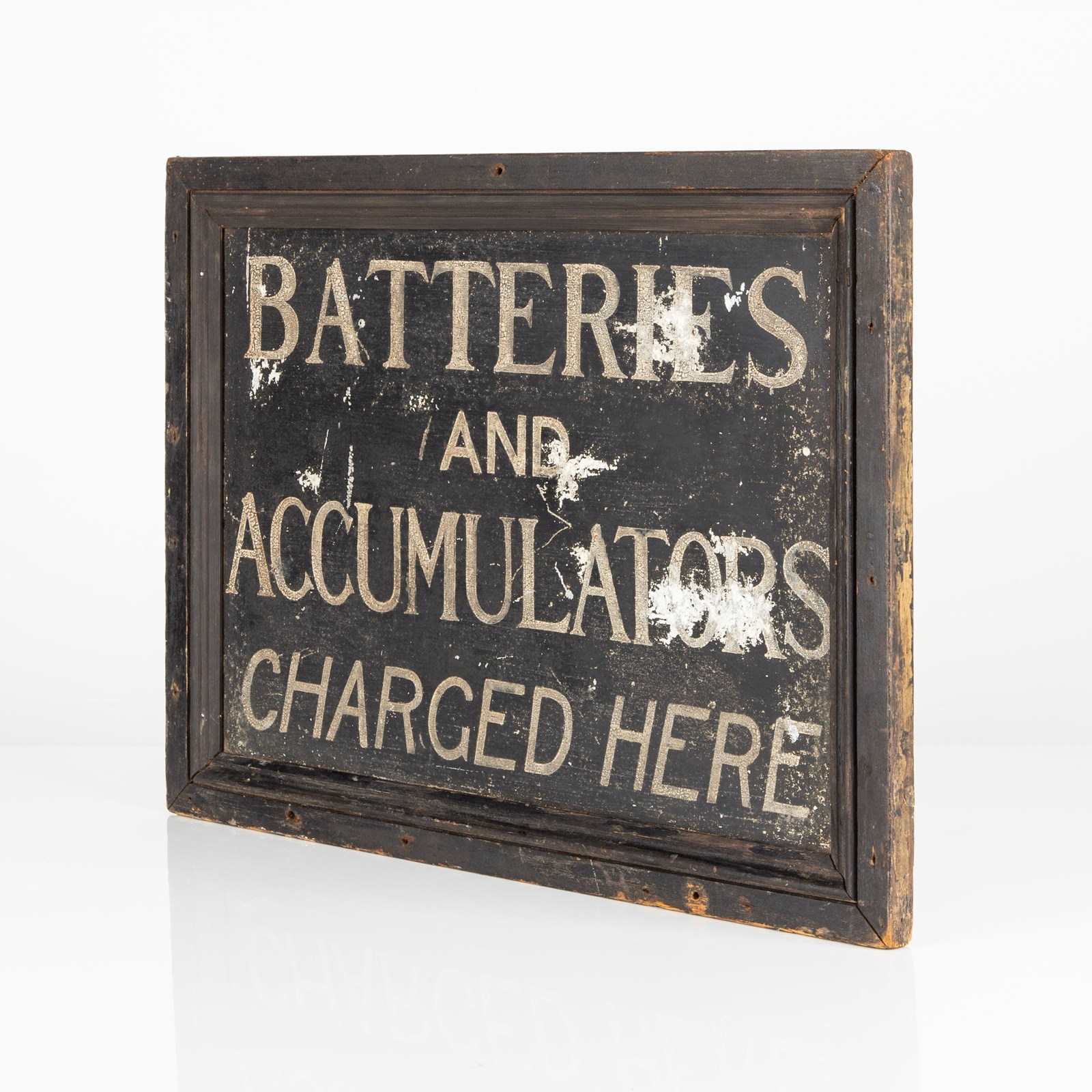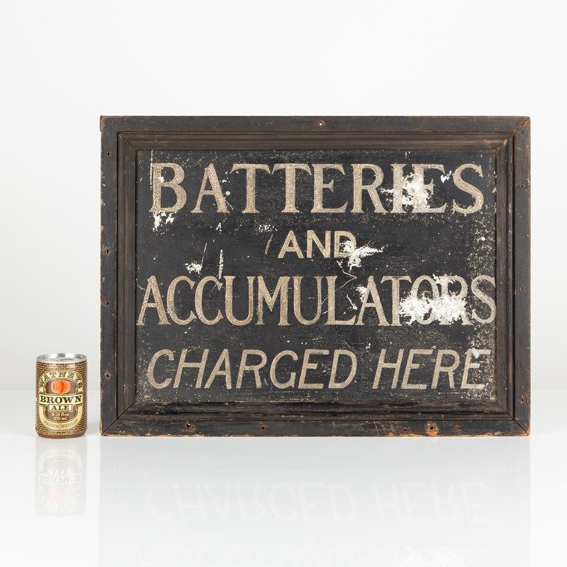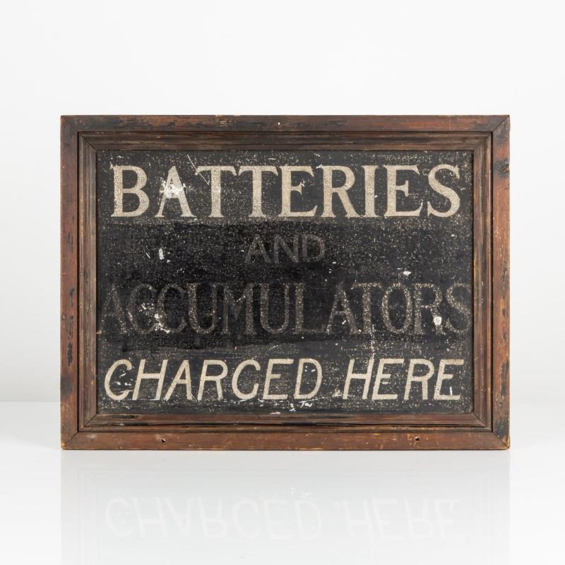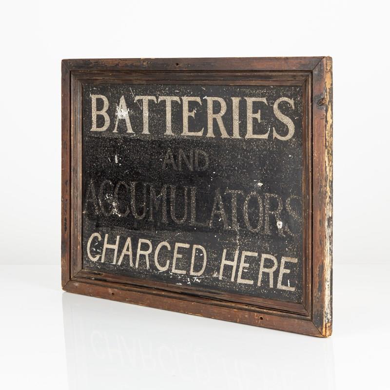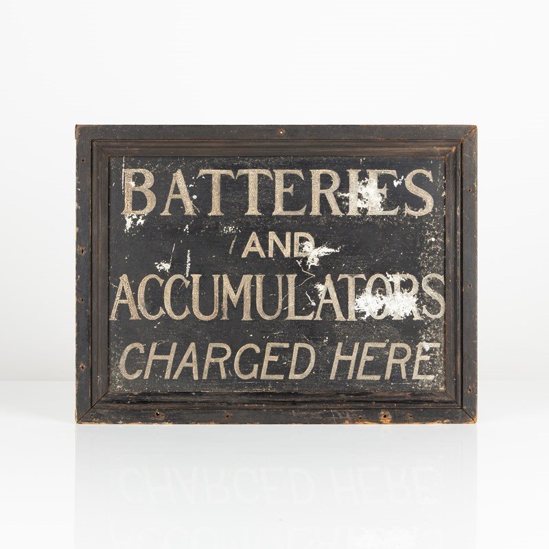 'Batteries and Accumulators Charged Here' ... This double-sided, hand painted sign is a fantastic piece of early, automotive history.
