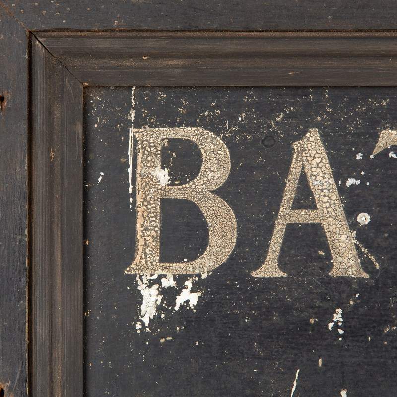 The sign is painted on thin metal (probably aluminium) sheet with it's original wooden framing. The lettering is competently sign-written though still with plenty of naive charm. It's aged beautifully with a lovely craquelure surface to the white letters that's accentuated by decades of garage dirt building up in the cracks. There are some areas of paint loss, surface scratching and light corrosion to the aluminium surface but all to be expected with a piece of this age.