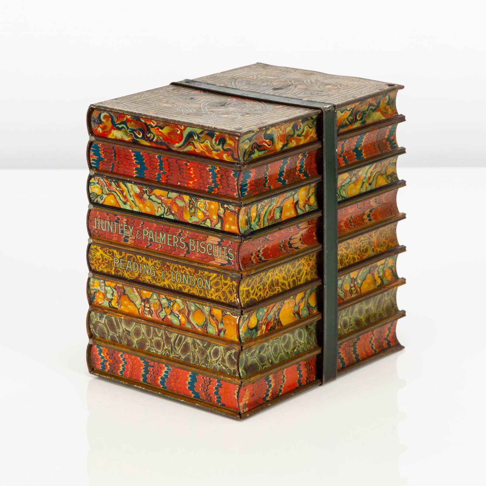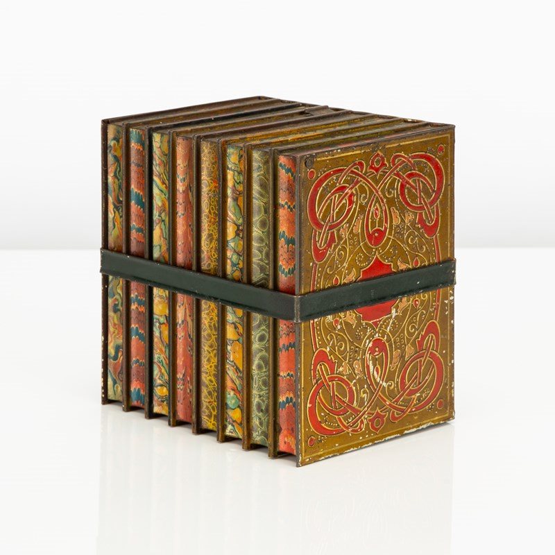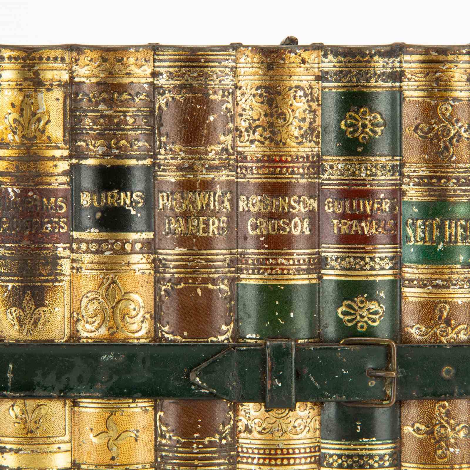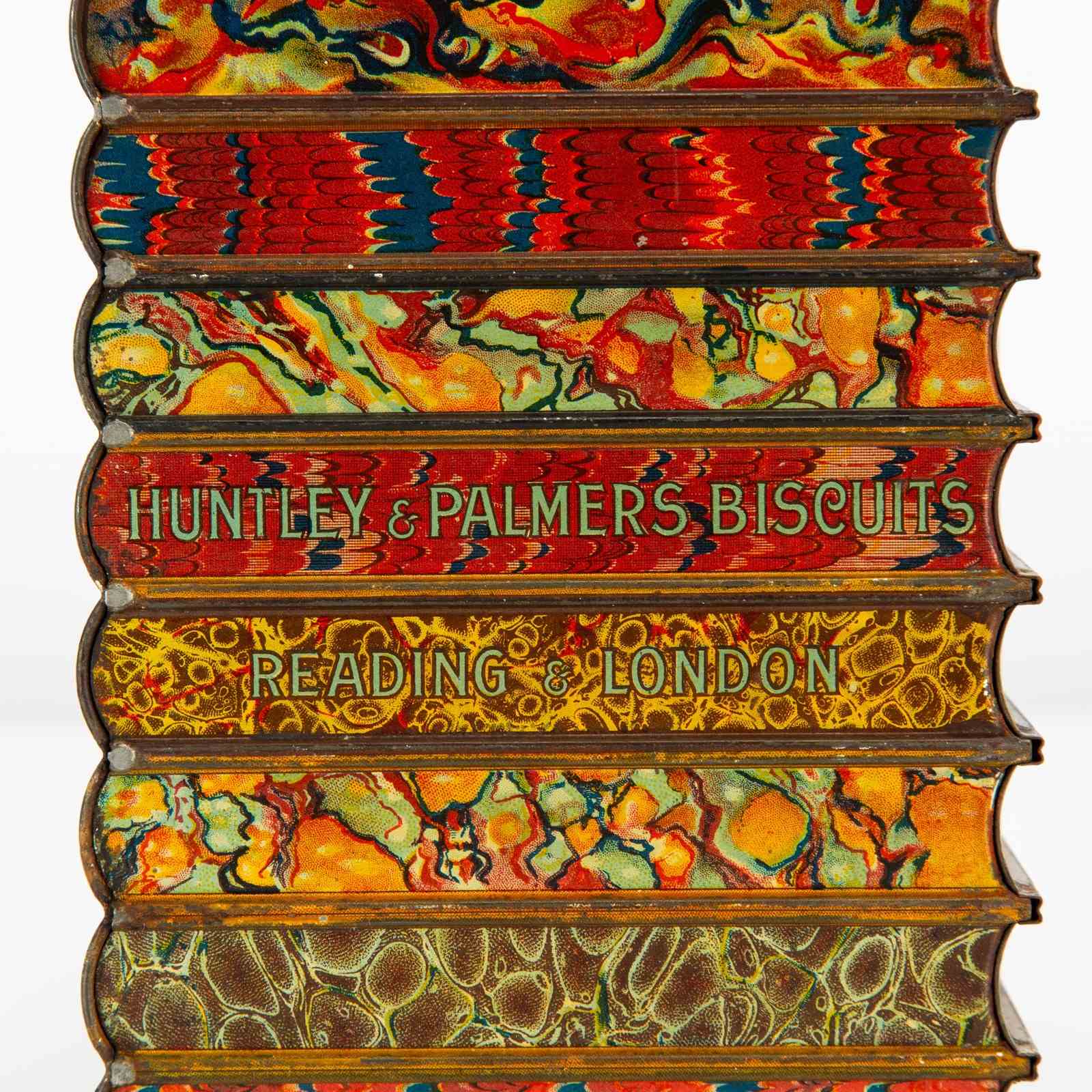 Here we have a good example of one of Huntley and Palmers' highly desirable 'book' biscuit tins. This biscuit tin is fabricated to look like an eight volume book set of classic literature titles, bound by a leather and buckled carrying strap. There is a small tin strap "bookmark" to open the hinged lid. The sides feature wonderfully detailed faux leatherwork book covers and the top, reverse and base are decorated in a wonderfully vibrant 'marbling' - the base is subtly marked 'Huntley & Palmers Biscuits, Reading & London'