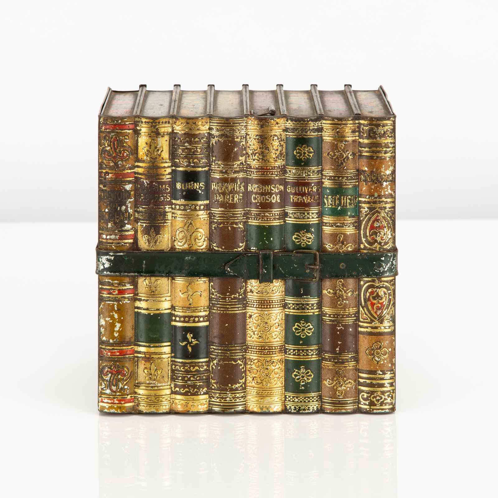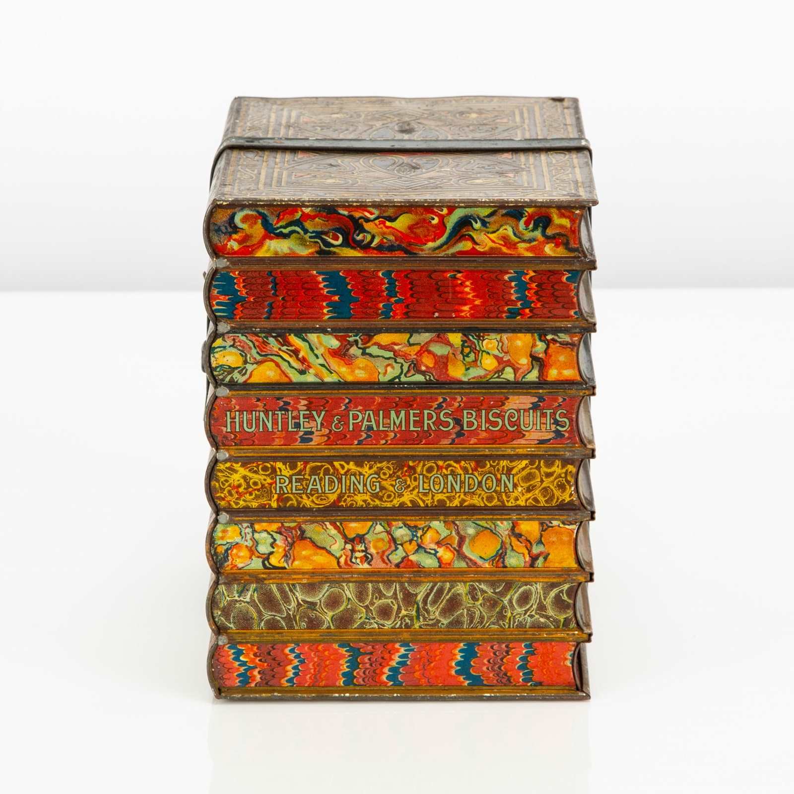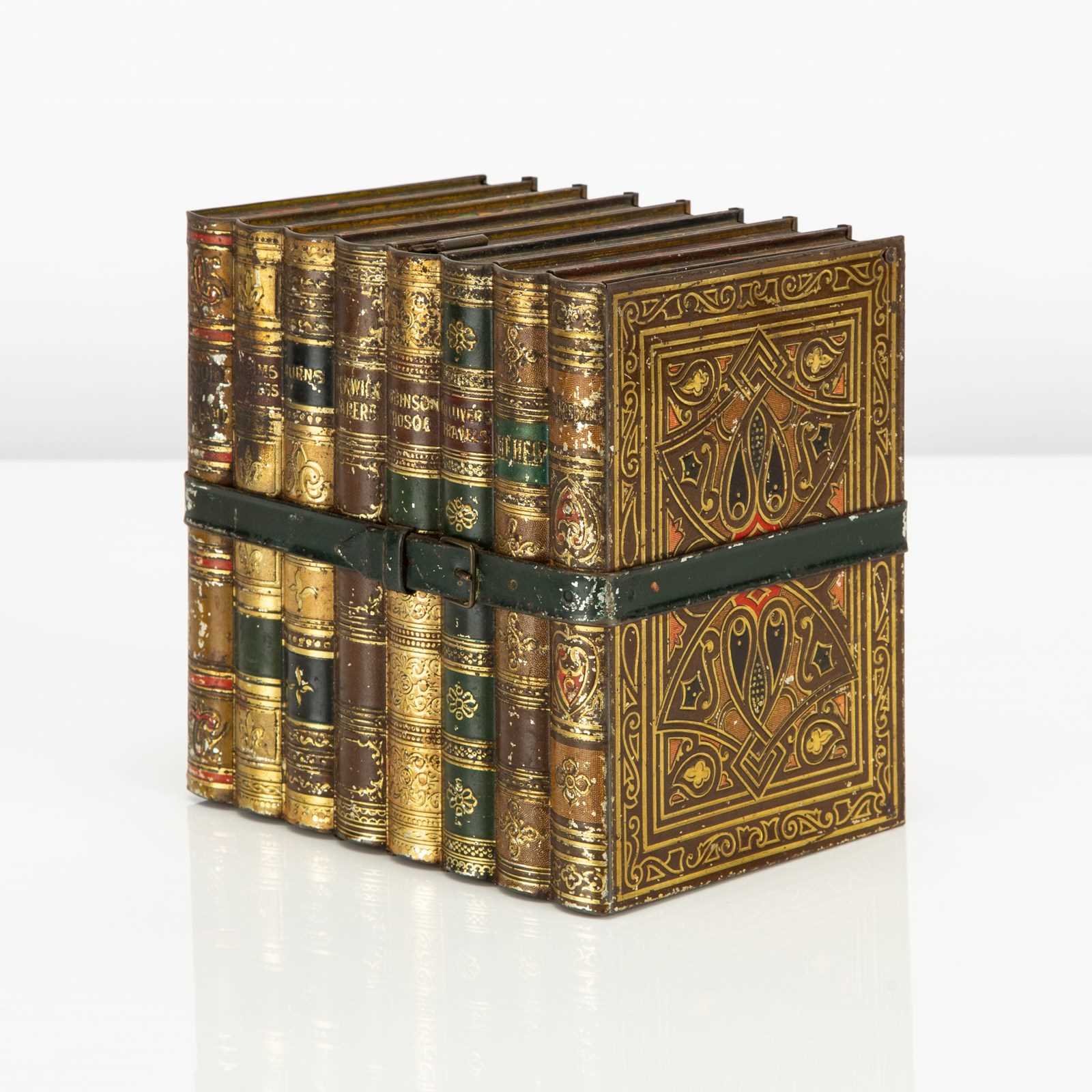 Here we have a good example of one of Huntley and Palmers' highly desirable 'book' biscuit tins. This biscuit tin is fabricated to look like an eight volume book set of classic literature titles, bound by a leather and buckled carrying strap. There is a small tin strap "bookmark" to open the hinged lid. The sides feature wonderfully detailed faux leatherwork book covers and the top, reverse and base are decorated in a wonderfully vibrant 'marbling' - the base is subtly marked 'Huntley & Palmers Biscuits, Reading & London'