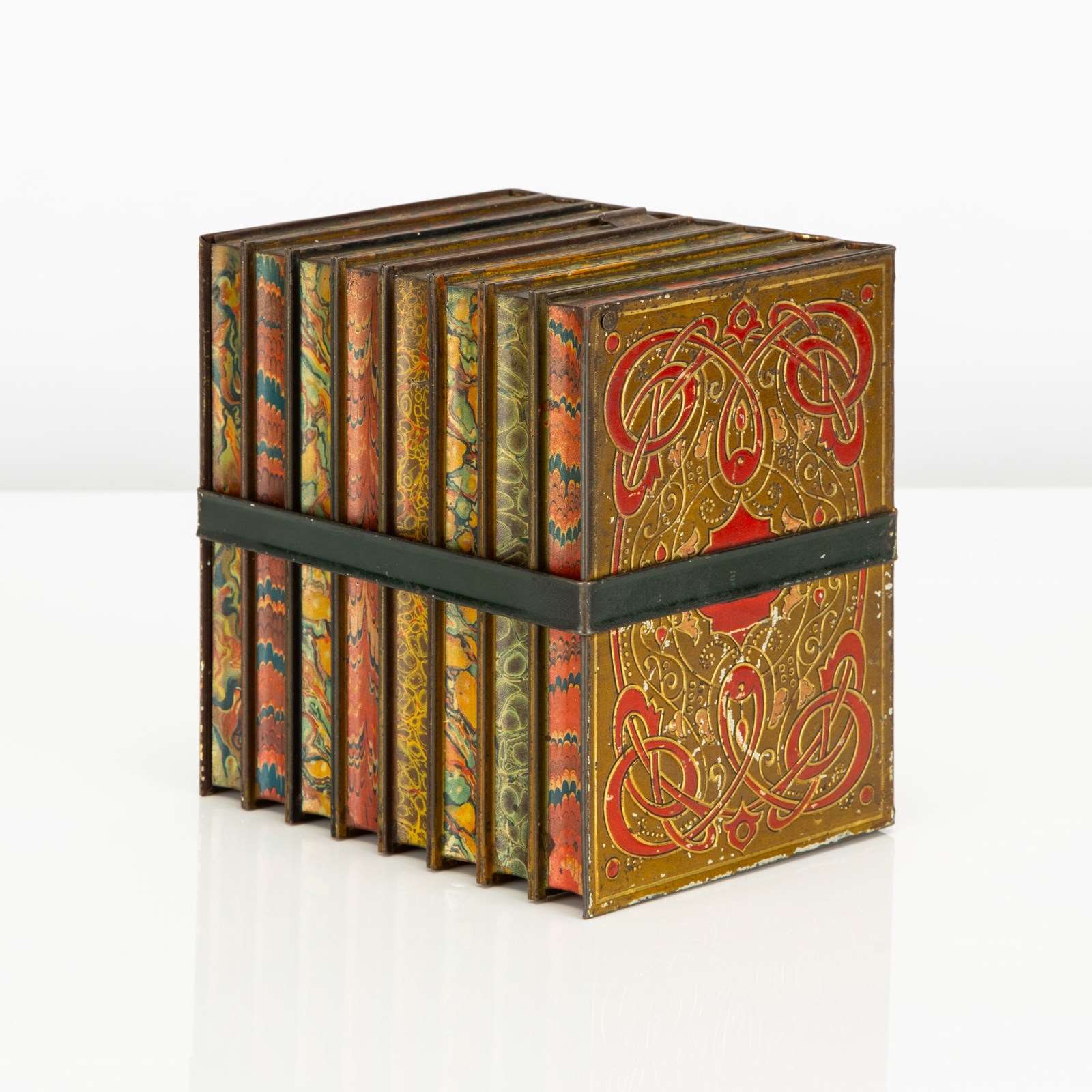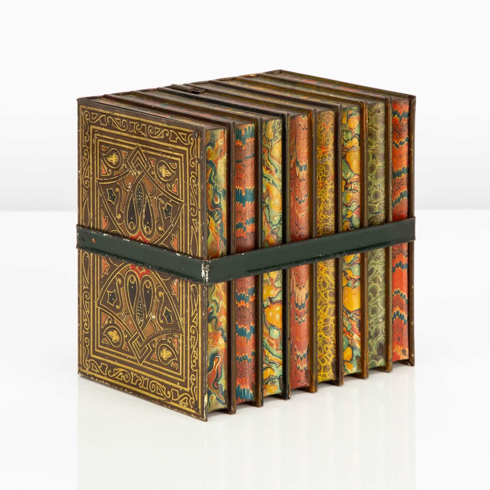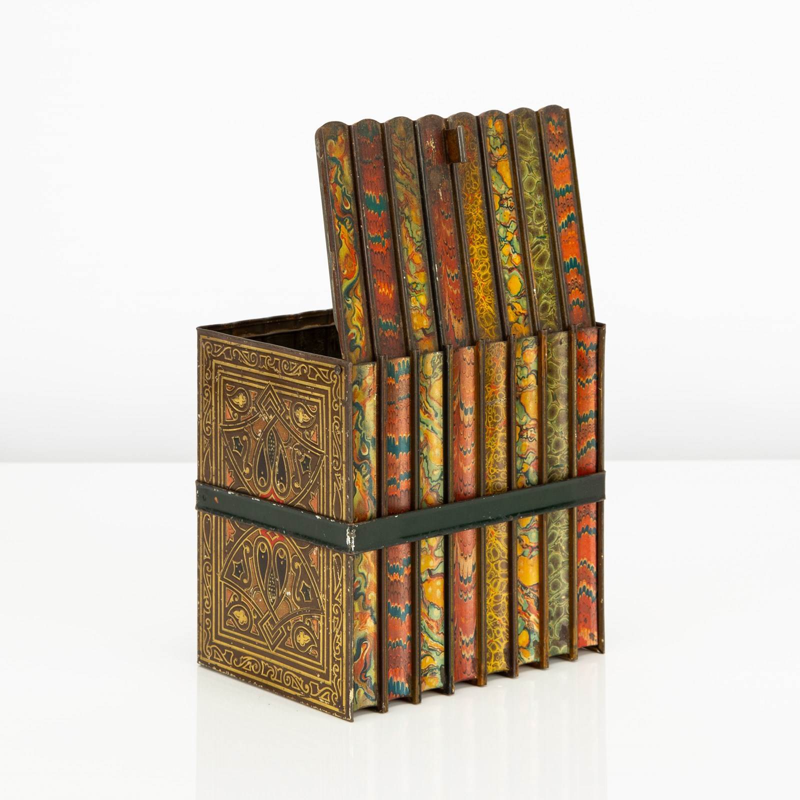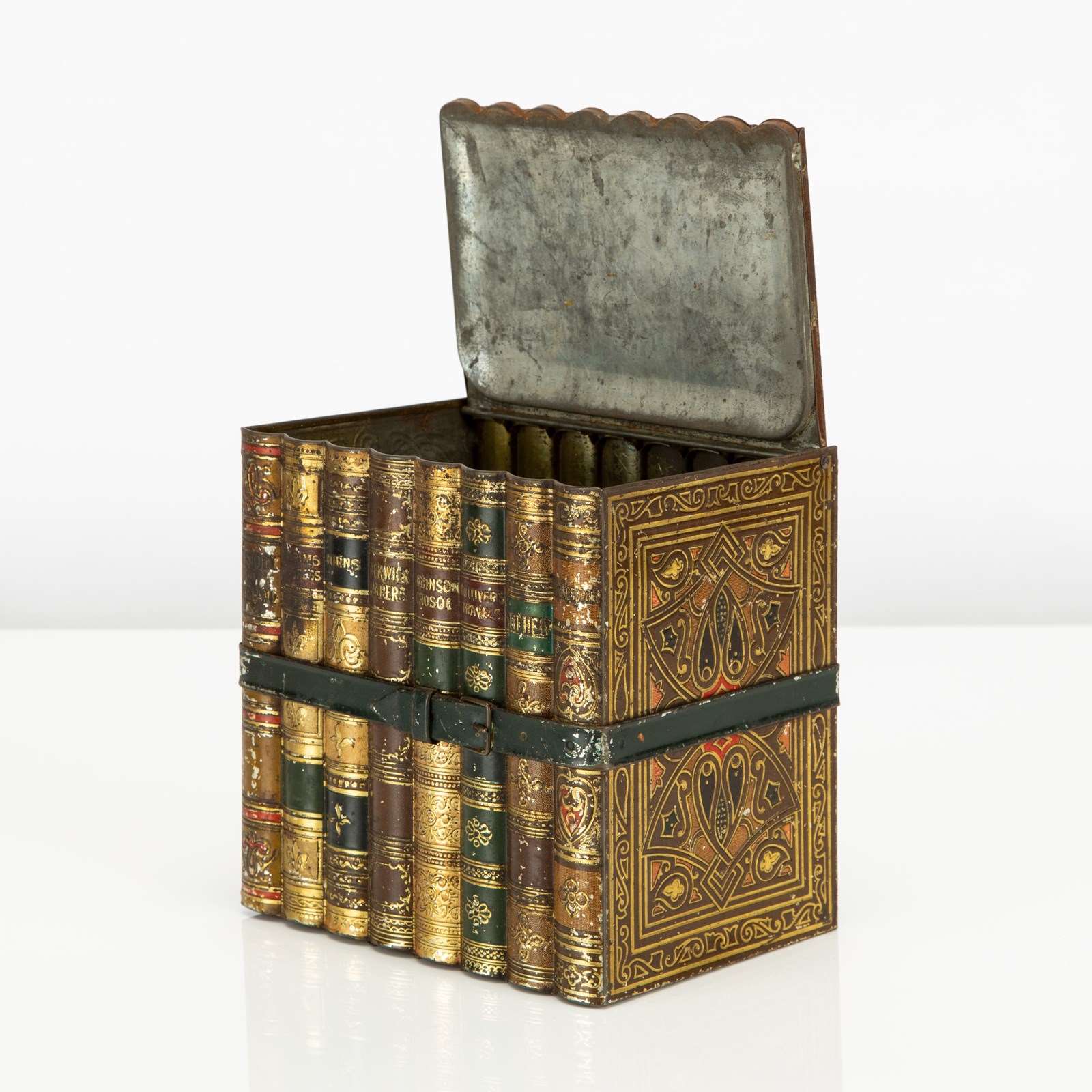 Here we have a good example of one of Huntley and Palmers' highly desirable 'book' biscuit tins. This biscuit tin is fabricated to look like an eight volume book set of classic literature titles, bound by a leather and buckled carrying strap. There is a small tin strap "bookmark" to open the hinged lid. The sides feature wonderfully detailed faux leatherwork book covers and the top, reverse and base are decorated in a wonderfully vibrant 'marbling' - the base is subtly marked 'Huntley & Palmers Biscuits, Reading & London'
