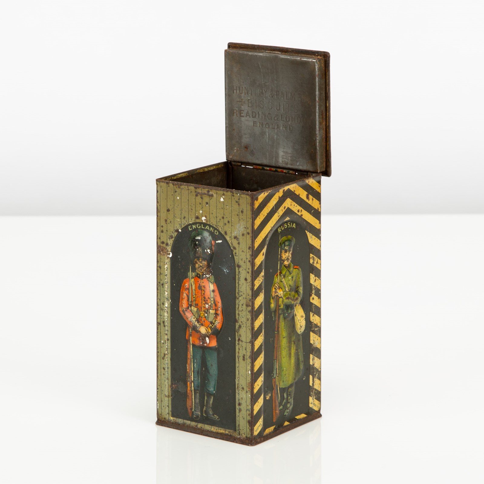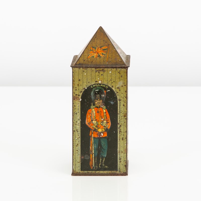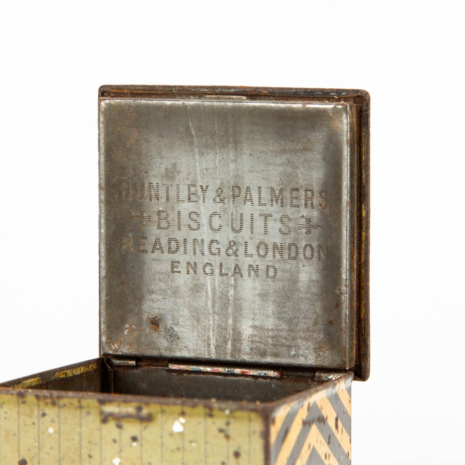 Huntley & Palmers were probably the most creative when it came to the design of their tins. This, the Sentry Box tin, was first designed in 1909 and featured a German soldier. In 1913 it was re-designed with a Belgian soldier in his place (as seen here), as diplomatic relations with Germany were becoming strained. This tin was manufactured by Huntley Boorne & Stevens for Huntley & Palmer.