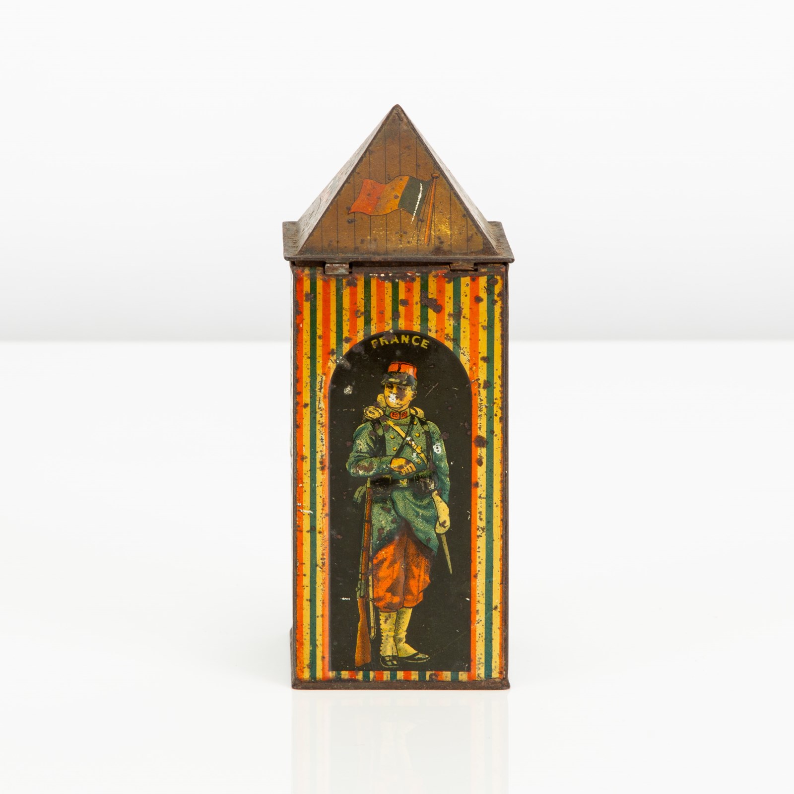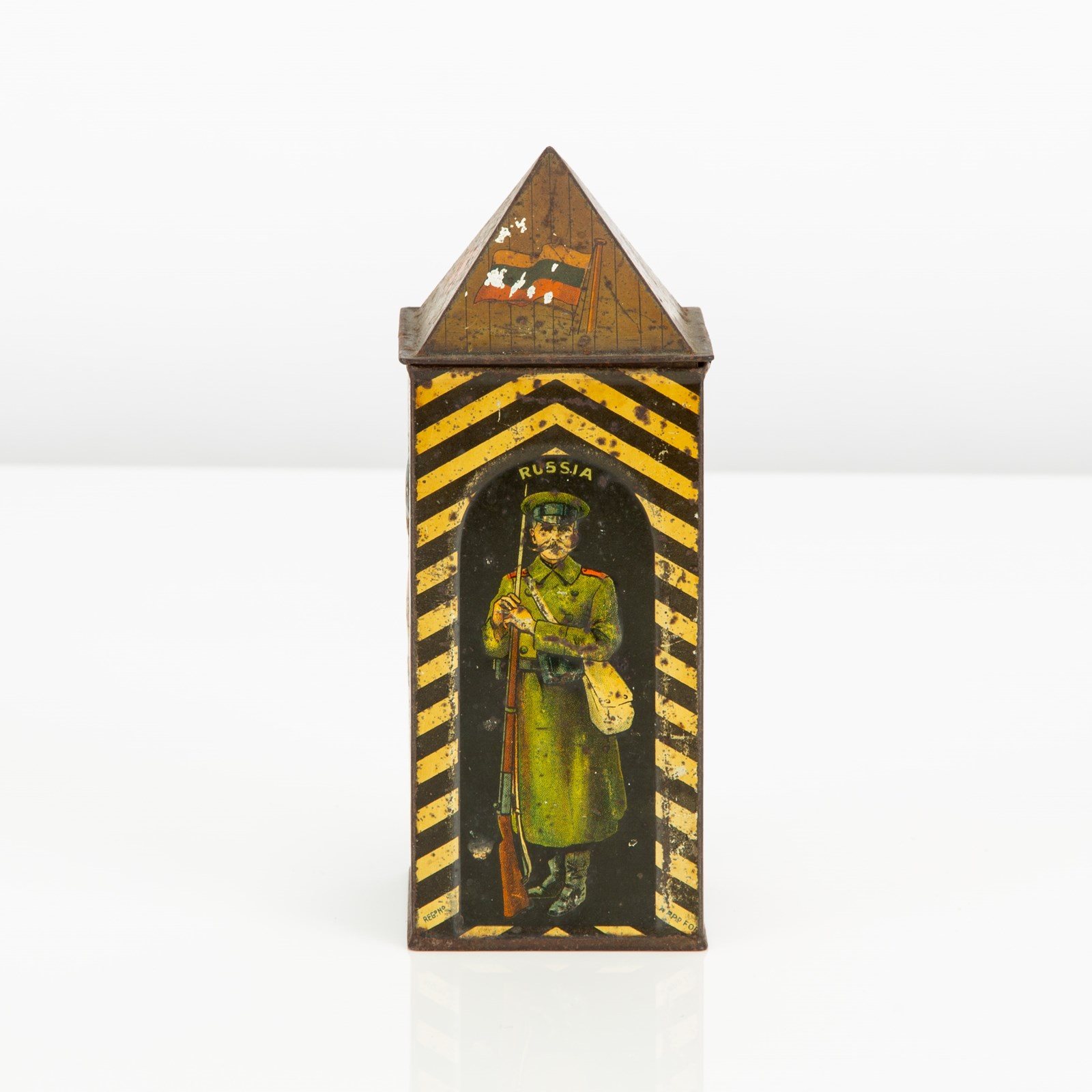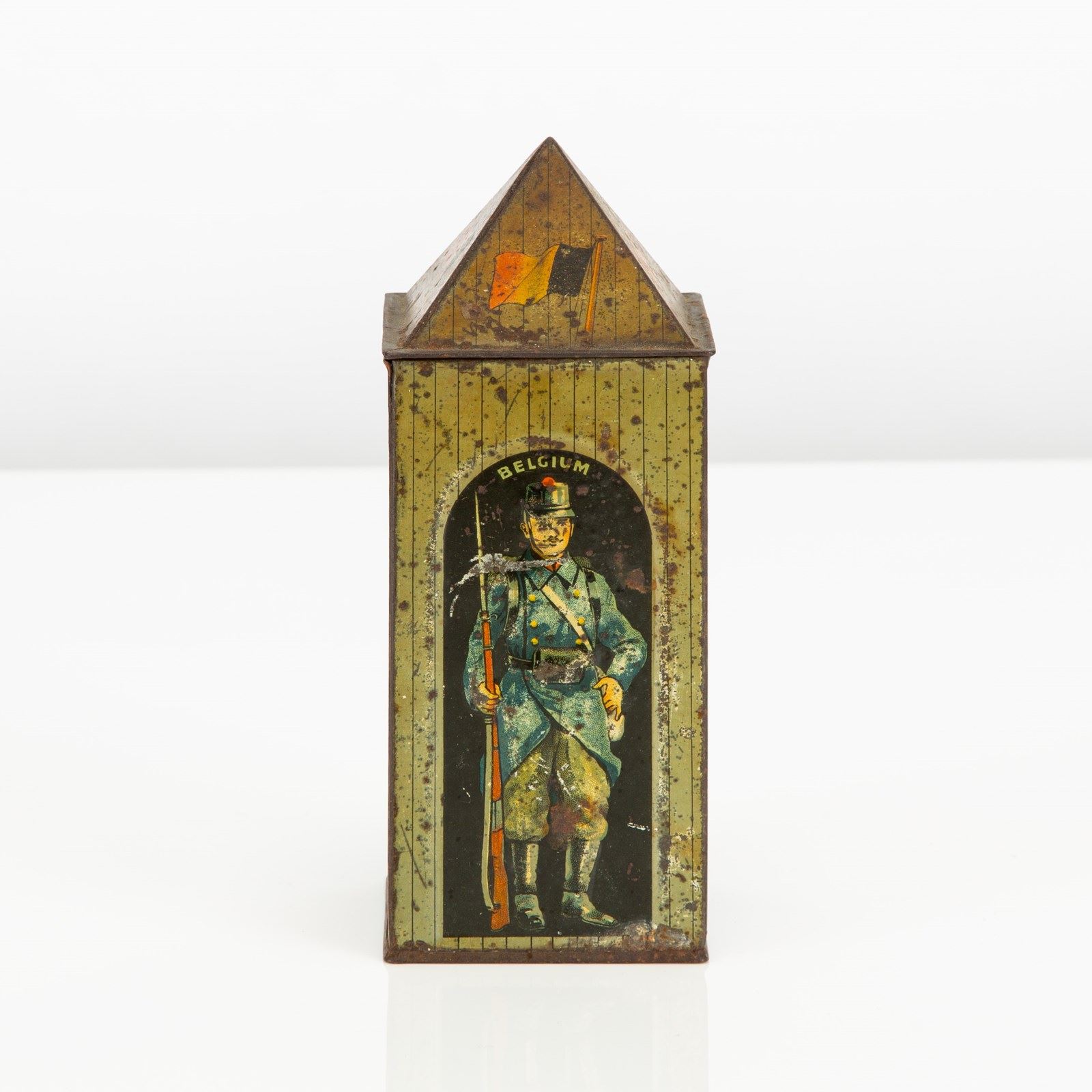 Huntley & Palmers were probably the most creative when it came to the design of their tins. This, the Sentry Box tin, was first designed in 1909 and featured a German soldier. In 1913 it was re-designed with a Belgian soldier in his place (as seen here), as diplomatic relations with Germany were becoming strained. This tin was manufactured by Huntley Boorne & Stevens for Huntley & Palmer.