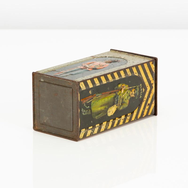 One of the less common designs - this example has survived the past century or so in reasonable order; the lid remains attached, there are no major knocks / dents and all sides remain reasonably bright / legible. There are some losses / scratches, some surface corrosion and some fading / yellowing but this would have to be considered a reasonably good example and the price reflects the fact that it does show signs of wear.