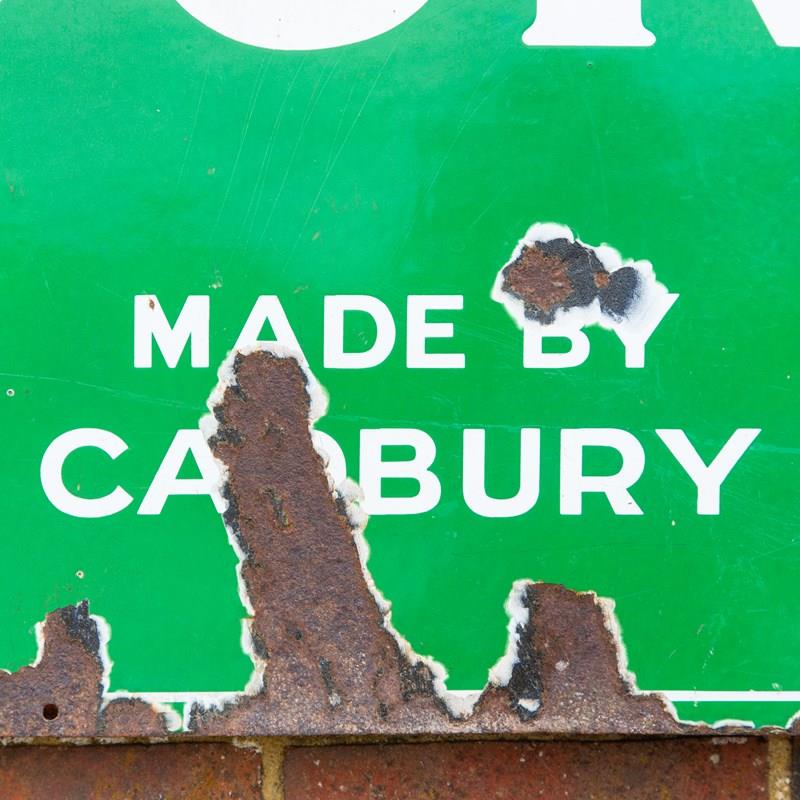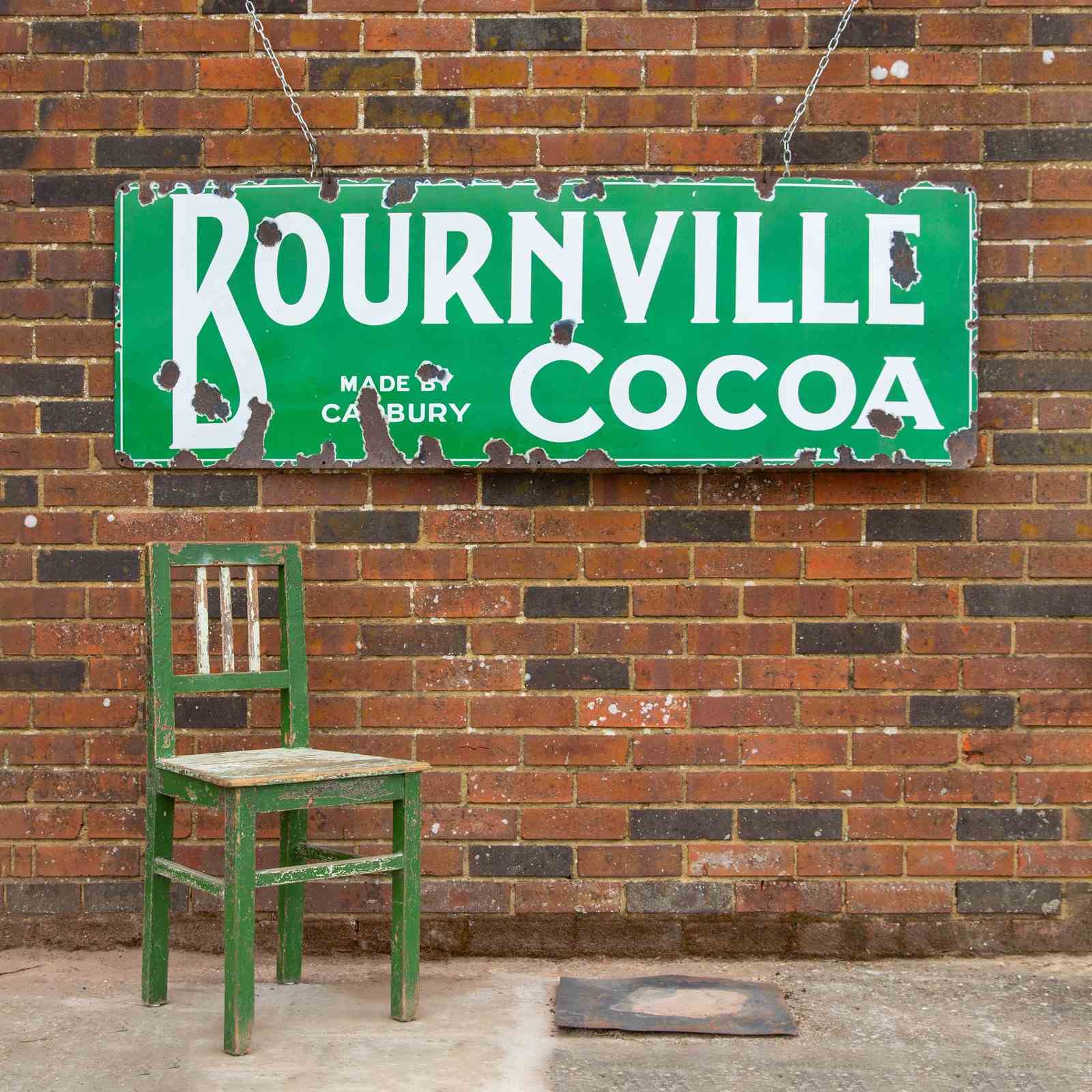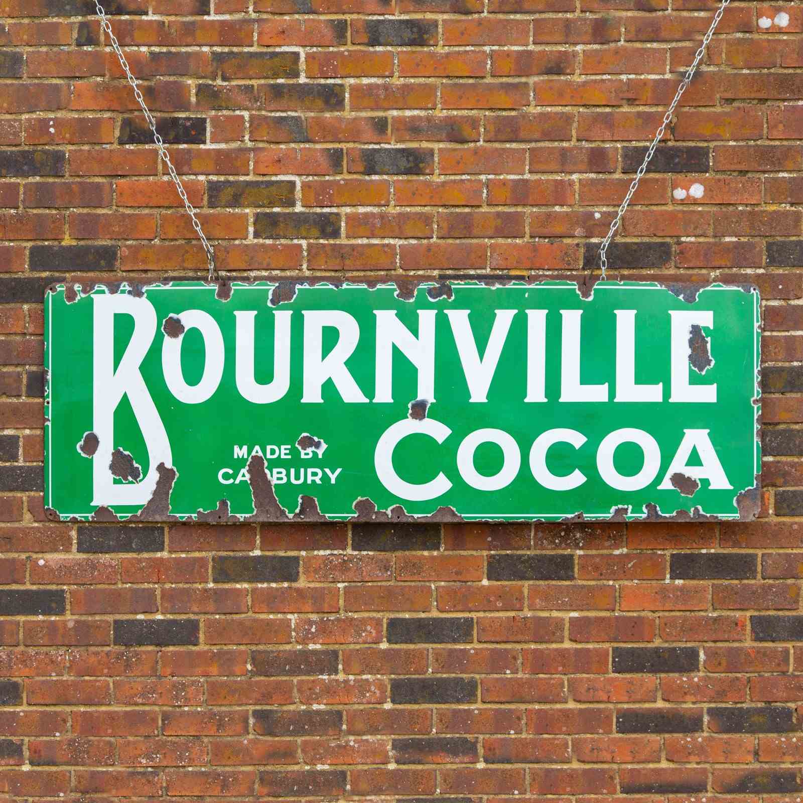 Bournville Cocoa powder has been on sale since 1906 ... this impressive, 6ft wide enamel sign is likely to date to the 1930s/'40s. It has the remnants of the original, in-house manufacturer marks in the lower corners (size + produced by 'Cadbury, Bournville. Eng.').