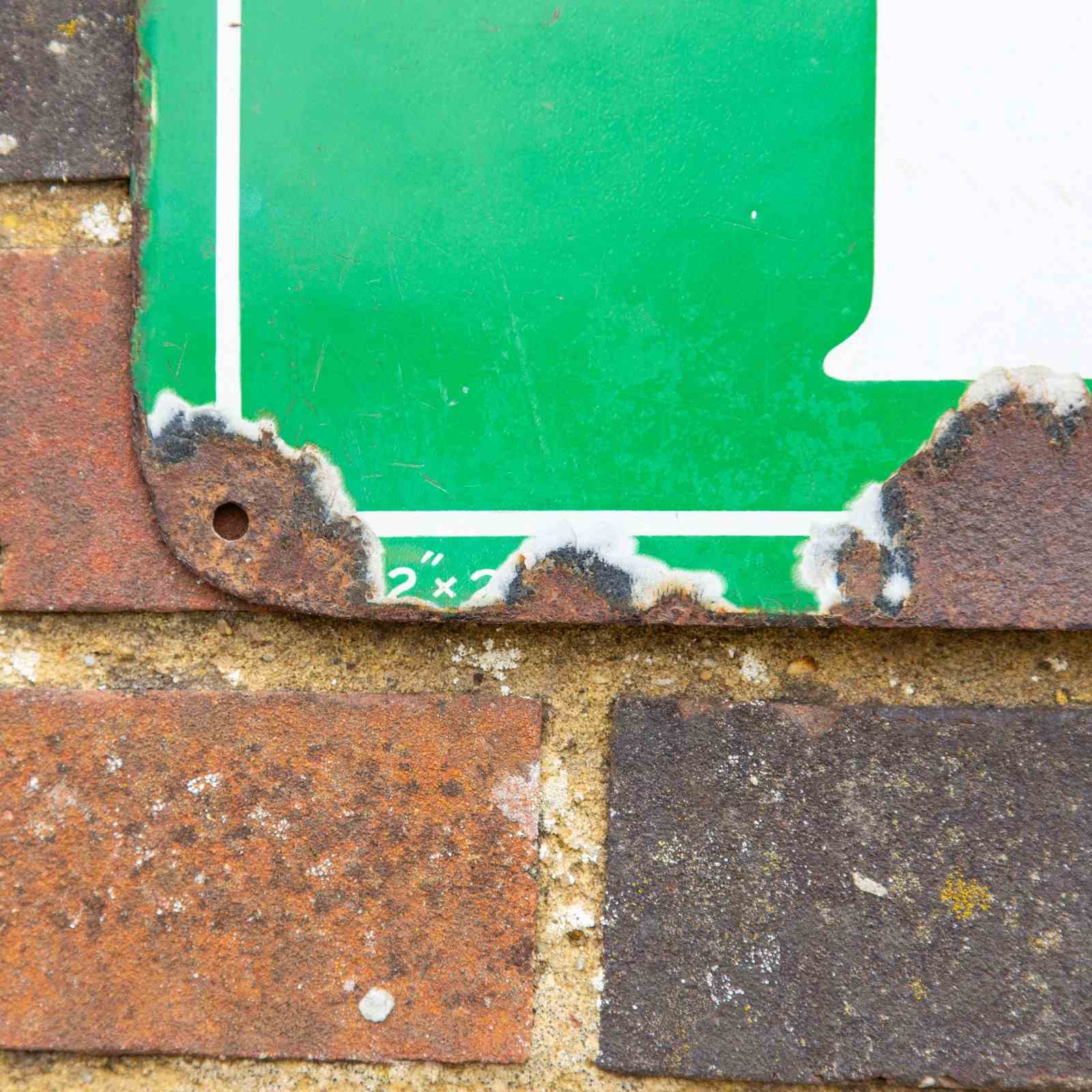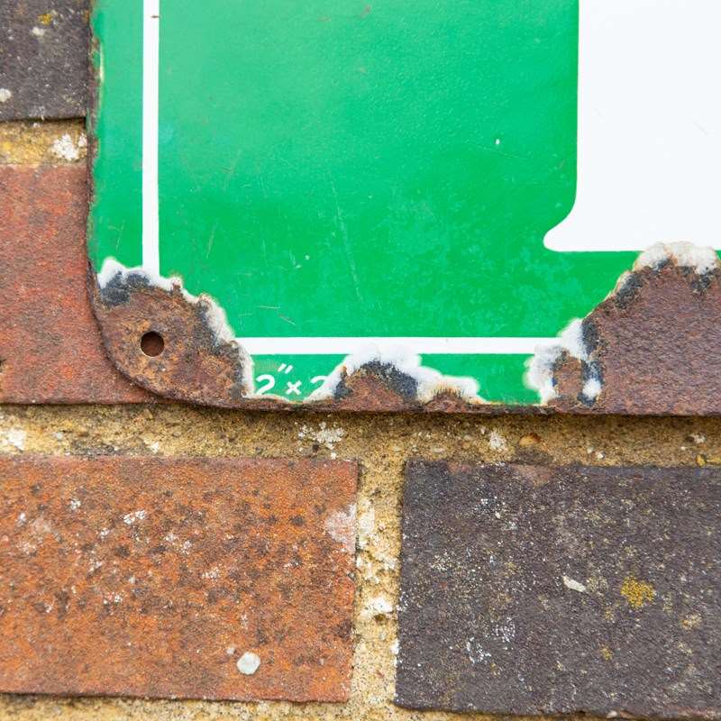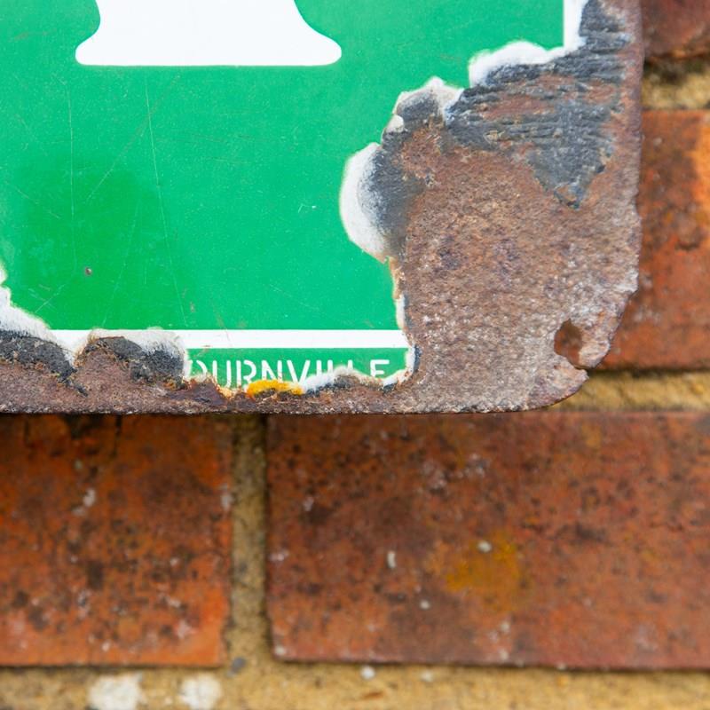 A real statement piece; it remains bright, with a decent gloss. Though there are plenty of patches of enamel loss, this doesn't overly affect the legibility or impact of the piece. It can be hung using the original mounting holes and displays well.