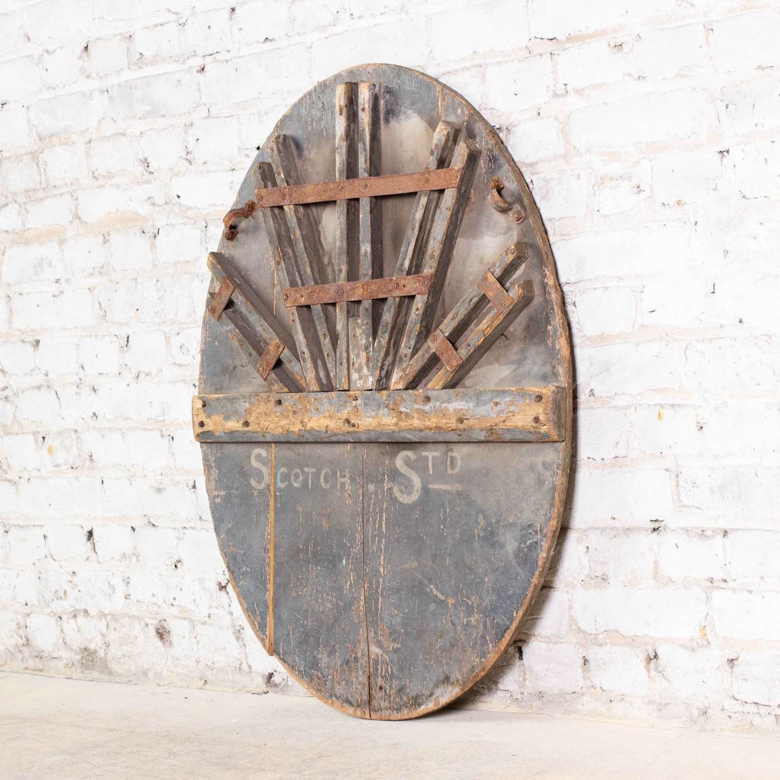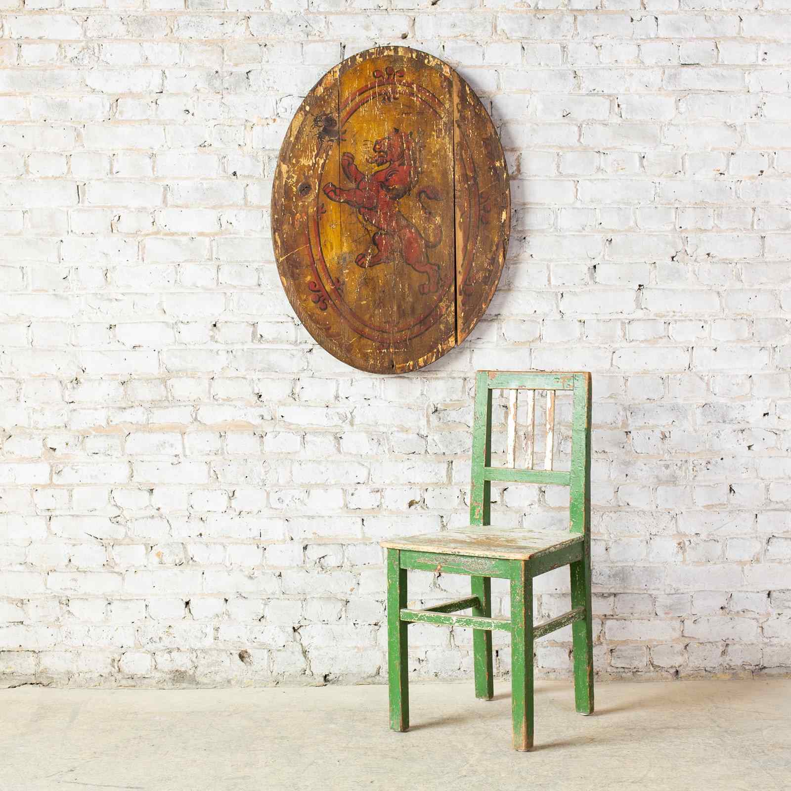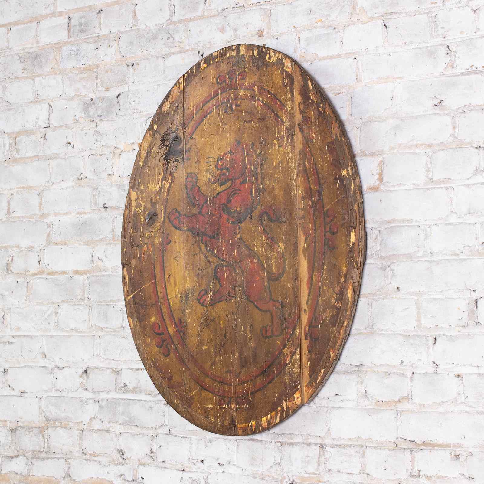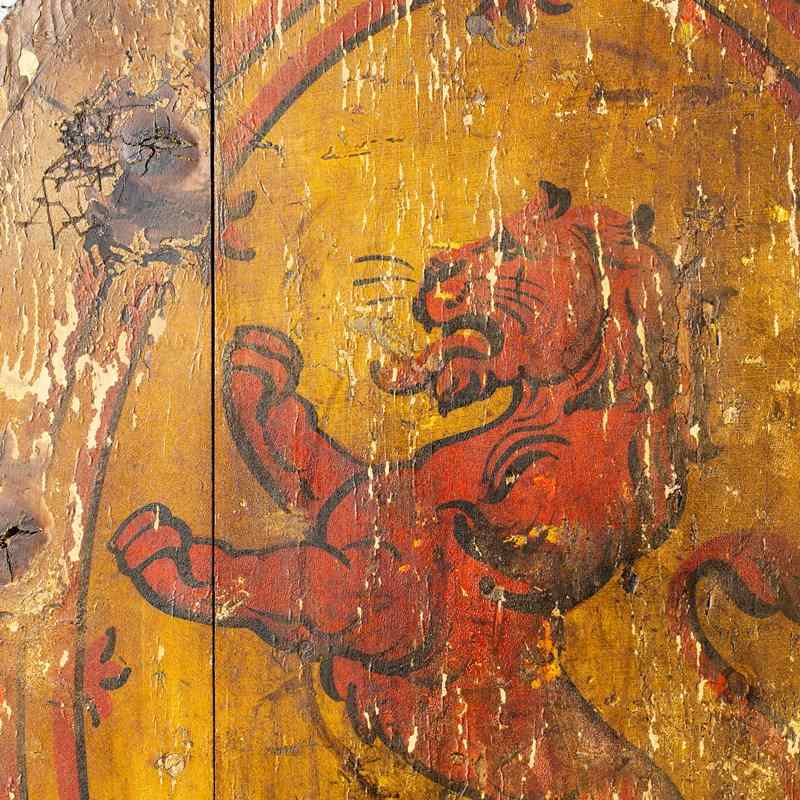 The Lion Rampant is considered to be the symbol of Scotland's royalty. A beautifully stylised version of it is found painted on this wooden flag holder inscribed to the reverse 'Scotch Std' and perhaps made for display during a royal event such as a coronation.