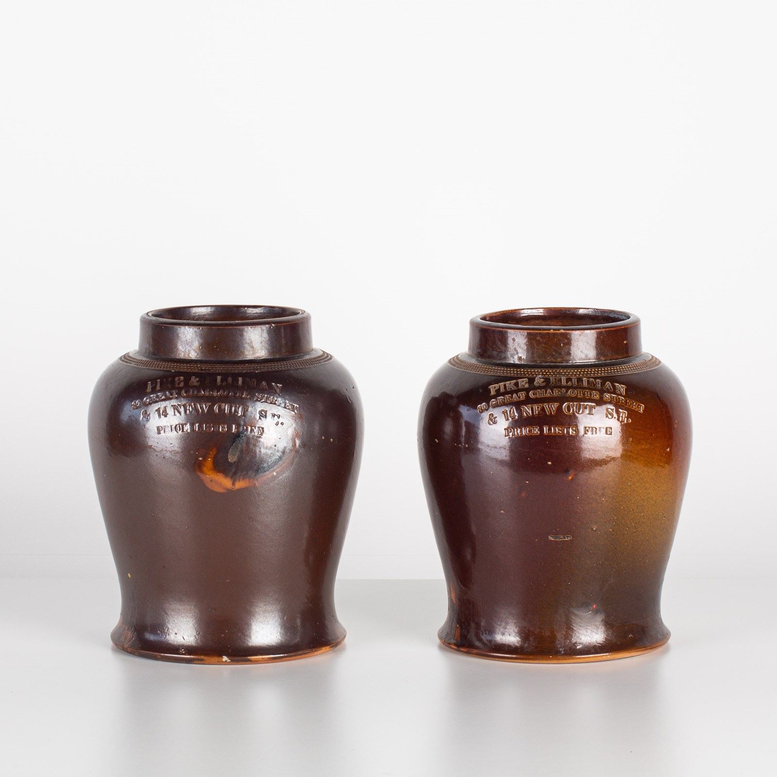 A lovely pair of Stiff & Sons stoneware tobacco jars inscribed 'Pike & Elliman, 82 Great Charlotte Street, 14 New Cut SE., Price Lists Free'.