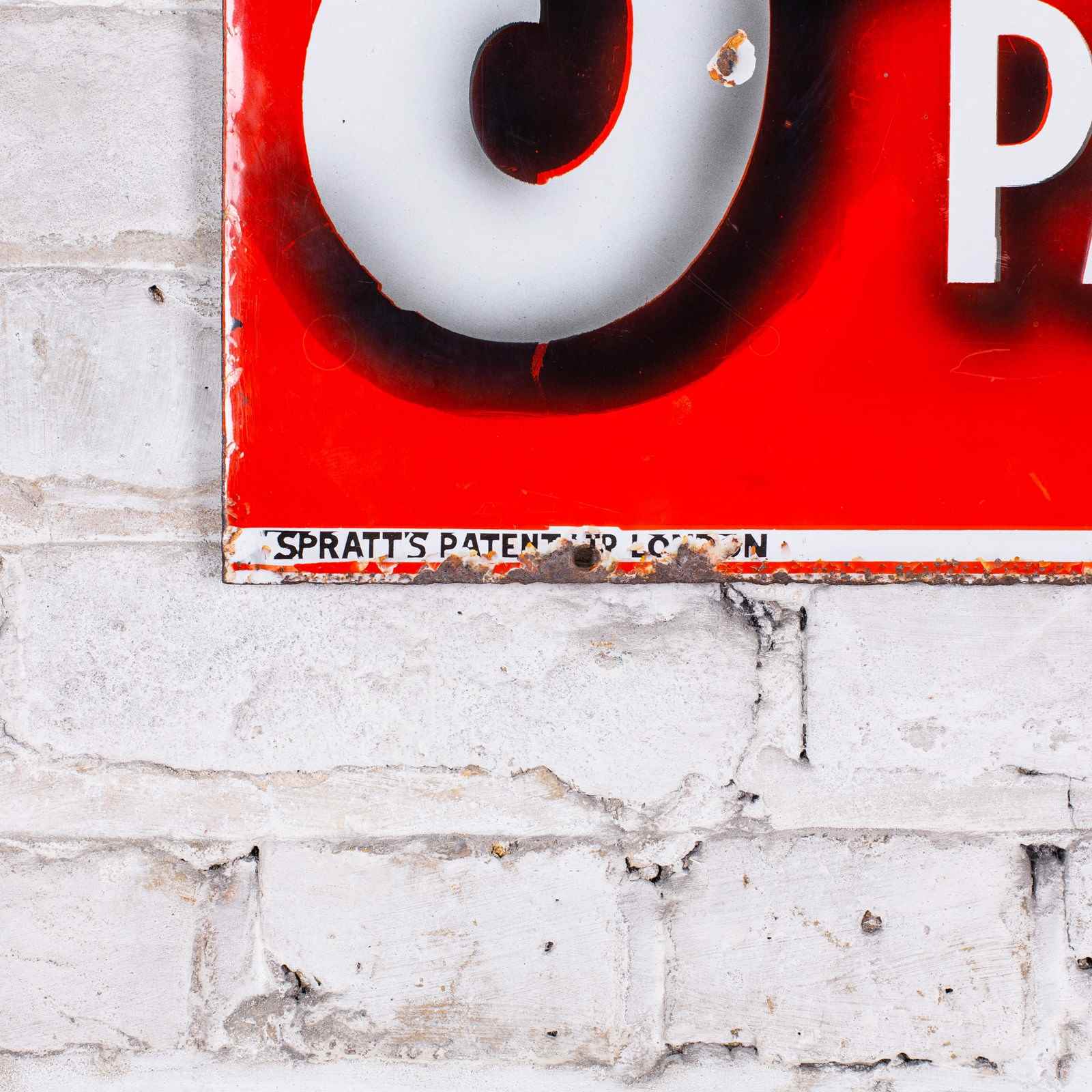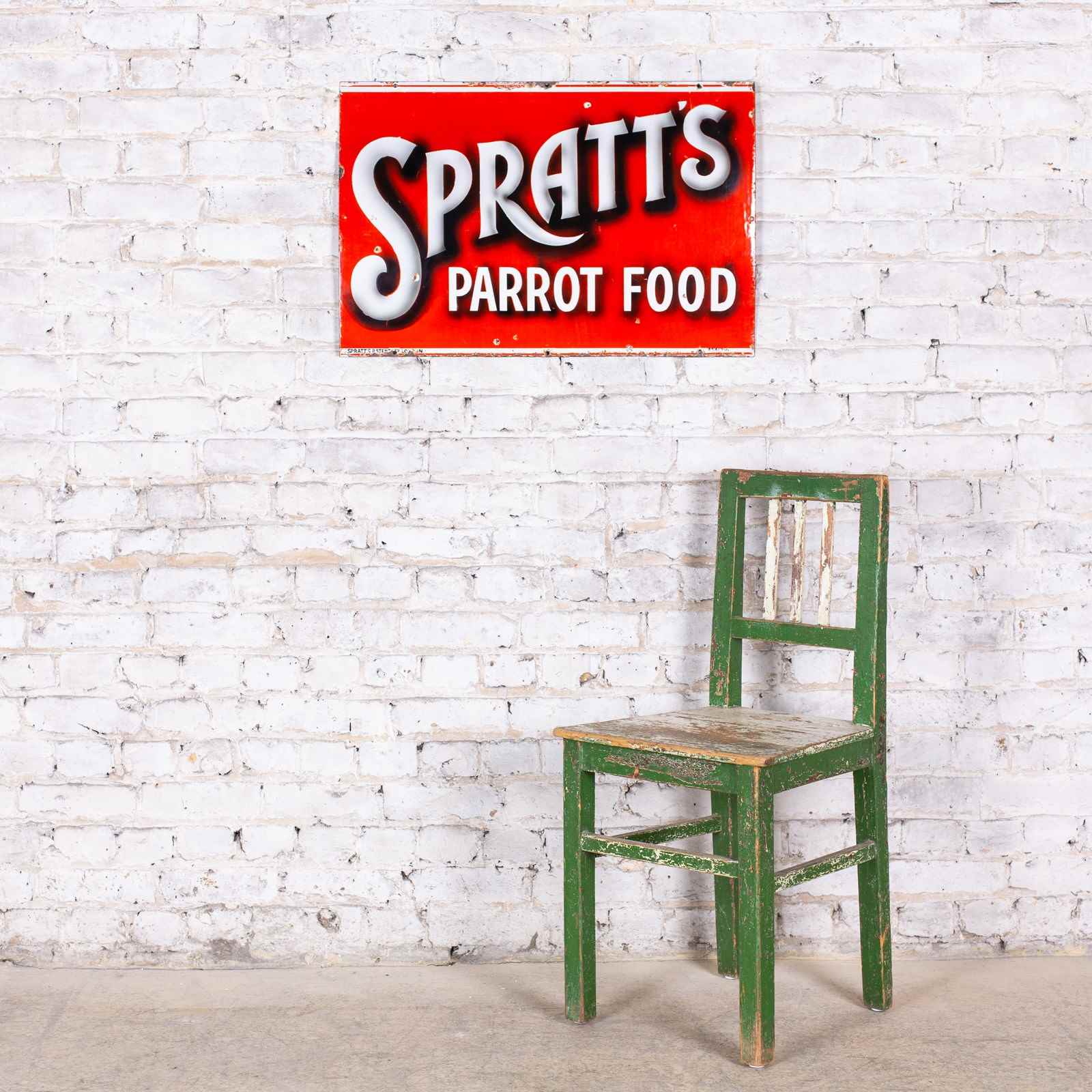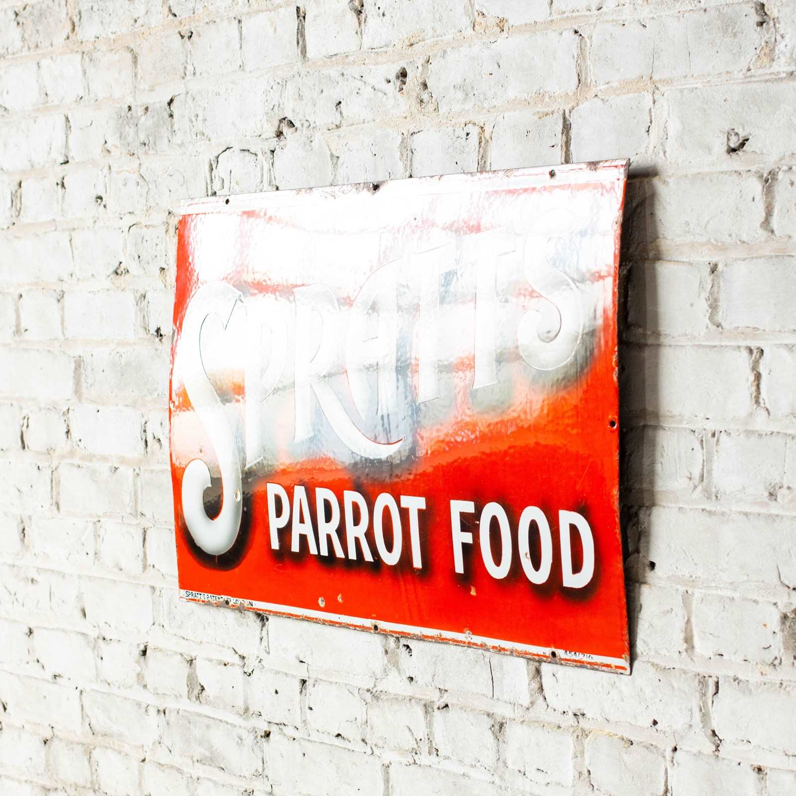 The production number in the lower right corner of this sign shows that it was produced in July 1910 which correlates to the Victorian / Edwardian fashion for keeping parrots as pets. A lovely, early example of enamel signage which, like many of Spratt's early signs, has beautiful shading and shadowing around the typography. Spratt's produced their own signage and this is marked as such in the lower left.