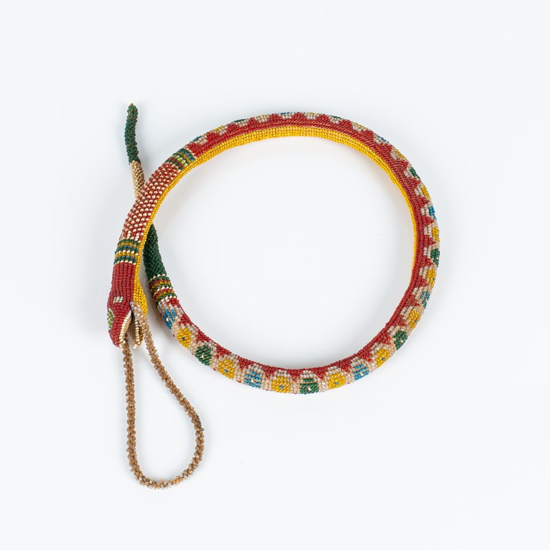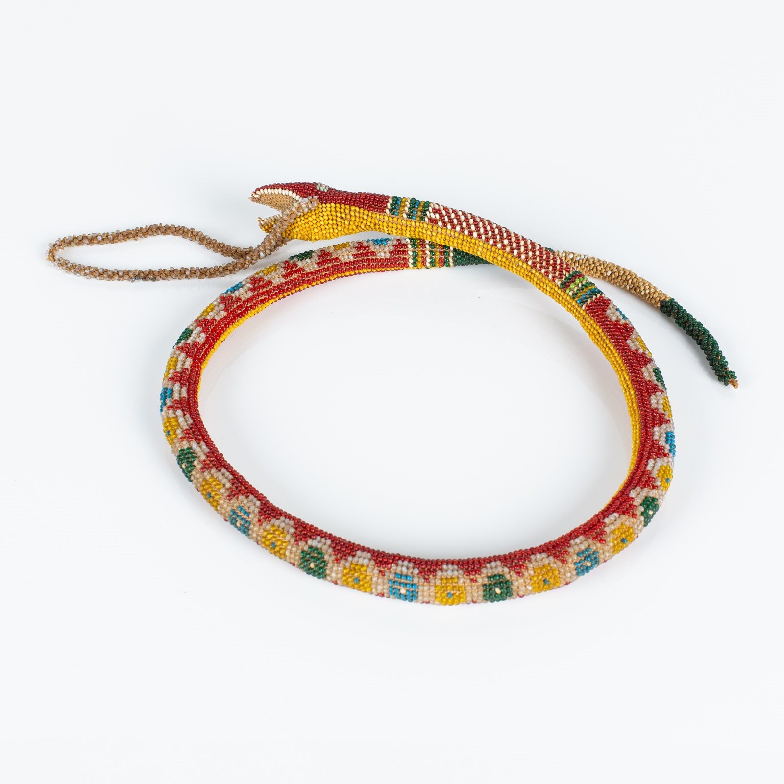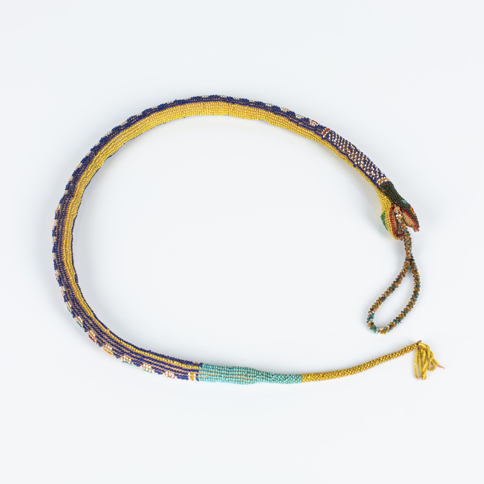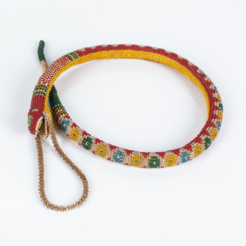This snake is made from crocheted beadwork and is stuffed with horsehair, cotton or cloth. Turkish prisoners of the British produced this type of beadwork during the First World War (1914-1918). They were made to be traded or sold (and probably to alleviate some of the boredom).