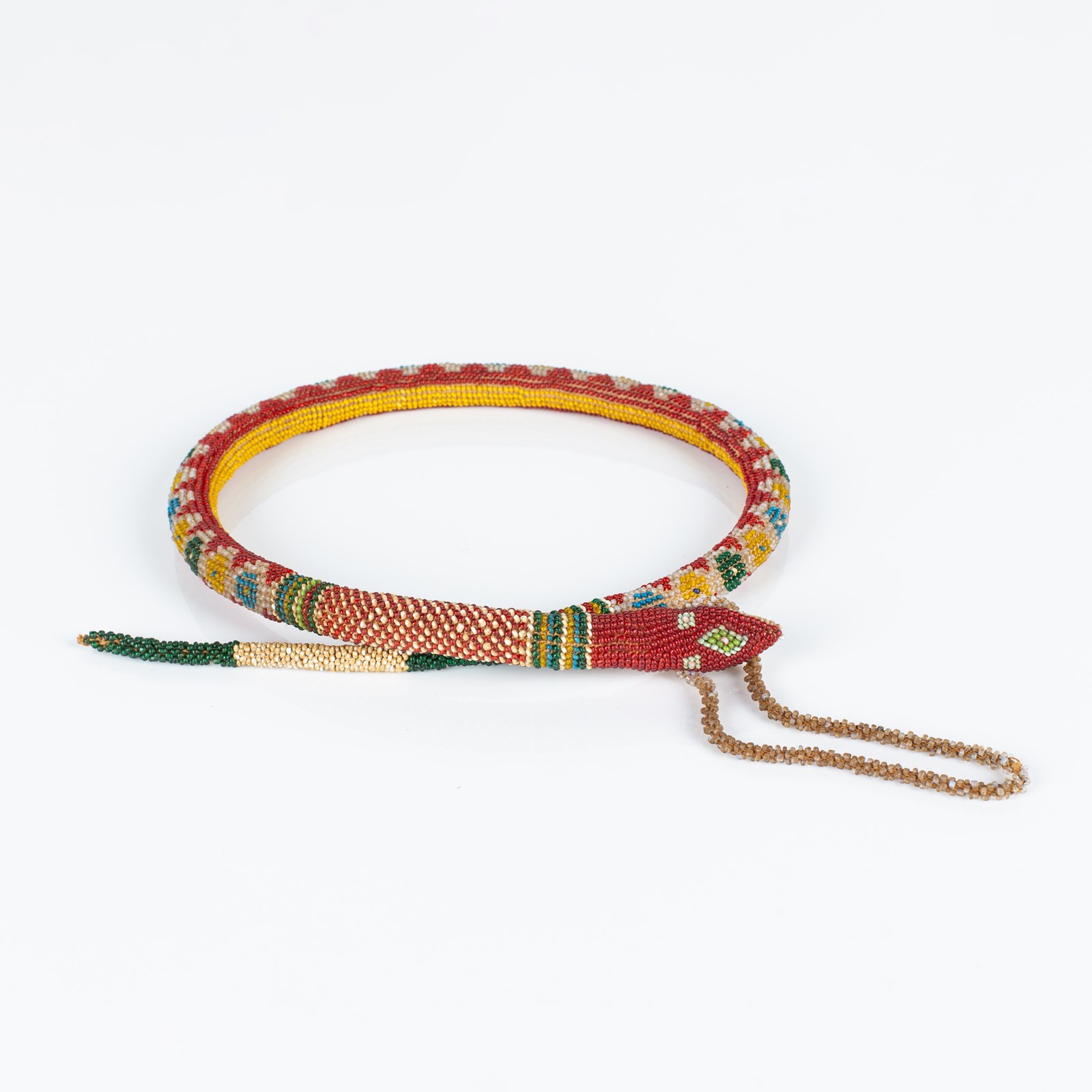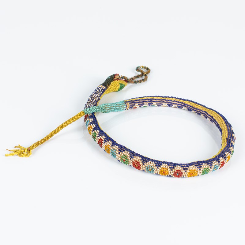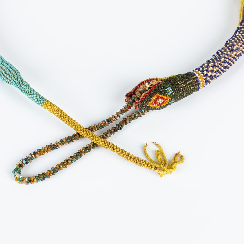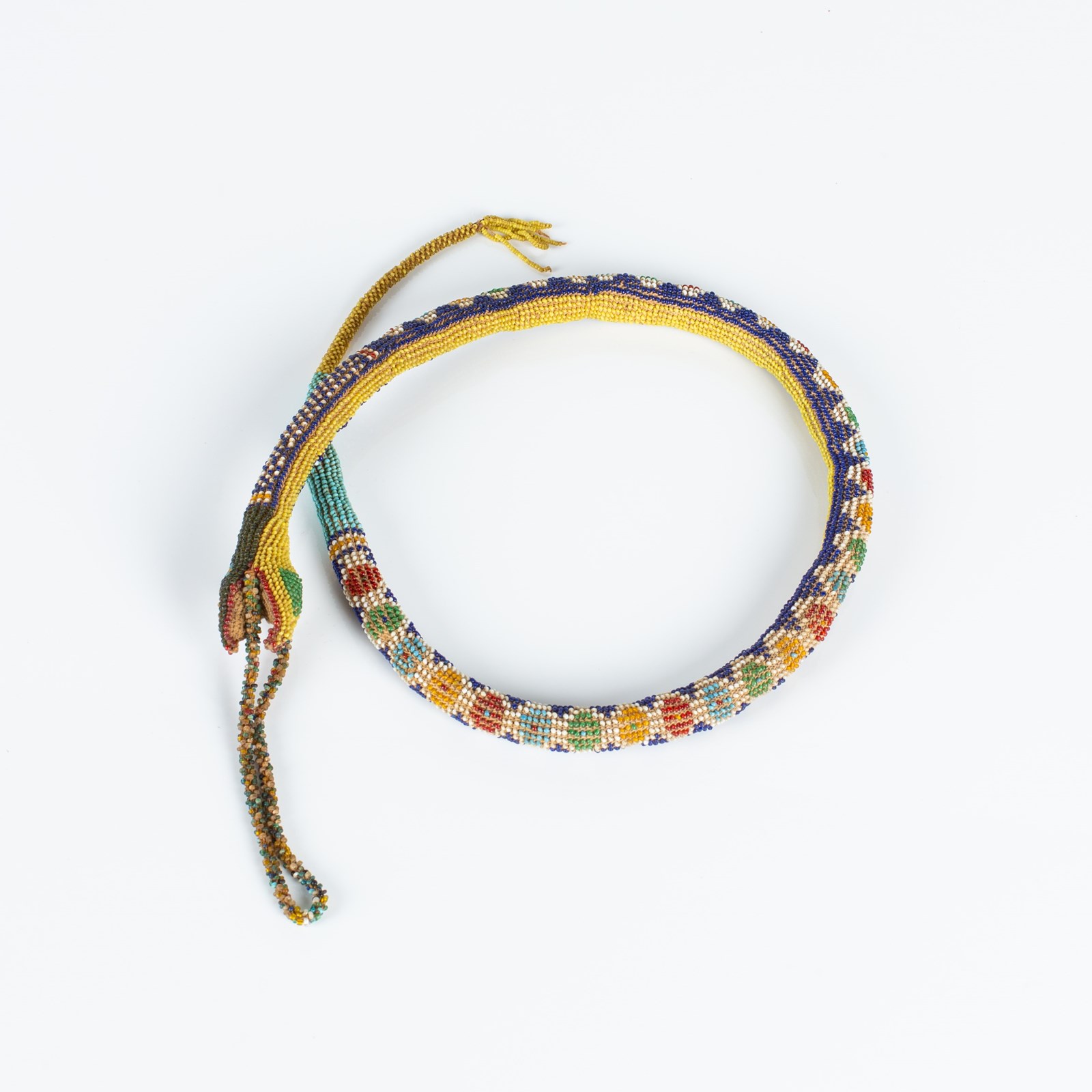 This snake is made from crocheted beadwork and is stuffed with horsehair, cotton or cloth. Turkish prisoners of the British produced this type of beadwork during the First World War (1914-1918). They were made to be traded or sold (and probably to alleviate some of the boredom).