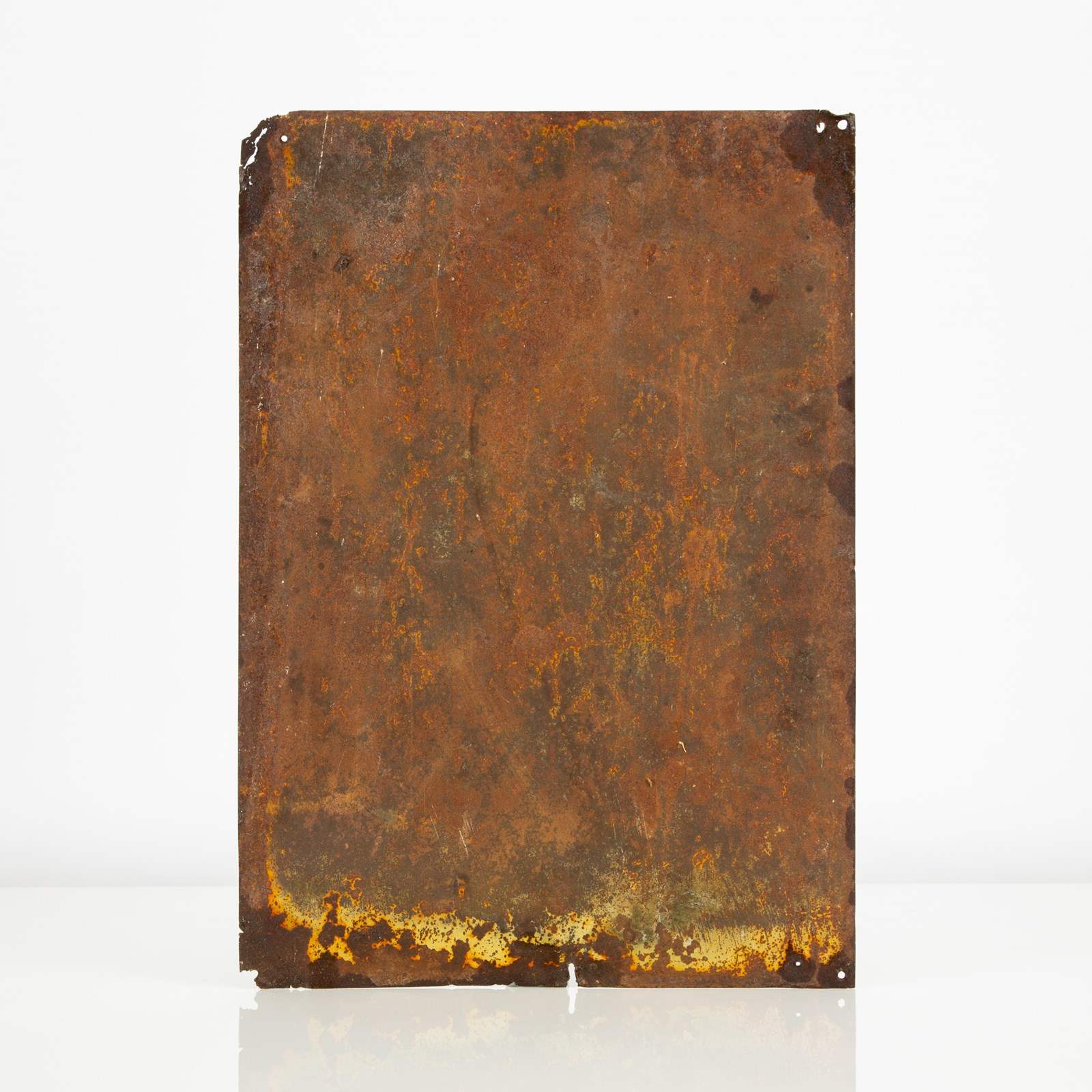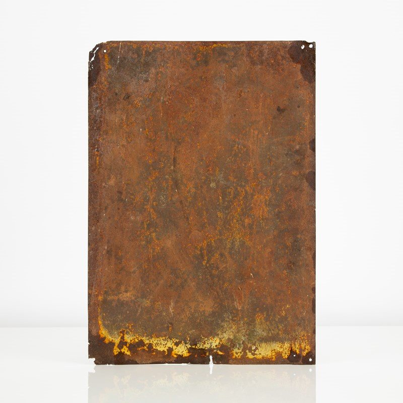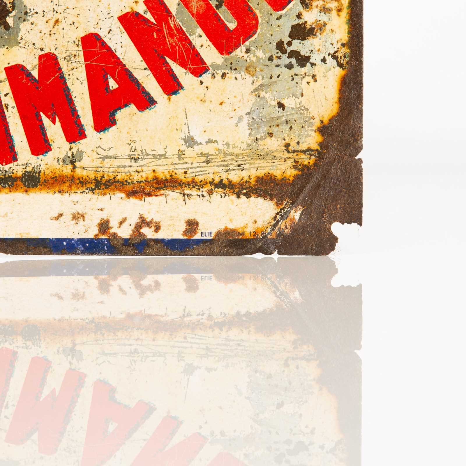 The sign was produced by Parisian litho-printers Elie Mardini and probably dates to the 1950s/'60s. These tin signs were never as hardy as their enamel counterparts and this example certainly shows the effects of decades exposed to the elements (and looks all the better for it). Looking at other examples it would seem that there was originally a gold-foiled layer used for the lettering at the steering wheel - this has worn away entirely leaving the exposed base metal to rust and darken... All but the lower left corner have worn and the sign has had additional mounting holes drilled. There are scuffs, scratches etc etc but that's all part of this sign's charm. It displays very well.