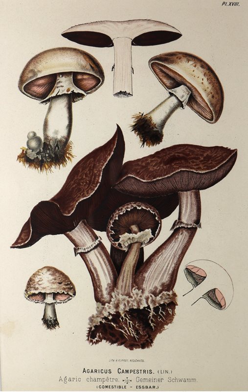 Fritz Leuba (1848-1910) was a mycologist and artist from Neuchatel, Switzerland. ‘Les Champignons Comestibles et les Especes Veneneuses’ is a rare and beautiful work on mushrooms, presenting 52 of the most artistic and decorative prints of mushrooms in botanical illustration. All of the edible species are represented, including the exotic truffle & a few of the most well known poisonous species. The prints are titled with the scientific name given by Italian mycologist Giovanni Antonio Scopoli in 1772.