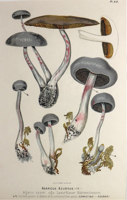 Two hand finished chromolithograph plates from the first edition of Fritz Leuba’s ‘Les Champignons Comestibles et les Especes Veneneuses’, published in Paris in 1890.