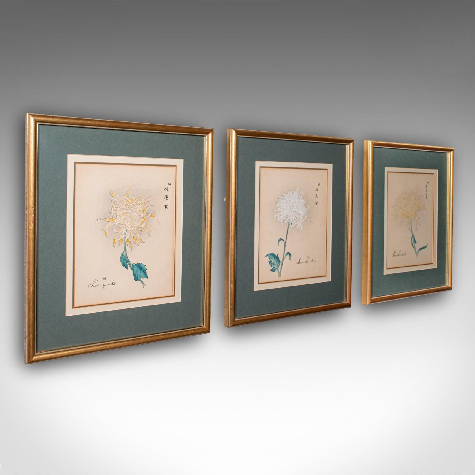 This is a trio of vintage botanical pictures. A Japanese, framed woodblock print in the manner of Keika Hasegawa, dating to the late 20th century, circa 1980.