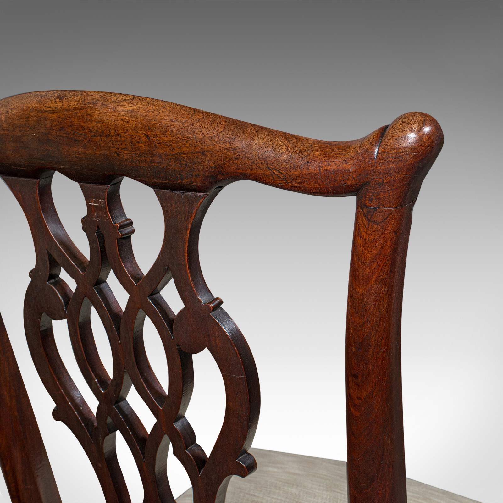 Striking, pierced ribbon back splat with quarterfoil fretwork in the Chippendale manner