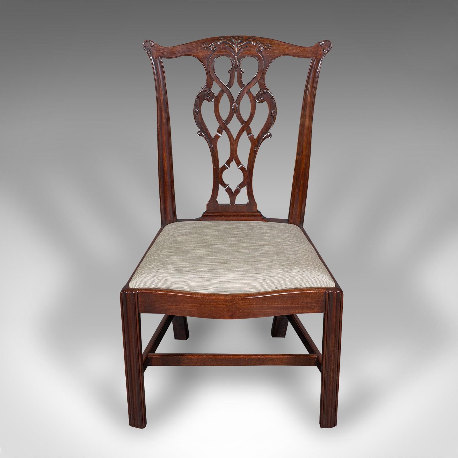 This is a set of four antique dining room chairs. An English, mahogany seat in the Chippendale manner, dating to the Georgian period, circa 1800.