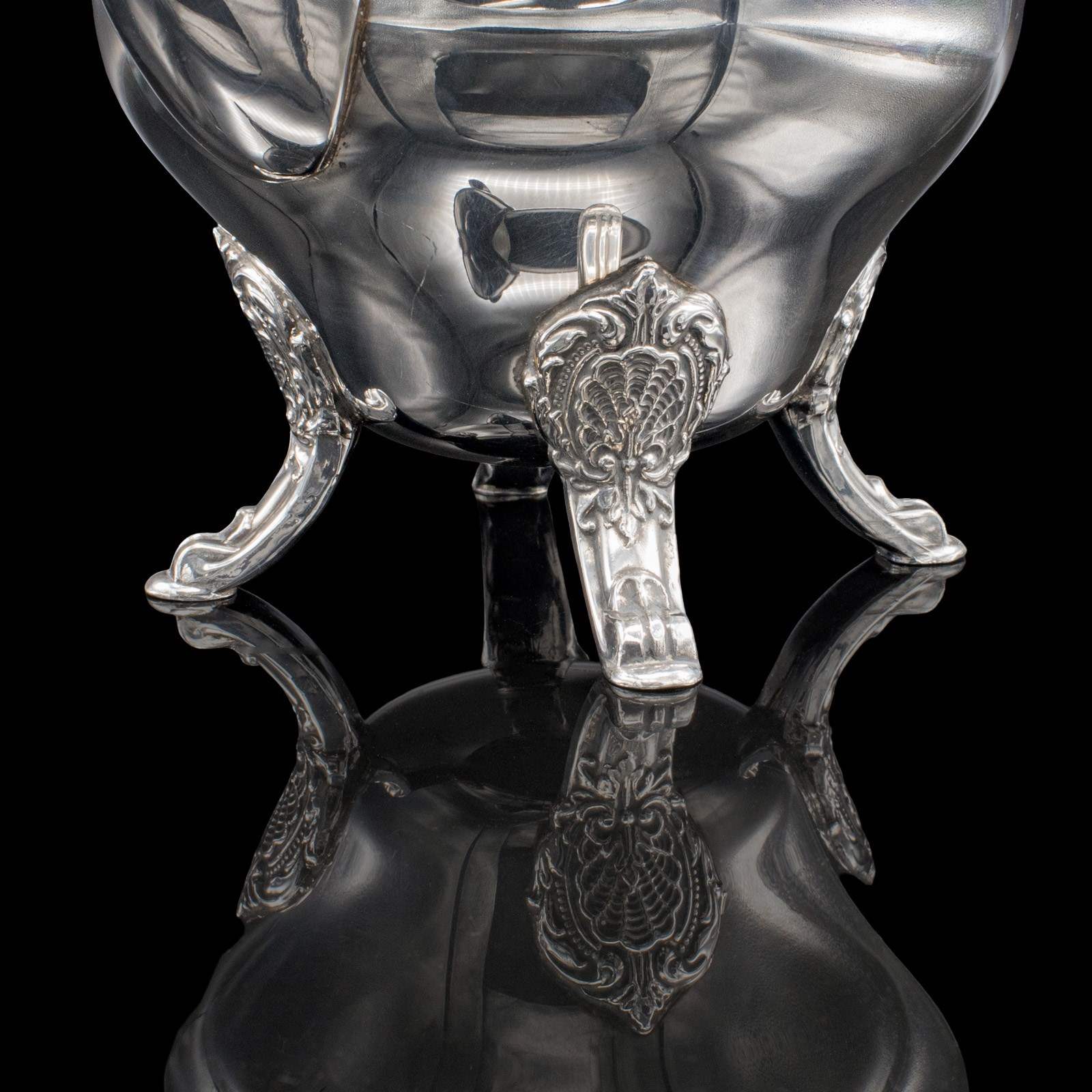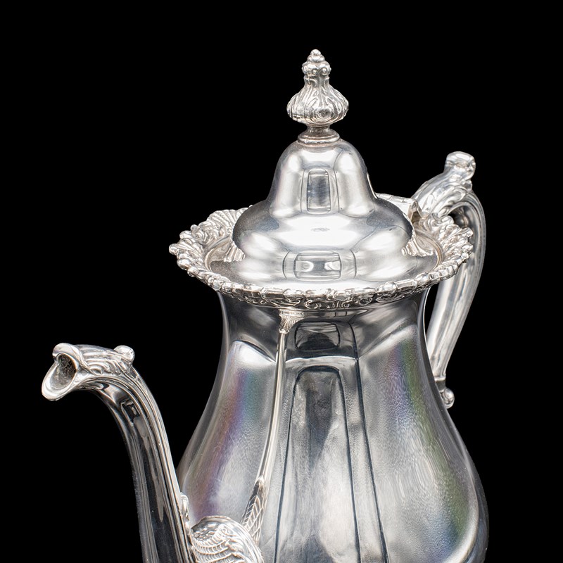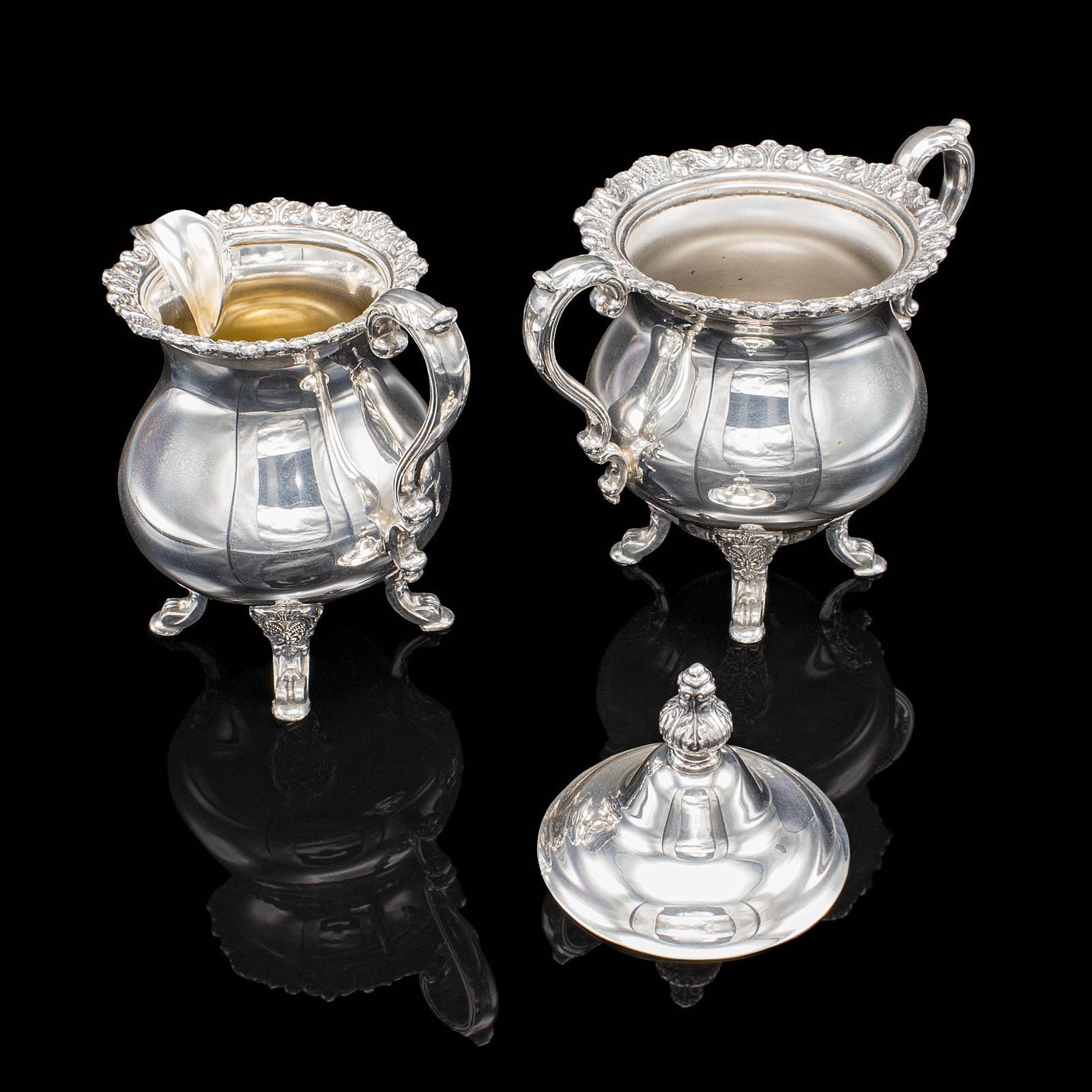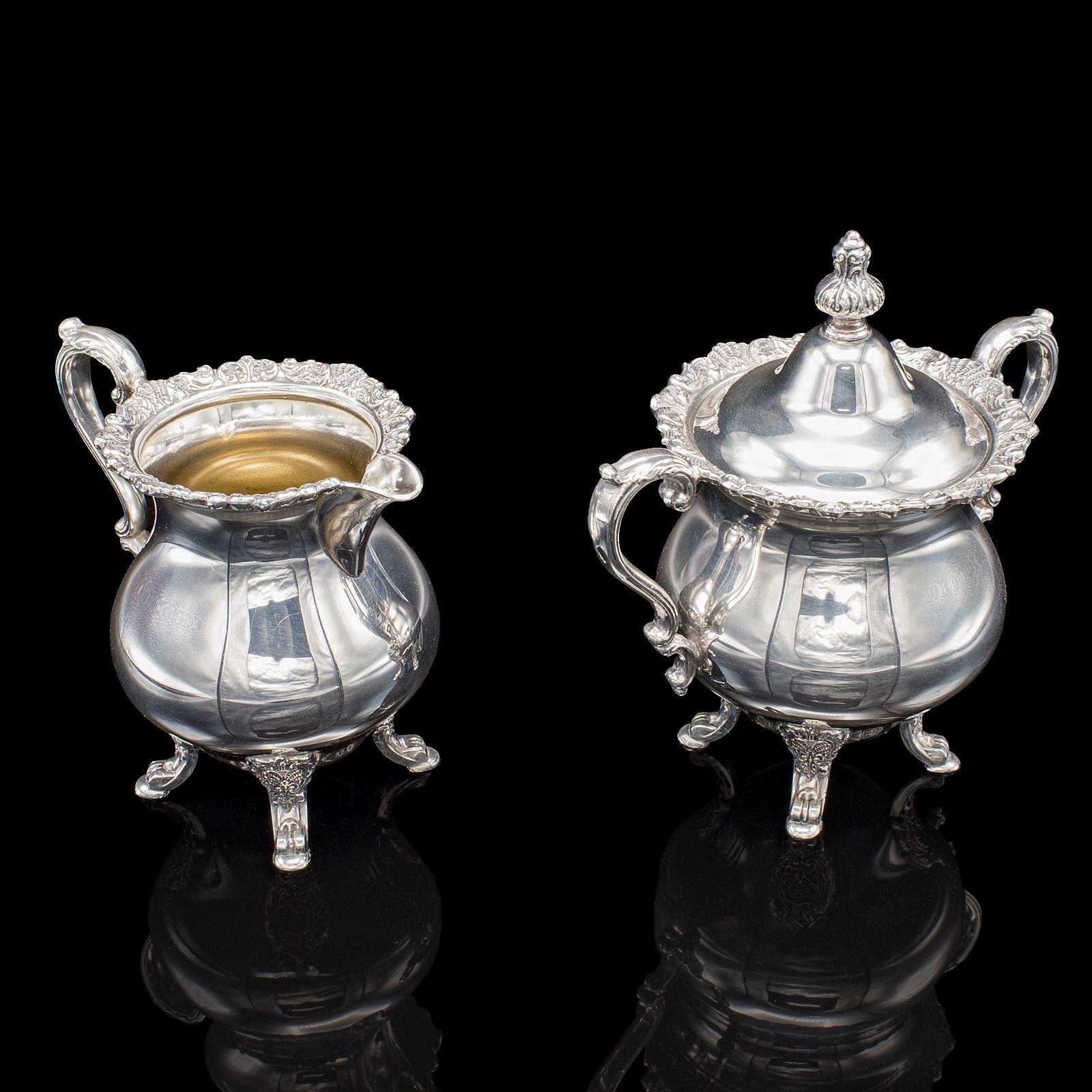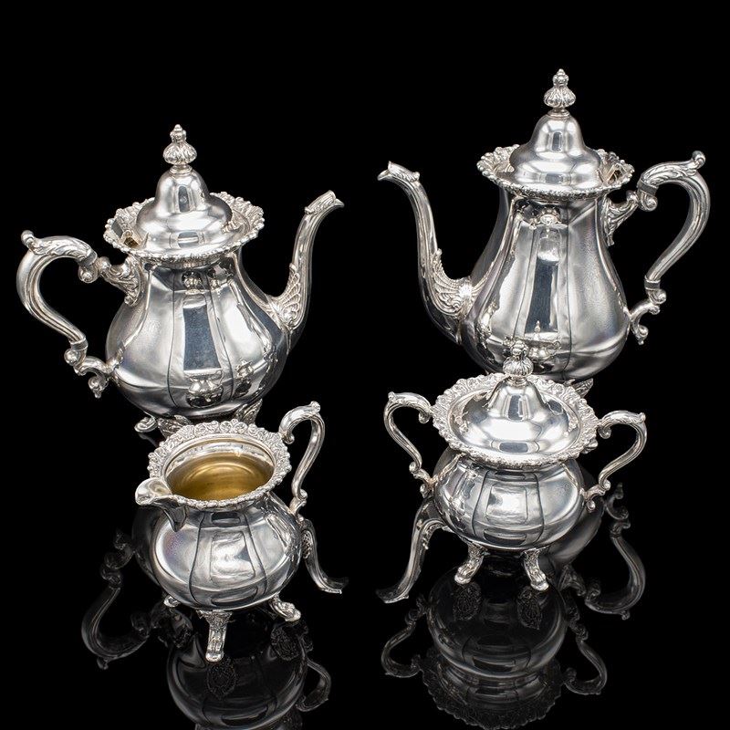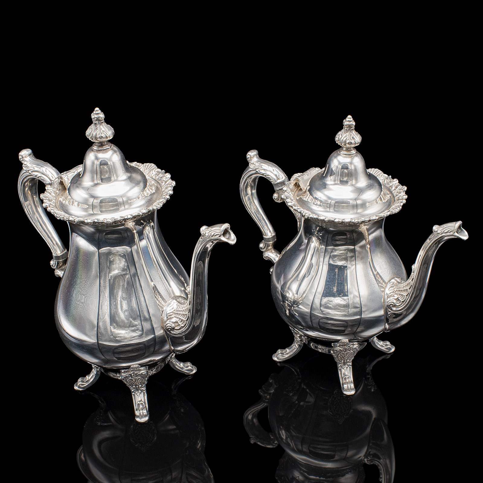 This is a vintage five piece tea service. An American, silver plated coffee and teapot set, dating to the mid 20th century, circa 1950. A charming and decorative service, displaying Baroque taste with bright silver tones and ornate engraved detail.