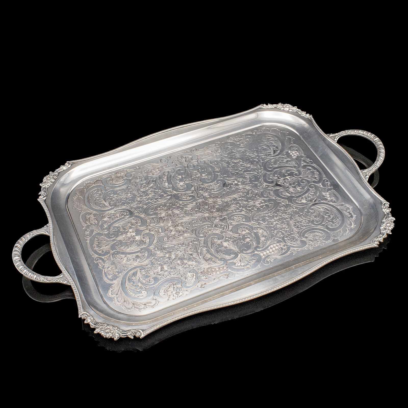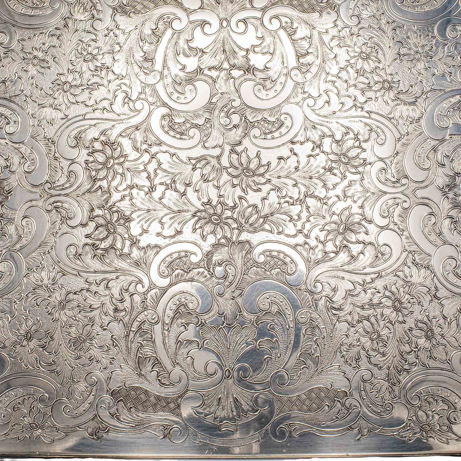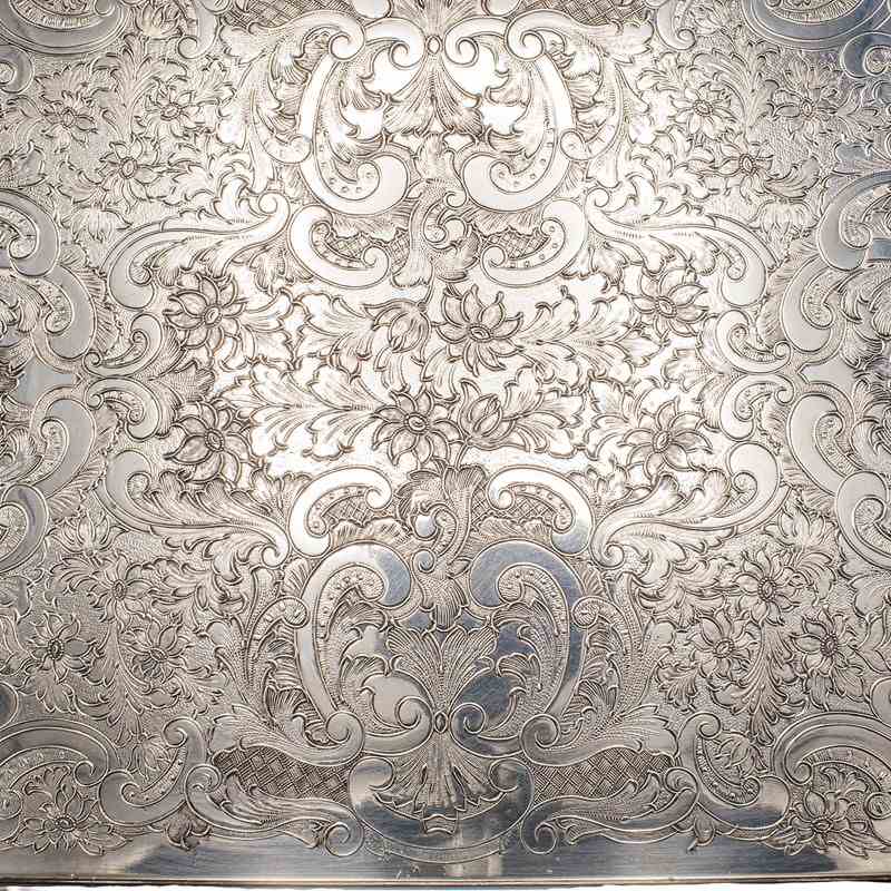 Tray adorned with profusely engraved floral scroll decoration