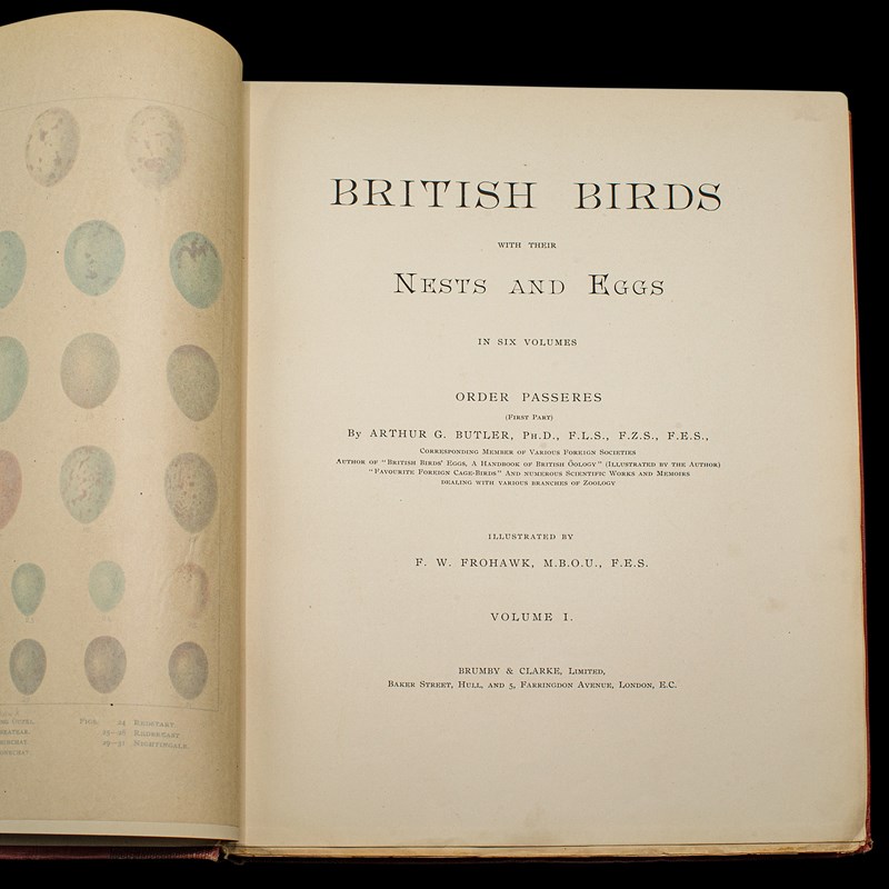 This is a superb antique set of six volumes of 'British Birds with their Eggs and Nests', authored by Arthur G. Butler and illustrated by F.W. Prohawk and dating to the late Victorian period. A charming collection of bound and illustrated avian reference books, presented in intact, original order with delightful light markings consistent with careful use.