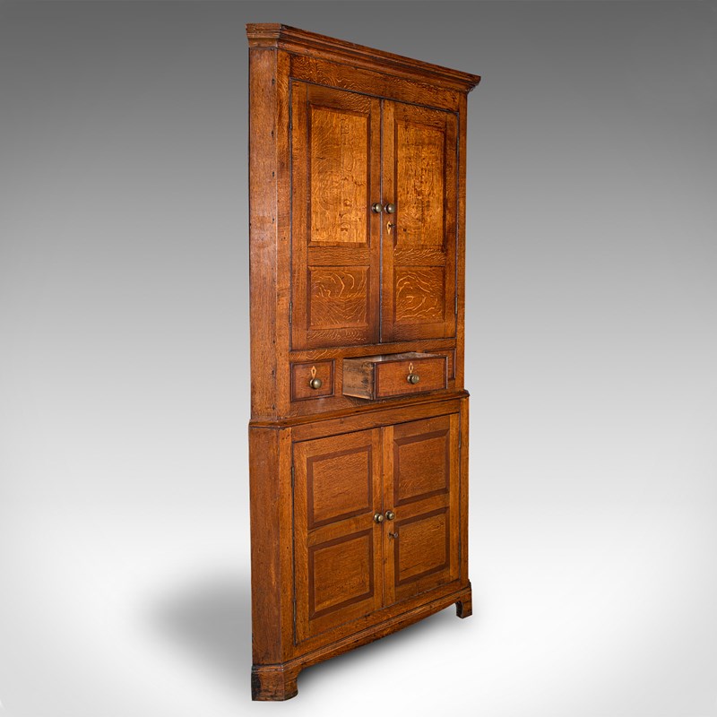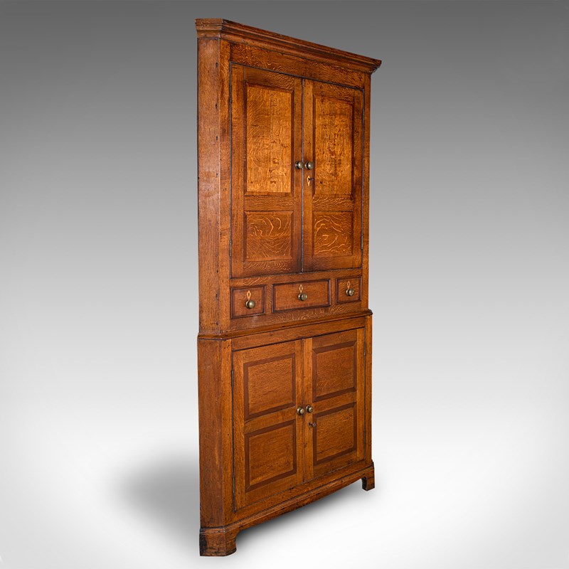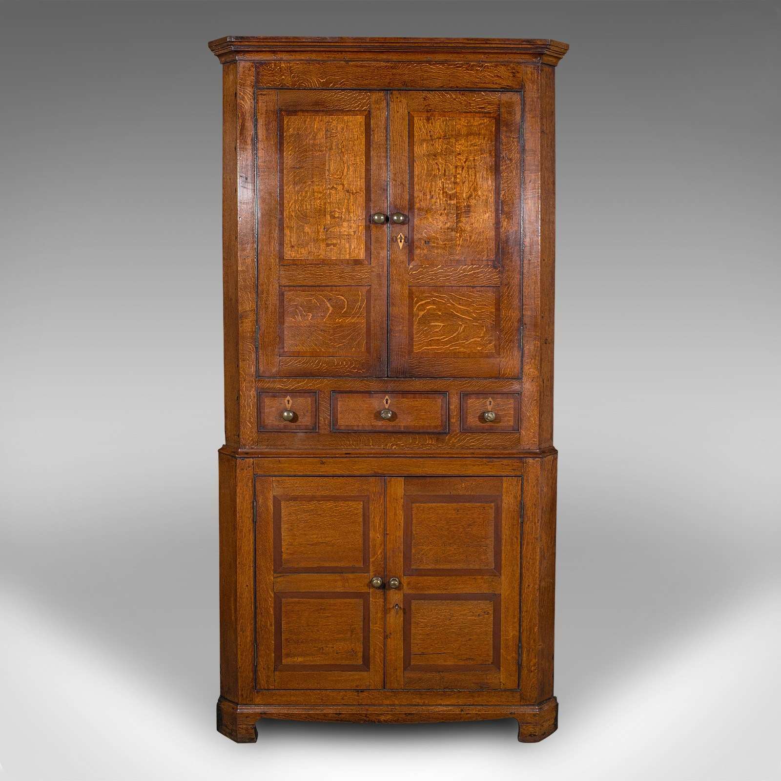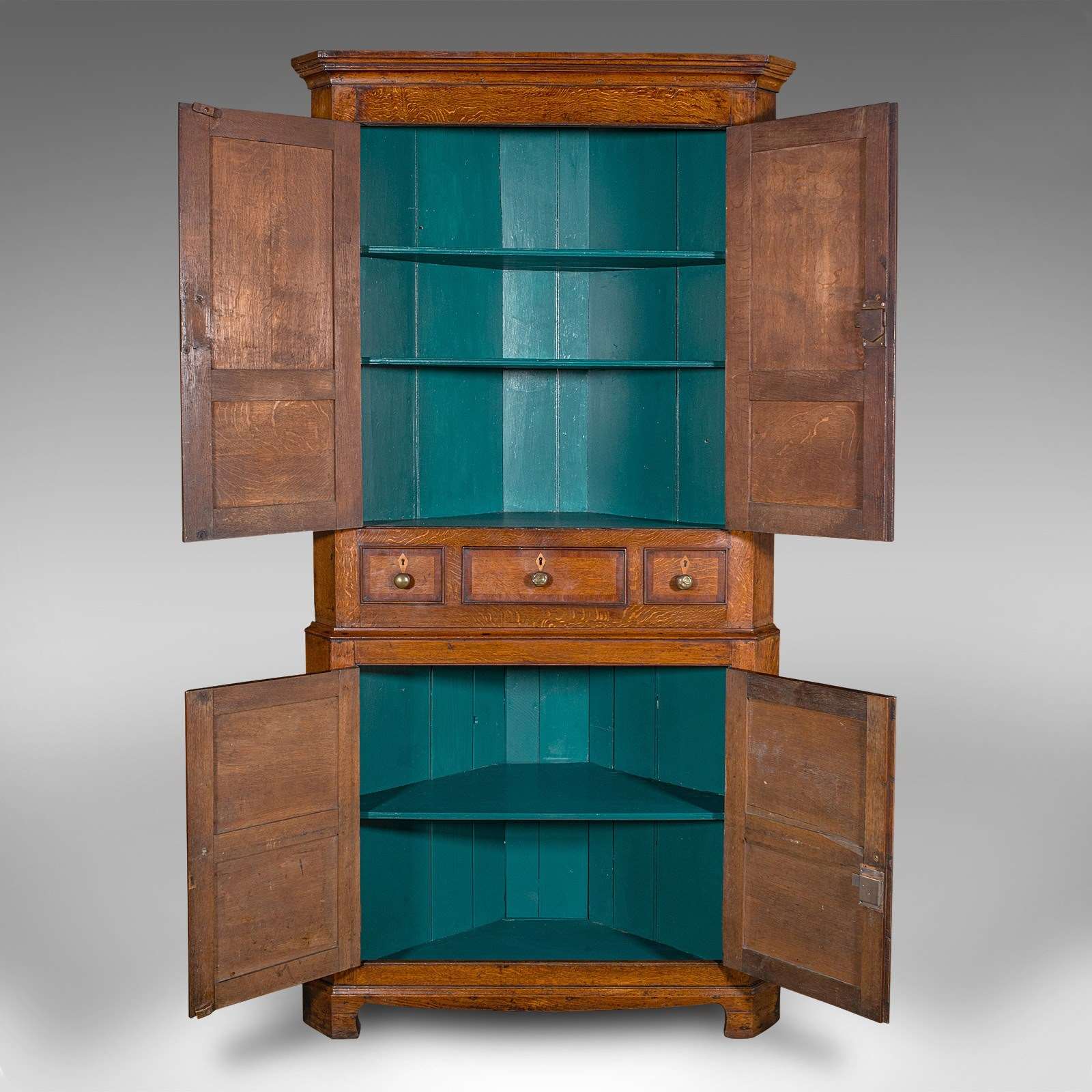 This is a 7' tall antique country manor corner cabinet. A Scottish, fine oak two-tier cupboard, dating to the Georgian period, circa 1750.