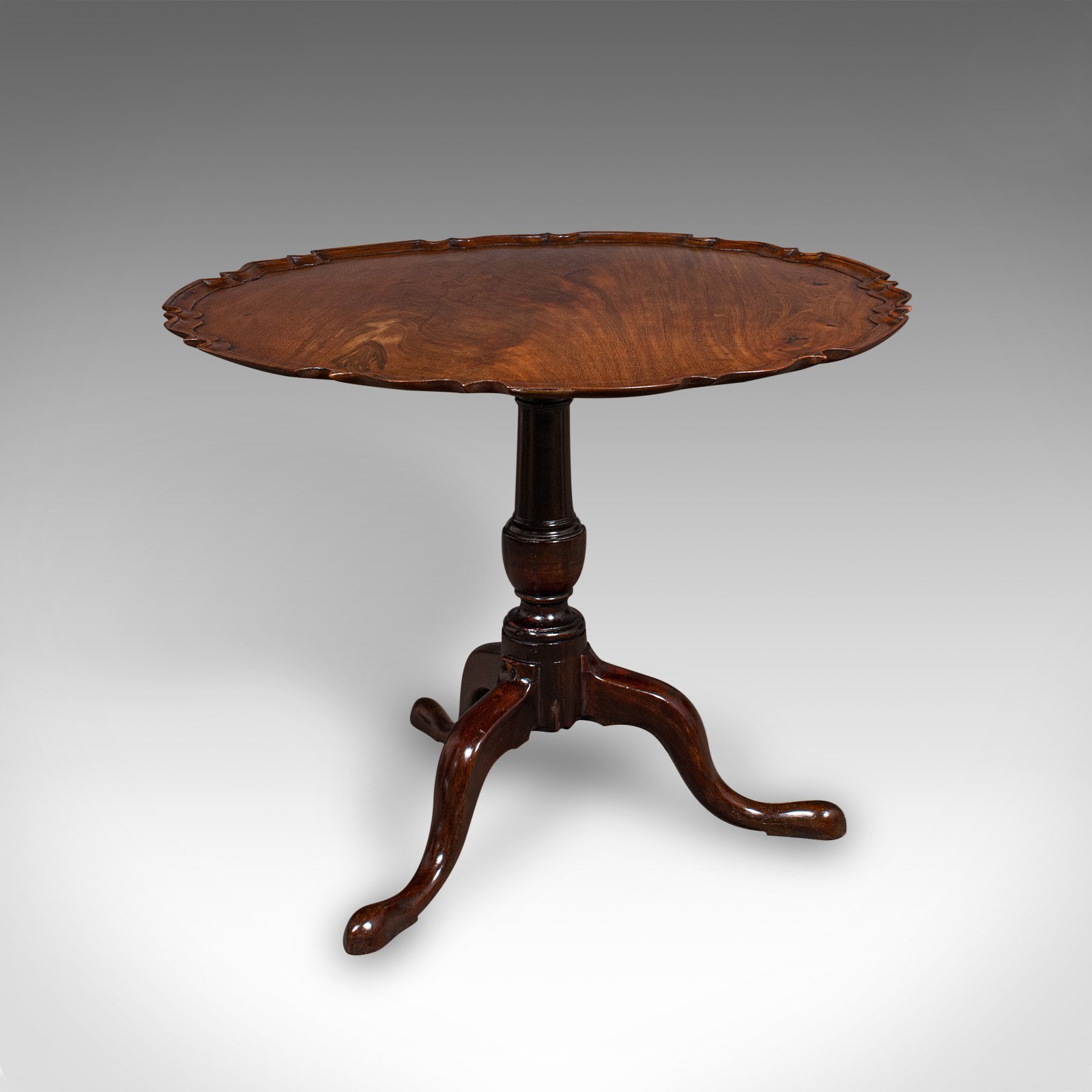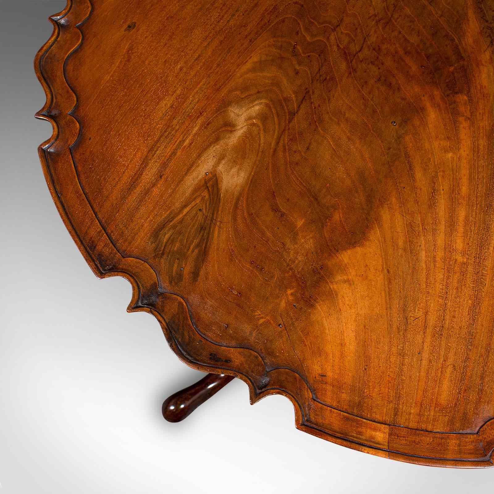 This is an antique 4 seat occasional table. An English, walnut and mahogany tilt-top pie crust serving table, dating to the Georgian period, circa 1800. A superbly crafted and generously proportioned example of fine Georgian furniture, displaying elegance and versatility.