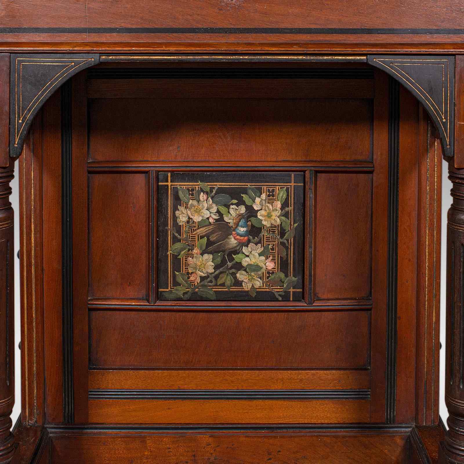 Hand-painted panels with foliate and bird detail on ebonised ground