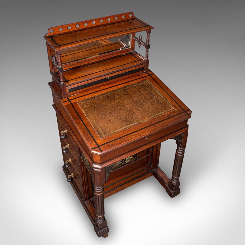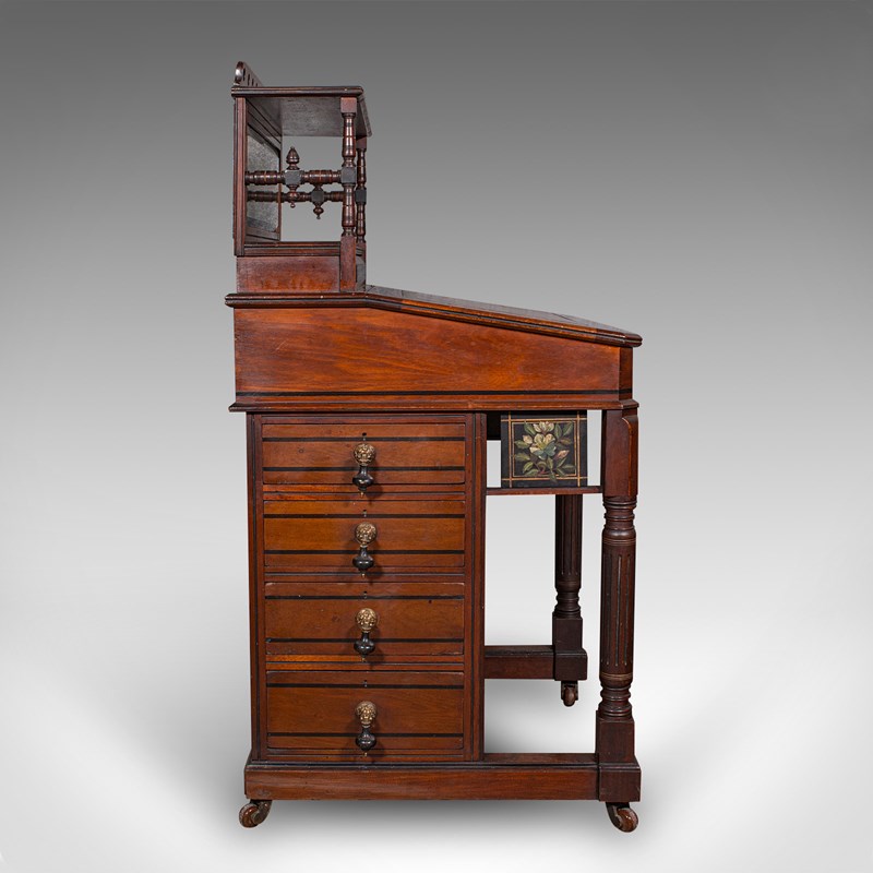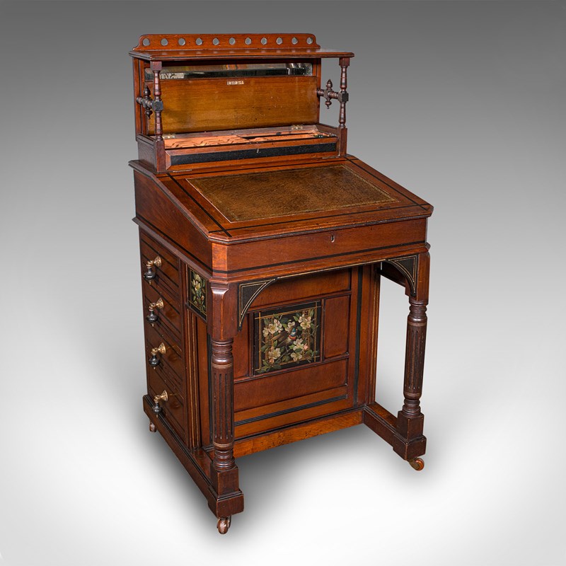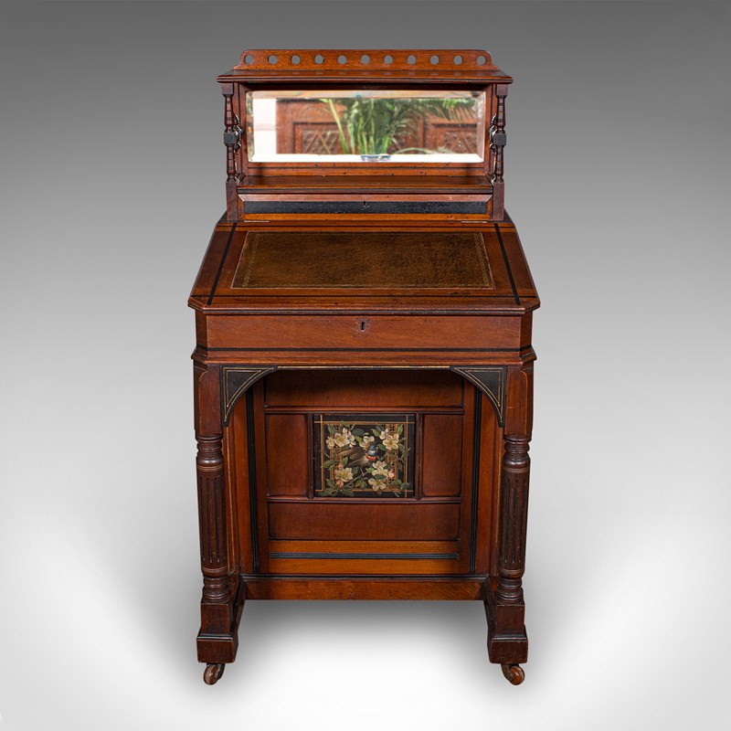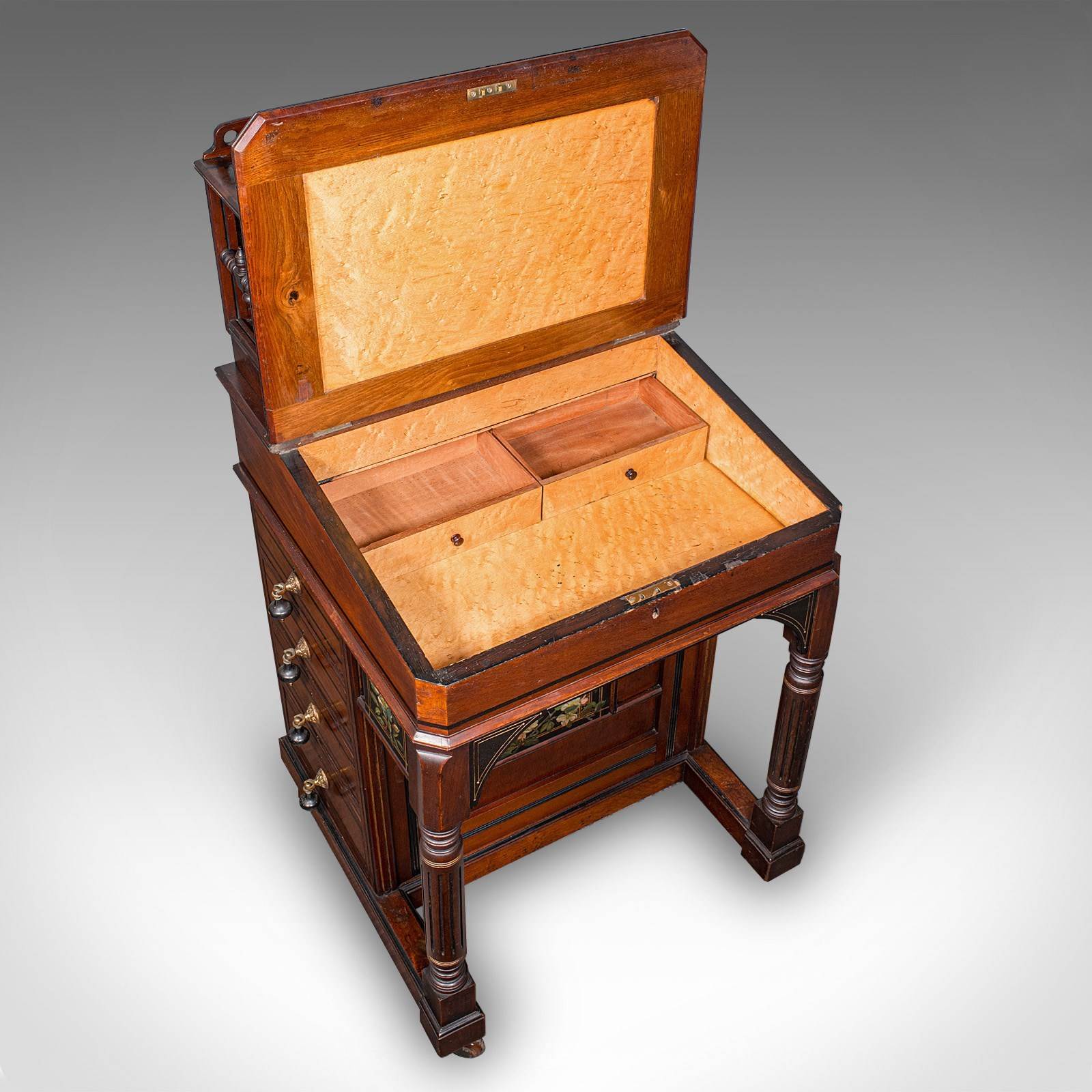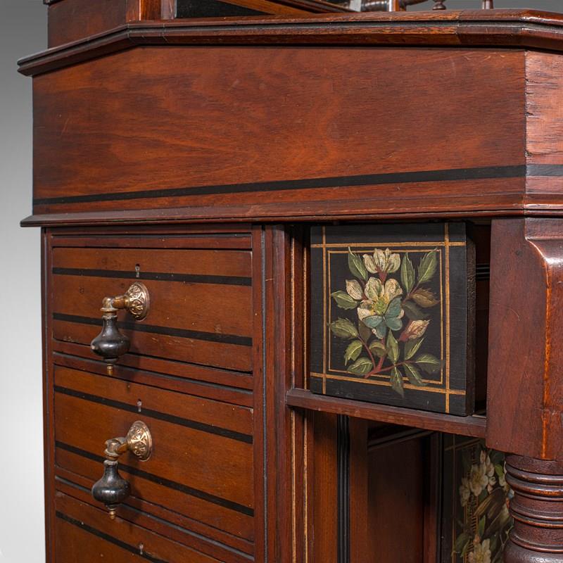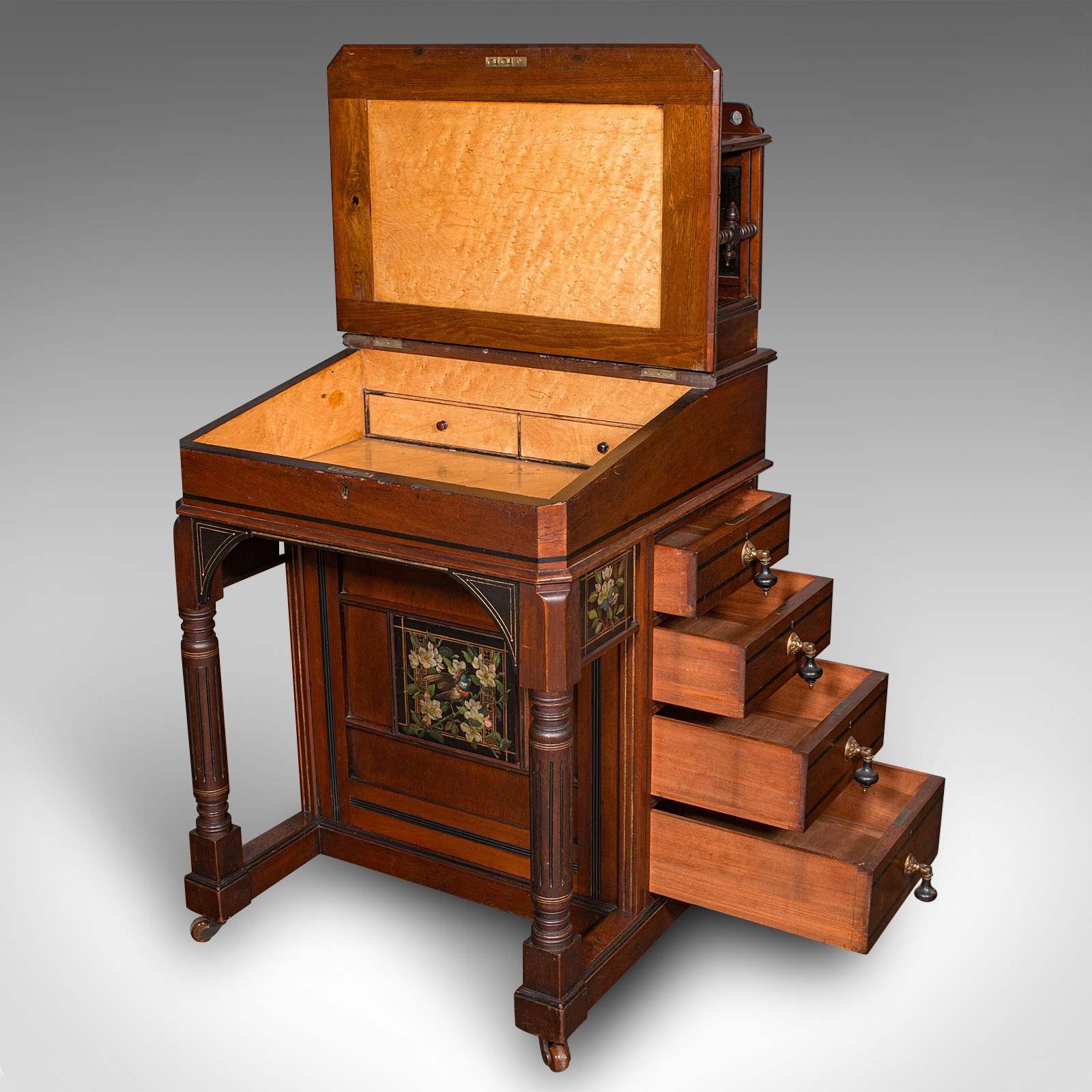 This is a striking antique Aesthetic Period Davenport, with an eye-catching decorative finish and replete with a host of delightful features. Solid joints and construction, delivered ready for the home.