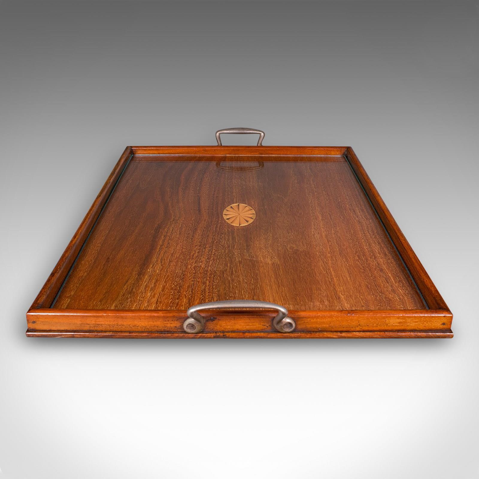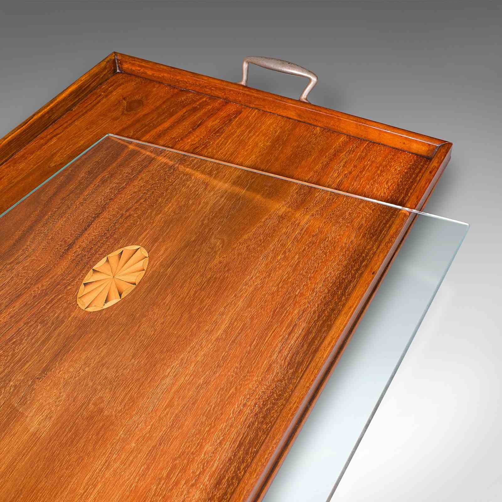 This is an antique aperitif serving tray. An English, walnut afternoon tea platter with glass top, dating to the Edwardian period, circa 1910. A fine example of Edwardian craftsmanship, offering both decorative appeal and practical serving use.